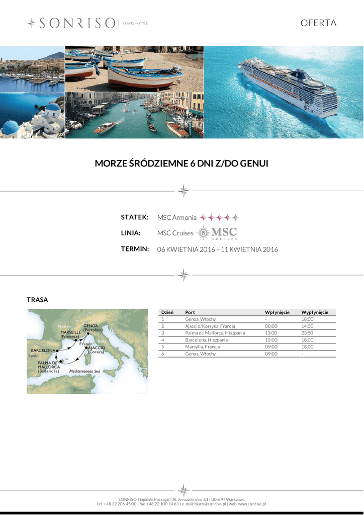 OFERTA MORZE ŚRÓDZIEMNE 6 DNI Z/DO GENUI STATEK: MSC Armonia LINIA: MSC Cruises TERMIN: 06 KWIETNIA 2016 – 11 KWIETNIA 2016 TRASA Dzień 1 2 3 4 5 6 Port Genoa, Włochy Ajaccio/Korsyka, Francja Palma de Mallorca, Hiszpania Barcelona, Hiszpania Marsylia, Francja Genoa, Włochy Wpłynięcie 08:00 13:00 10:00 09:00 09:00 SONRISO | Lipiński Passage | Al. Jero zo limskie 61 | 00-697 Warszawa tel. +48 22 206 45 00 | fax. +48 22 100 14 61 | e-mail: biuro @so nriso .pl | web: www.so nriso .pl Wypłynięcie 18:00 14:00 23:50 18:00 18:00 - OFERTA CENA Typ kabiny Cena z osobę Kabina wewnętrzna od 219 EUR Kabina z oknem od 289 EUR kabina z balkonem od 339 EUR Apartamenty od 839 EUR CENA ZAWIERA DOTATKOWE OPŁATY zakwaterowanie w 2 - os. kabinie wybranej kategorii pełne wyżywienie: 3 posiłki, przekąski między posiłakmi, bufet o północy napoje: woda stołowa, kawa, herbata oraz sok do śniadania dostępne 24 h w restauracji bufetowej oraz w restauracji głównej wyłącznie podczas śniadań serwis bagażowy podczas wejścia i zejścia ze statku 24 godzinny serwis kabinowy korzystanie z urządzeń sportowo - rekreacyjnych dostępnych na pokładzie (baseny, jacuzzi, boiska sportowe, kluby dla dzieci i młodzieży itp.) udział we wszystkich imprezach organizowanych na pokładzie (przedstawienia, pokazy, aukcje, animacje i inne) dojazd/przelot do portu rozpoczęcia i zakończenia rejsu transfery (lotnisko - port - lotnisko) ewentualne noclegi przed lub po rejsie wycieczki fakultatywne napoje: bezalkoholowe, alkoholowe, woda mineralna dostępne w restauracjach i barach (istnieje możliwość wykupienia pakietów napojów, o szczegóły zapytaj w biurze) korzystanie z mini baru w kabinie korzystanie z usług typu: SPA, salon piękności, pralnia itp. wydatki osobiste tj. zakupy w butikach, internet, kasyno itp. obowiązkowe opłaty portowe obowiązkowa opłata serwisowa (napiwki dla obsługi statku ok.8,5 EUR/os. dorosła/dzień, dzieci poniżej 3 lat nie płacą) obowiązkowe ubezpieczenie turystyczne koszt wymaganych wiz ewentualna opłata paliwowa (linia w momencie wzrotu cen ropy zastrzega sobie prawo do dodania oplaty paliwowej do każdej rezerwacji) Na życzenie świadczymy dodatkowo usługi: rezerwacje hotelowe na całym świecie rezerwacje biletów lotniczych, trasferów oraz parkingu w porcie rezerwacje wycieczek fakultatywnych i innych atrakcji SONRISO | Lipiński Passage | Al. Jero zo limskie 61 | 00-697 Warszawa tel. +48 22 206 45 00 | fax. +48 22 100 14 61 | e-mail: biuro @so nriso .pl | web: www.so nriso .pl