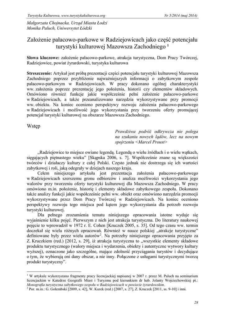 Turystyka Kulturowa, www.turystykakulturowa.org Nr 5/2014 (maj 2014) Małgorzata Chojnacka, Urząd Miasta Łodzi Monika Paluch, Uniwersytet Łódzki Założenie pałacowo-parkowe w Radziejowicach jako część potencjału turystyki kulturowej Mazowsza Zachodniego 1 Słowa kluczowe: założenie pałacowo-parkowe, atrakcja turystyczna, Dom Pracy Twórczej, Radziejowice, powiat żyrardowski, turystyka kulturowa Streszczenie: Artykuł jest próbą prezentacji części potencjału turystyki kulturowej Mazowsza Zachodniego poprzez przybliżenie najważniejszych informacji o zabytkowym zespole pałacowo-parkowym w Radziejowicach. W pracy dokonano ogólnej charakterystyki ww. założenia poprzez prezentację jego położenia, historii czy elementów składowych. Omówiono również funkcje jakie współcześnie pełni założenie pałacowo-parkowe w Radziejowicach, a także przeanalizowano narzędzia wykorzystywane przy promocji ww. obiektu. Na koniec oceniono perspektywy rozwoju założenia pałacowo-parkowego w Radziejowicach i możliwość jego wykorzystania przy tworzeniu oferty promującej potencjał turystyki kulturowej na obszarze Mazowsza Zachodniego. Wstęp Prawdziwa podróż odkrywcza nie polega na szukaniu nowych lądów, lecz na nowym spojrzeniu <Marcel Proust> „Radziejowice to miejsce owiane legendą. Legendą o wielu źródłach i o wielu wątkach, sięgających piętnastego wieku” [Skąpska 2006, s. 7]. Współcześnie znane są większości twórców i działaczy kultury z całej Polski. Często jednak nie dostrzega się ich wartości zabytkowej i roli, jaką odegrały w dziejach naszego kraju. Celem niniejszego artykułu jest prezentacja założenia pałacowo-parkowego w Radziejowicach szerszemu gronu odbiorców i analiza możliwości wykorzystania jego walorów przy tworzeniu oferty turystyki kulturowej dla Mazowsza Zachodniego. W pracy omówiono m.in. położenie, historię i elementy składowe zabytkowego zespołu. Dokonano także analizy funkcji jakie współcześnie pełni ww. obiekt oraz omówiono narzędzia promocji wykorzystywane przez Dom Pracy Twórczej w Radziejowicach. Na koniec oceniono perspektywy rozwoju tego miejsca pod kątem jego wykorzystania dla potrzeb rozwoju turystyki kulturowej. Dla pełnego zrozumienia tematu niniejszego opracowania istotne wydaje się wyjaśnienie kilku pojęć. Pierwszym z nich jest atrakcja turystyczna. Do literatury naukowej pojęcie to wprowadził w 1972 r. E. Cohen [Kruczek 2005, s. 35]. Od tego czasu ww. termin doczekał się wielu różnych opracowań. Również w nauce polskiej „atrakcje turystyczne” definiowane były przez wielu autorów2. Na potrzeby niniejszego opracowania przyjęto za Z. Kruczkiem (red.) [2012, s. 29], iż atrakcja turystyczna to „wszystkie elementy składowe produktu turystycznego (walory miejsca i wydarzenia, obiekty i autentyczne wytwory kultury wyższej), oznaczone jako szczególne, mające zdolność przyciągania turystów i decydujące o tym, że wybierają oni dany obszar, a nie inny. Połączone z usługami turystycznymi tworzą produkt turystyczny”. 1 W artykule wykorzystano fragmenty pracy licencjackiej napisanej w 2007 r. przez M. Paluch na seminarium licencjackim w Katedrze Geografii Miast i Turyzmu pod kierunkiem dr hab. Jolanty Wojciechowskiej pt.: Monografia turystyczna zabytkowego zespołu w Radziejowicach w powiecie żyrardowskim. 2 Por. m.in.: G. Gołembski [2009, s. 42], W. Kurek (red.) [2007, s. 27], Z. Kruczek [2011, ss. 9-10] i inni. 28 Turystyka Kulturowa, www.turystykakulturowa.org Nr 5/2014 (maj 2014) Za turystykę kulturową uznano „wszystkie grupowe lub indywidualne wyprawy o charakterze turystycznym, w których spotkanie uczestników podróży z obiektami, wydarzeniami i innymi walorami kultury wysokiej lub popularnej albo powiększenie ich wiedzy o organizowanym przez człowieka świecie otaczającym jest zasadniczą częścią programu podróży lub stanowi rozstrzygający argument dla indywidualnej decyzji o jej podjęciu lub wzięciu w niej udziału [Mikos von Rohrscheidt 2008a, s. 31]. Kolejnymi pojęciami, na które warto zwrócić uwagę są: Dom Pracy Twórczej, dostępność komunikacyjna, dwór, pałac, park, zespół zabytkowy. Ich definicje przedstawiają się następująco: Dom Pracy Twórczej (DPT) – jest instytucją kultury posiadającą osobowość prawną i podlega wpisowi do rejestru narodowych instytucji kultury prowadzonego przez Ministra Kultury i Sztuki [Statut DPT w Radziejowicach 1994, s. 1]; dostępność komunikacyjna określonego terenu to istniejący system połączeń komunikacyjnych między tym terenem, a miejscami stałego zamieszkania potencjalnych turystów [Rogalewski 1977]; dwór – typowy budynek mieszkalny, ukształtowany w okresie klasycyzmu, o jednej lub dwóch kondygnacjach z portykiem wejściowym na osi, nad którym mieści się balkon lub facjatka; w rzucie poziomym oś symetrii przechodzi przez portyk (z parzystą liczbą kolumn), sień i salę, wystającą poza obrys rzutu; pokoje i sypialnie rozlokowane są po obu stronach osi a na poddasze lub piętro prowadzą schody umieszczone z boku sieni [Krajewski 1974, ss. 223-224]; pałac – reprezentacyjna budowla mieszkalna pozbawiona cech obronnych, także określenie dla bardziej okazałych gmachów użyteczności publicznej i urzędów [Krajewski 1974, s. 331]; park – m.in. ogród lub plac zadrzewiony ze ścieżkami spacerowymi i ławeczkami [Krajewski 1974, s. 333]; zespół zabytkowy – jest to zgrupowanie w kilku obiektach zabytków różnego rodzaju; typowymi zespołami zabytkowymi są np. Łańcut – zamek, fortyfikacje, muzeum wnętrz, park, muzeum powozów itd., Nieborów – pałac, park, muzeum wnętrz itd. [Rogalewski 1977]. Podstawą do napisania artykułu była kwerenda różnego rodzaju publikacji dotyczących zabytkowego zespołu pałacowo-parkowego w Radziejowicach (publikacje książkowe, foldery, broszury, katalogi powystawowe, artykuły itp.). Anali