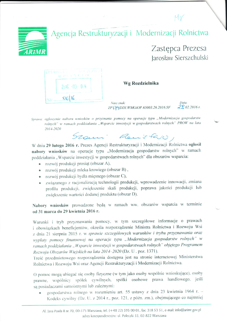 \\'dniu 29 lutego 20l6 r. l)rezes Agencji Restrukturyzacji i Modernizacji Rolnictrva oglosil