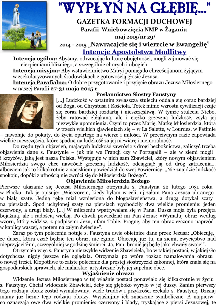 "WYPŁYŃ NA GŁĘBIĘ..." GAZETKA FORMACJI DUCHOWEJ Parafii Wniebowzięcia NMP w Żaganiu maj 2015/nr 29/ 2014 - 2015 „Nawracajcie się i wierzcie w Ewangelię” Intencje Apostolstwa Modlitwy Intencja ogólna: Abyśmy, odrzucając kulturę obojętności, mogli zajmować się cierpieniami bliźniego, a szczególnie chorych i ubogich. Intencja misyjna: Aby wstawiennictwo Maryi pomagało chrześcijanom żyjącym w zsekularyzowanych środowiskach z gotowością głosić Jezusa. Intencja Parafialna: O dobre przygotowanie i przyjęcie obrazu Jezusa Miłosiernego w naszej Parafii 27-31 maja 2015 r. Posłannictwo Siostry Faustyny […] Ludzkość w ostatnim zwłaszcza stuleciu oddala się coraz bardziej od Boga, od Chrystusa i Kościoła. Toteż mimo wzrostu cywilizacji czuje się coraz bardziej rozdartą i nieszczęśliwą. W tymże stuleciu Niebo, żeby ratować zbłąkaną, ale i ciężko grzeszną ludzkość, zsyła jej niezwykłe upomnienia. Czyni to przez Marię, Matkę Miłosierdzia, która w trzech wielkich zjawieniach się – w La Salette, w Lourdes, w Fatimie – nawołuje do pokuty, do życia opartego na wierze i miłości. W przeciwnym razie zapowiada wielkie nieszczęścia, które spadną na ludzkość za jej niewiarę i niemoralność. Do rzędu tych objawień, mających ludzkość zawrócić z drogi bezbożnictwa, zaliczyć trzeba objawienia dane s. Faustynie – już nie we Francji czy w Portugalii – ale w ziemi mogił i krzyżów, jaką jest nasza Polska. Występuje w nich sam Zbawiciel, który nowym objawieniem Miłosierdzia swego chce nawrócić grzeszną ludzkość, odciągnąć ją od dróg zatracenia… albowiem jak to kilkakrotnie z naciskiem powiedział do swej Powiernicy: „Nie znajdzie ludzkość spokoju, dopóki z ufnością nie zwróci się do Miłosierdzia Bożego”. Objawienie Miłosierdzia Bożego Pierwsze ukazanie się Jezusa Miłosiernego otrzymała s. Faustyna 22 lutego 1931 roku w Płocku. Tak je opisuje: „Wieczorem, kiedy byłam w celi, ujrzałam Pana Jezusa ubranego w białą szatę. Jedną rękę miał wzniesioną do błogosławieństwa, a drugą dotykał szaty na piersiach. Spod uchylonej szaty na piersiach wychodziły dwa wielkie promienie: jeden czerwony, a drugi biały. […] W milczeniu wpatrywałam się w Pana. Dusza moja była przejęta bojaźnią, ale i radością wielką. Po chwili powiedział mi Pan Jezus: «Wymaluj obraz według wzoru, który widzisz, z podpisem: Jezu, ufam Tobie. Pragnę, aby ten obraz czczono naprzód w kaplicy waszej, a potem na całym świecie»”. Zaraz po tym poleceniu notuje s. Faustyna dwie obietnice dane przez Jezusa: „Obiecuję, że dusza, która czcić będzie ten obraz, nie zginie. Obiecuję już tu, na ziemi, zwycięstwo nad nieprzyjaciółmi, szczególniej w godzinę śmierci. Ja, Pan, bronić jej będę jako chwały swojej”. Otrzymała więc s. Faustyna niezwykłe widzenie Zbawiciela, bo w takiej postaci, w jakiej Go dotychczas nigdy jeszcze nie oglądała. Otrzymała po wtóre rozkaz namalowania obrazu o nowej treści. Kłopotliwe to zaiste polecenie dla prostej siostrzyczki zakonnej, która znała się na gospodarskich sprawach, ale malarskie, artystyczne były jej zupełnie obce. Wyjaśnienie obrazu Widzenie Jezusa Miłosiernego w tej właśnie postaci ponawiało się kilkakrotnie w życiu s. Faustyny. Chciał widocznie Zbawiciel, żeby się głęboko wyryło w jej duszy. Zanim pierwszy tego rodzaju obraz został wymalowany, wiele trudów i przykrości czekało s. Faustynę. Dzisiaj mamy już liczne tego rodzaju obrazy. Wyjaśnijmy ich znaczenie symboliczne. A najpierw co oznaczają owe dwa wielkie promienie: czerwony i blady, tryskające z piersi Jezusowej, te promienie, po których wszyscy odtąd poznawać będą, że mają przed sobą obraz Miłosierdzia Bożego. Gdy s. Faustyna na polecenie spowiednika zapytała o to, takie otrzymała na modlitwie wyjaśnienie: „Promienie na obrazie oznaczają krew i wodę, które wytrysły z wnętrza Miłosierdzia mego, wówczas kiedy konające Serce moje zostało włócznią otwarte na krzyżu. Blady promień oznacza wodę, która usprawiedliwia dusze. Czerwony oznacza krew, która jest życiem duszy. Promienie te osłaniają dusze przed zagniewaniem Ojca mego… Szczęśliwy, kto w ich cieniu żyć będzie, bo nie dosięgnie go sprawiedliwa ręka Boża”. Podczas swej Męki wylał Zbawiciel za nas niemal wszystką krew swoją. Pozostała jeszcze w konającym Sercu Jego. Dopuszcza więc, by włócznia otwarła to Najświętsze Serce: wypływa wtedy z niego krew aż do ostatniej kropli, a z nią woda. Chce Zbawiciel, żeby ten wzruszający objaw jego miłości był w szczególniejszy sposób czczony w nabożeństwie do Miłosierdzia Bożego. Dlatego polecił s. Faustynie napisać to krótkie westchnienie i często się nim posługiwać: „O Krwi i Wodo, któraś wytrysnęła z Serca Jezusowego, jako zdrój Miłosierdzia dla nas, ufam Tobie”. Choć te dwa promienie są najbardziej charakterystycznym rysem obrazu Miłosierdzia Bożego, inne szczegóły podkreślają również na swój sposób Miłosierdzie, którym Jezus chce pociągnąć dusze ku sobie. I tak, Zbawiciel na tym obrazie nie unosi się jako Pan i Sędzia w obłokach, ale idzie po tej biednej ziemi naszej, której mieszkańcom chce świadczyć Miłosierdzie swoje. Obie ręce Jezusowe służą również idei Miłosierdzia. Lewa wskazuje na pierś, na Serce, czyli na źródło Miłosierdzia, wprowadza nas w samo jego wnętrze. Prawicę zaś swoją wznosi Zbawiciel w górę nie po to, by grozić i karać, ale by tym wszystkim, co się będą do jego Miłosierdzia uciekać, jeszcze hojniej odtąd błogosławić. Cóż powiedzieć o białej szacie bez płaszcza, bo tak się ukazał Miłosierny Jezus s. Faustynie. Czy to ma być symbol czystości serca, której ludzkość zarażona bezbożnictwem i splugawiona rozpustą tak bardzo potrzebuje? Owszem, może i to oznaczać, ale nasuwa się tu inna m