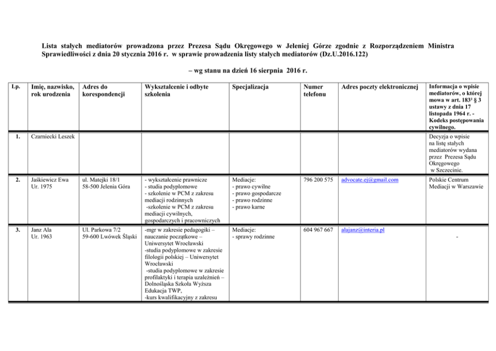 Lista stałych mediatorów prowadzona przez Prezesa Sądu Okręgowego w Jeleniej Górze zgodnie z Rozporządzeniem Ministra Sprawiedliwości z dnia 20 stycznia 2016 r. w sprawie prowadzenia listy stałych mediatorów (Dz.U.2016.122) – wg stanu na dzień 16 sierpnia 2016 r. Lp. Imię, nazwisko, rok urodzenia 1. Czarniecki Leszek 2. Jaśkiewicz Ewa Ur. 1975 ul. Matejki 18/1 58-500 Jelenia Góra - wykształcenie prawnicze - studia podyplomowe - szkolenie w PCM z zakresu mediacji rodzinnych -szkolenie w PCM z zakresu mediacji cywilnych, gospodarczych i pracowniczych Mediacje: - prawo cywilne - prawo gospodarcze - prawo rodzinne - prawo karne 796 200 575 [email protected] 3. Janz Ala Ur. 1963 Ul. Parkowa 7/2 59-600 Lwówek Śląski -mgr w zakresie pedagogiki – nauczanie początkowe – Uniwersytet Wrocławski -studia podyplomowe w zakresie filologii polskiej – Uniwersytet Wrocławski -studia podyplomowe w zakresie profilaktyki i terapia uzależnień – Dolnośląska Szkoła Wyższa Edukacja TWP, -kurs kwalifikacyjny z zakresu Mediacje: - sprawy rodzinne 604 967 667 [email protected] Adres do korespondencji Wykształcenie i odbyte szkolenia Specjalizacja Numer telefonu Adres poczty elektronicznej Informacja o wpisie mediatorów, o której mowa w art. 183² § 3 ustawy z dnia 17 listopada 1964 r. Kodeks postępowania cywilnego. Decyzja o wpisie na listę stałych mediatorów wydana przez Prezesa Sądu Okręgowego w Szczecinie. Polskie Centrum Mediacji w Warszawie - organizacji i zarządzania oświatą – DODN we Wrocławiu filia w Wałbrzychu, -kurs kwalifikacyjny z pedagogiki specjalnej w zakresie oligofrenopedagogiki: Wojewódzki Ośrodek Metodyczny w Jeleniej Górze -szkolenie dla mediatorów : Polskie Centrum Mediacji w Warszawie 4. 5. 6. Mormul Izabela Ur. 1973 ul. Kazimierza Wielkiego 16/3 59-800 Lubań - wykształcenie mgr politologii – Uniwersytet Wrocławski - szkolenie Ośrodek Mediacji Fundacji Wydziału Praw i Administracji Uniwersytetu Śląskiego ”Facultas Iuridica” Mediacje: - prawo cywilne - prawo gospodarcze - prawo rodzinne - prawo pracy 696 417 774 Musiałowska Alina Ur. 1955 Ul. Juliana Fałata 4 58-560 Jelenia Góra - Akademia Ekonomiczna Wrocław- mgr inż. ekonomiki i organizacji przemysłu ekonomicznego -Wałbrzyska Wyższa Szkoła Zarządzania i Przedsiębiorczości - Studia Podyplomowe – zarzadzanie i marketing, -Kurs likwidatorów przedsiębiorstw państwowych, - Studium „Mediator Sądowy” Mediacje: - sprawy gospodarcze - cywilne 601 993 499 Róg Anna Ur. 1975r. ul. Graniczna 37 58- 560 Jelenia Góra - wykształcenie wyższe mgr administracji: Uniwersytet Wrocławski Wydział Prawa, Administracji i Ekonomii, - Certyfikat Krajowego Centrum Mediacji potwierdzający odbycie profesjonalnego szkolenia i treningu mediatorów w wymiarze 40 godzin warsztatowych i Mediacje: - prawo cywilne, - prawo gospodarcze, - prawo pracy, - prawo rodzinne, - spory zbiorowe 796 779 799 [email protected] - [email protected] - [email protected] Krajowe Centrum Mediacji, Stowarzyszenie Mediatorów Polskich, Polska Izba Mediacji wykładowych (zaświadczenie nr ENMA-SM 815/2011); - Dyplom potwierdzający odbycie specjalistycznych 20 godzinnych warsztatów na temat konstruowania ugód (zaświadczenie ENMA-UG 220.2011) 7. Róg Piotr Ur. 1972r. Ul. Graniczna 37, 58 – 560 Jelenia Góra - wykształcenie wyższe mgr prawa, Uniwersytet Wrocławski Wydział Prawa i Administracji , - Certyfikat Krajowego Centrum Mediacji potwierdzający odbycie profesjonalnego szkolenia i treningu mediatorów w wymiarze 40 godzin warsztatowych i wykładowych; - Dyplom potwierdzający odbycie specjalistycznych 20 godzinnych warsztatów na temat konstruowania ugód Mediacje: - prawo cywilne, - prawo gospodarcze, - prawo pracy, - prawo rodzinne, - spory zbiorowe 796 455 445 [email protected] Krajowe Centrum Mediacji, Stowarzyszenie Mediatorów Polskich, Polska Izba Mediacji 8. Rudek Katarzyna Ur. 1969r. ul. Różana 50 59 – 800 Lubań - Studia podyplomowe w zakresie Mediator, - Uniwersytet Ekonomiczny we Wrocławiu wydział Zarządzania, Informatyki i Finansów Mediacje: - cywilne, - w sprawach karnych, - w sprawach nieletnich 798 429 386 [email protected] Stowarzyszenie Mediatorów Polskich 7. Schneider Marzena Ur. 1977 ul. Matejki 18/1 58-500 Jelenia Góra - wykształcenie prawnicze - studia podyplomowe - szkolenie w PCM z zakresu mediacji rodzinnych -szkolenie w PCM z zakresu mediacji cywilnych, gospodarczych i pracowniczych Mediacje: - prawo cywilne - prawo gospodarcze - prawo rodzinne 889 191 316 marzena.schneider@adwokatura. pl Polskie Centrum Mediacji w Warszawie 8. StelągowskaKurczyn Dorota , Adwokat, Ur. 1978r. Al. Wojska Polskiego 77a/3, 58 – 500 Jelenia Góra - Uniwersytet im.Adama Mickiewicza w Poznaniu w Poznaniu, Wydział Prawa, Mgr prawa, Mediacje: - cywilne, - gospodarcze, - praca, 605 245 648 [email protected] Centrum Mediacyjne przy Naczelnej Radzie Adwokackiej w Warszawie - Uniwersytet Europejski „VIADRINA”we Frankfurcie nad Odrą, Magister Legum LL.M., - Aplikacja radcowska przy OIRP w Wałbrzychu, radca prawny, - IV szkolenie zawodowe mediatorów – Centrum Mediacyjne przy Naczelnej Radzie Adwokackiej w Warszawie. - budowlane, - nieruchomości, - ubezpieczeniowe.