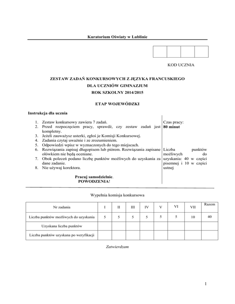 Kuratorium Oświaty w Lublinie KOD UCZNIA ZESTAW