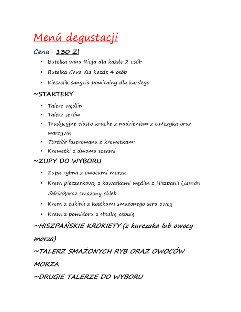 Menú degustacji Cena- 130 Zl • Butelka wina Rioja dla każde 2 osób • Butelka Cava dla każde 4 osób • Kieszelik sangría powitalny dla każdego ~STARTERY • Talerz wędlin • Talerz serów • Tradycyjne ciasto kruche z nadzieniem z tuńczyka oraz warzywa • Tortilla faserowana z krewetkami • Krewetki z dwoma sosami ~ZUPY DO WYBORU • Zupa rybna z owocami morza • Krem pieczarkowy z kawałkami wędlin z Hiszpanii (jamón ibérico)oraz smażony chleb • Krem z cukinii z kostkami smażonego sera owcy • Krem z pomidoru z słodką cebulą ~HISZPAŃSKIE KROKIETY (z kurczaka lub owocy morza) ~TALERZ SMAŻONYCH RYB ORAZ OWOCÓW MORZA ~DRUGIE TALERZE DO WYBORU • Antrykot z byka na patelnii (z ziemniakami, czosnkiem oraz „wylewkimi” jajkami) • Żabnica „a la Vasca” (z cebulą, czosnkiem, szpargiem, jajkiem oraz małżem • Paella lub Fideua z owoców morza ~DESERTY DO WYBORU • Jabłecznik z karamelem • Sernik z dżemem • San Marcos • Ciasto z Segovii