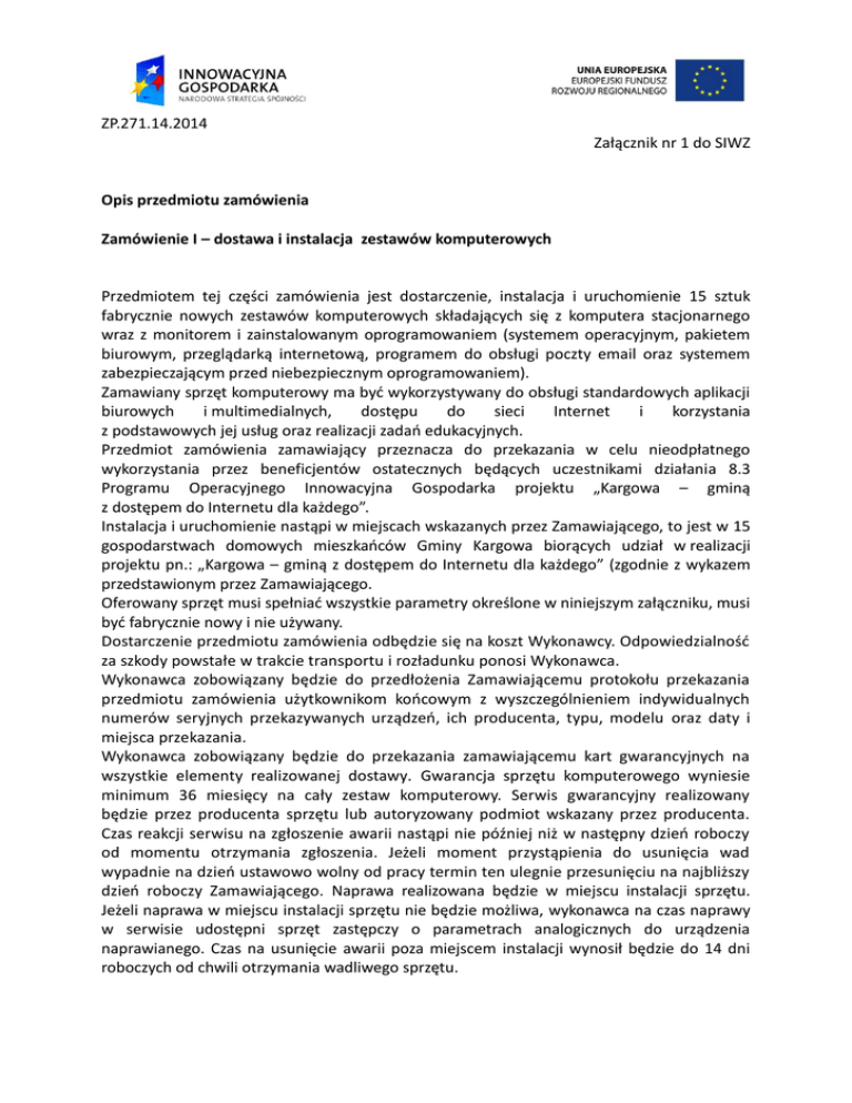ZP.271.14.2014 Załącznik nr 1 do SIWZ Opis przedmiotu zamówienia Zamówienie I – dostawa i instalacja zestawów komputerowych Przedmiotem tej części zamówienia jest dostarczenie, instalacja i uruchomienie 15 sztuk fabrycznie nowych zestawów komputerowych składających się z komputera stacjonarnego wraz z monitorem i zainstalowanym oprogramowaniem (systemem operacyjnym, pakietem biurowym, przeglądarką internetową, programem do obsługi poczty email oraz systemem zabezpieczającym przed niebezpiecznym oprogramowaniem). Zamawiany sprzęt komputerowy ma być wykorzystywany do obsługi standardowych aplikacji biurowych i multimedialnych, dostępu do sieci Internet i korzystania z podstawowych jej usług oraz realizacji zadań edukacyjnych. Przedmiot zamówienia zamawiający przeznacza do przekazania w celu nieodpłatnego wykorzystania przez beneficjentów ostatecznych będących uczestnikami działania 8.3 Programu Operacyjnego Innowacyjna Gospodarka projektu „Kargowa – gminą z dostępem do Internetu dla każdego”. Instalacja i uruchomienie nastąpi w miejscach wskazanych przez Zamawiającego, to jest w 15 gospodarstwach domowych mieszkańców Gminy Kargowa biorących udział w realizacji projektu pn.: „Kargowa – gminą z dostępem do Internetu dla każdego” (zgodnie z wykazem przedstawionym przez Zamawiającego. Oferowany sprzęt musi spełniać wszystkie parametry określone w niniejszym załączniku, musi być fabrycznie nowy i nie używany. Dostarczenie przedmiotu zamówienia odbędzie się na koszt Wykonawcy. Odpowiedzialność za szkody powstałe w trakcie transportu i rozładunku ponosi Wykonawca. Wykonawca zobowiązany będzie do przedłożenia Zamawiającemu protokołu przekazania przedmiotu zamówienia użytkownikom końcowym z wyszczególnieniem indywidualnych numerów seryjnych przekazywanych urządzeń, ich producenta, typu, modelu oraz daty i miejsca przekazania. Wykonawca zobowiązany będzie do przekazania zamawiającemu kart gwarancyjnych na wszystkie elementy realizowanej dostawy. Gwarancja sprzętu komputerowego wyniesie minimum 36 miesięcy na cały zestaw komputerowy. Serwis gwarancyjny realizowany będzie przez producenta sprzętu lub autoryzowany podmiot wskazany przez producenta. Czas reakcji serwisu na zgłoszenie awarii nastąpi nie później niż w następny dzień roboczy od momentu otrzymania zgłoszenia. Jeżeli moment przystąpienia do usunięcia wad wypadnie na dzień ustawowo wolny od pracy termin ten ulegnie przesunięciu na najbliższy dzień roboczy Zamawiającego. Naprawa realizowana będzie w miejscu instalacji sprzętu. Jeżeli naprawa w miejscu instalacji sprzętu nie będzie możliwa, wykonawca na czas naprawy w serwisie udostępni sprzęt zastępczy o parametrach analogicznych do urządzenia naprawianego. Czas na usunięcie awarii poza miejscem instalacji wynosił będzie do 14 dni roboczych od chwili otrzymania wadliwego sprzętu. Zamawiający otrzyma od wykonawcy komplet licencji na zainstalowane oprogramowanie na dostarczanych zestawach komputerowych. Licencja na oprogramowanie przekazane zamawiającemu powinna zawierać koszty Licencji Praw Najmu (Rental Rights lub Lease Agreement) oraz umożliwić zamawiającemu przekazanie w formie użyczenia komputerów z oprogramowaniem beneficjentom końcowym (15 osobom fizycznym) z poszanowaniem praw licencyjnych oraz praw autorskich producenta oprogramowania. Opis sprzętu komputerowego Typ Przeznaczenie i zastosowanie Wydajność obliczeniowa Pamięć RAM Dysk twardy Napęd optyczny Multimedia – dźwięk Klawiatura Mysz Komputer stacjonarny Przedmiot zamówienia jest przeznaczony do przekazania w celu nieodpłatnego wykorzystania przez beneficjentów ostatecznych tj. - gospodarstwa domowe mieszkańców Gminy Kargowa będących uczestnikami działania 8.3 POIG projektu Przeciwdziałanie wykluczeniu cyfrowemu – eInclusion w celach niekomercyjnych. Komputer będzie wykorzystywany w następujących zakresach dziedzinowych: 1. Standardowe aplikacje biurowe i multimedialne. 2. Dostęp do Internetu. 3. Potrzeby edukacyjne Komputer powinien osiągać w teście wydajności Sysmark 2012 • Rating – co najmniej wynik 140 punktów, • Media Creation– co najmniej wynik 132 punktów, • 3D Modeling – co najmniej wynik 133 punktów, • System Management - co najmniej wynik 143 punktów. Dokumentem potwierdzającym spełnianie ww. wymagań będzie dołączony do oferty wydruk z przeprowadzonego testu, potwierdzony za zgodność z oryginałem przez Wykonawcę lub wydruk ze strony http://www.bapco.com/support/fdrs/SYSmark2012web.html. Minimum 8192 MB, możliwość rozbudowy do minimum 16000 MB Minimum 500 GB. Nagrywarka DVD+/-RW DualLayer Głośnik : Liczba głośników min. 3 szt. Liczba głośników satelitarnych max .2 szt. Głośnik niskotonowy min. 1 szt. Moc głośników satelitarnych min. 18 Wat Moc głośnika niskotonowego min. 20 Wat Głośnik współpracujący z kartą muzyczną zainstalowany w komputerze Klawiatura USB, układ Qwerty (polski programistyczny) Mysz optyczna USB z dwoma przyciskami i jedną rolką oraz podkładka pod mysz. System operacyjny 1. Zainstalowany i skonfigurowany system operacyjny zapewniający prawidłowa prace zestawu komputerowego, kompatybilny z wszystkimi komponentami i technologiami zastosowanymi w powyższym zestawie komputerowym. 2. System w polskiej wersji językowej. 3. Automatyczna aktualizacja systemu operacyjnego z wykorzystaniem technologii internetowej z możliwością wyboru instalowanych poprawek w języku polskim. 4. Darmowe aktualizacje: niezbędne aktualizacje, poprawki, biuletyny bezpieczeństwa muszą być dostarczane bez dodatkowych opłat. 5. Wsparcie dla większości powszechnie używanych urządzeń peryferyjnych (drukarek, urządzeń sieciowych, standardów USB, Plug&Play, Wi-Fi). 6. Zabezpieczony hasłem hierarchiczny dostęp do systemu, konta i profile użytkowników. 7. Wbudowany system pomocy w języku polskim. 8. Mo