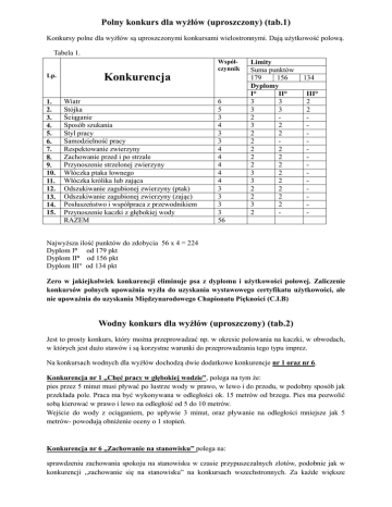 Polny konkurs dla wyżłów (uproszczony) (tab.1) Konkursy polne dla wyżłów są uproszczonymi konkursami wielostronnymi. Dają użytkowość polową. Tabela 1. Współczynnik Lp. 1. 2. 3. 4. 5. 6. 7. 8. 9. 10. 11. 12. 13. 14. 15. Konkurencja Wiatr Stójka Ściąganie Sposób szukania Styl pracy Samodzielność pracy Respektowanie zwierzyny Zachowanie przed i po strzale Przynoszenie strzelonej zwierzyny Włóczka ptaka łownego Włóczka królika lub zająca Odszukiwanie zagubionej zwierzyny (ptak) Odszukiwanie zagubionej zwierzyny (zając) Posłuszeństwo i współpraca z przewodnikiem Przynoszenie kaczki z głębokiej wody RAZEM 6 5 3 4 3 3 4 4 4 4 4 3 3 3 3 56 Limity Suma punktów 179 156 Dyplomy I° II° 3 3 3 3 2 3 2 2 2 2 2 2 2 2 2 2 3 2 3 2 2 2 2 2 3 2 2 - 134 III° 2 2 - Najwyższa ilość punktów do zdobycia 56 x 4 = 224 Dyplom I° od 179 pkt Dyplom II° od 156 pkt Dyplom III° od 134 pkt Zero w jakiejkolwiek konkurencji eliminuje psa z dyplomu i użytkowości polowej. Zaliczenie konkursów polnych upoważnia wyżła do uzyskania wystawowego certyfikatu użytkowości, ale nie upoważnia do uzyskania Międzynarodowego Chapionatu Piękności (C.I.B) Wodny konkurs dla wyżłów (uproszczony) (tab.2) Jest to prosty konkurs, który można przeprowadzać np. w okresie polowania na kaczki, w obwodach, w których jest dużo stawów i są korzystne warunki do przeprowadzania tego typu imprez. Na konkursach wodnych dla wyżłów dochodzą dwie dodatkowe konkurencje nr 1 oraz nr 6. Konkurencja nr 1 „Chęć pracy w głębokiej wodzie”, polega na tym że: pies przez 5 minut musi pływać po lustrze wody w prawo, w lewo i do przodu, w podobny sposób jak przekłada pole. Praca ma być wykonywana w odległości ok. 15 metrów od brzegu. Pies ma pozwolić sobą kierować w prawo i lewo na odległość od 5 do 10 metrów. Wejście do wody z ociąganiem, po upływie 3 minut, oraz pływanie na odległości mniejsze jak 5 metrów- powodują obniżenie oceny o 1 stopień. Konkurencja nr 6 „Zachowanie na stanowisku” polega na: sprawdzeniu zachowania spokoju na stanowisku w czasie przypuszczalnych zlotów, podobnie jak w konkurencji „zachowanie się na stanowisku” na konkursach wszechstronnych. Za każde większe niespokojne zachowanie się psa na stanowisku - jeden stopień niżej, podobnie jak w przypadku konkursów wszechstronnych, obserwuje się zachowanie psa na stanowisku po 5 strzałów co 1 min. w przypadku trzymania psa na otoku najwyższa punktacja to 3; przewodnik przed konkurencją nr 6 musi zadeklarować w jakiej pozycji pozostaje pies podczas konkurencji; Konkurencja nr 7 jak konkurencja nr 8 w klasie wielostronnej Zaliczenie konkursów wodnych w konkursach cząstkowych nie upoważnia psa do uzyskania wystawowego certyfikatu użytkowości. Natomiast zaliczenie konkursu wodnego oraz konkursu polnego daje pełne prawo do uzyskania praw wyżła wielostronnego, wystawowego certyfikatu użytkowości i spełnia wymogi łowieckie do Międzynarodowego Championatu Piękności (C.I.B) Tabela 2. Współczynnik Lp. Konkurencja Limity Suma punktów 89 78 67 Dyplomy 1. 2. 3. 4. 5. 6. 7. 8 Chęć pracy w głębokiej wodzie Bobrowanie bez kaczki Bobrowanie za żywą kaczką Przynoszenie kaczki z szuwarów Przynoszenie kaczki z głębokiej wody Zachowanie na stanowisku Przynoszenie strzelonego ptaka z lądu Posłuszeństwo i współpraca z przewodnikiem RAZEM 3 5 4 4 3 2 4 3 28 I° 2 3 2 2 3 2 2 - II° 2 2 2 2 2 - III° - Najwyższa ilość punktów do zdobycia 28 x 4 = 112 Dyplomy I stopnia od 89pkt; II stopnia od 78pkt; III stopnia od 67pkt; Leśny konkurs dla wyżłów (uproszczony) (tab.3) Z dodatkowych konkurencji leśnych w konkursie uproszczonym dla wyżłów, a których nie ma w konkursach wszechstronnych, są konkurencje nr 5 i nr 6. Konkurencja nr 5 „Odszukiwanie lisa ” polega na: - odszukaniu lisa w czasie 8 minut, na takiej samej zasadzie jak szukanie zająca lub królika w konkursach wielostronnych; -pies musi się wykazać chęcią pracy w lesie i wypracować, szukając pod wiatr lisa położonego w średnio gęstym młodniku; Konkurencja nr 6 „Odszukiwanie ptaka (pióro)” ma przebiegać w podobny sposób jak w klasie wielostronnej i polega na: - odszukiwaniu zagubionego ptaka łownego (bażant lub kaczka); - aport ptaka w średnio gęstym młodniku lub zadrzewieniu; - czas na wykonanie konkurencji to 8 minut, jak w klasie wielostronnej; Konkurencje 7,8,9,10,11 jak w klasie wszechstronnej Konkurencje leśne zaleca się przeprowadzać w miesiącach od sierpnia do listopada, nie przeprowadza się ich na białej stopie. Na każde startujące 10 psów należy zabezpieczyć: 3 lisy, 5 królików, 5 bażantów lub kaczek. Zaliczenie konkursów leśnych nie upoważnia wyżła do uzyskania wystawowego certyfikatu użytkowości. Natomiast zaliczenie konkursu leśnego, wodnego oraz polnego daje pełne prawo do uzyskania praw wyżła wszechstronnego, wystawowego certyfikatu użytkowości i spełnia wymogi łowieckie do Międzynarodowego Championatu Piękności (C.I.B) Tabela 3. Lp . Konkurencja Współczynnik Limity Sumy 134 117 100 Dyplomy 1. Praca po farbie zwierzyny grubej 2. 3. 4. 5. 6. 7. 8. 9. 10. a)na otoku b)z oznajmianiem c)z oszczekiwaniem Warowanie Włóczka królika lub zająca Włóczka lisa Odszukiwanie lisa (do chledawka) Odszukiwanie ptaka (pióro) Buszowanie Prowadzenie na otoku podczas podchodu Wyparowywanie Posłuszeństwo podczas wyparowywania buszowania Zachowanie na stanowisku RAZEM 11. 6 4 3 3 4 5 5 3 3 2 3 i 3 5 42 I° II° III° 3 3 3 3 3 2 2 2 2 2 2 2 2 2 2 - - 3 2 - Najwyższa ilość punktów do zdobycia 42 x 4 = 168 Dyplom I° od 134 pkt II° od 117 pkt III° od 100 pkt Uwaga: Konkursy cząstkowe nie powinny odbywać się w okresach ochronnych. Mogą one mieć tylko rangę regionalną.