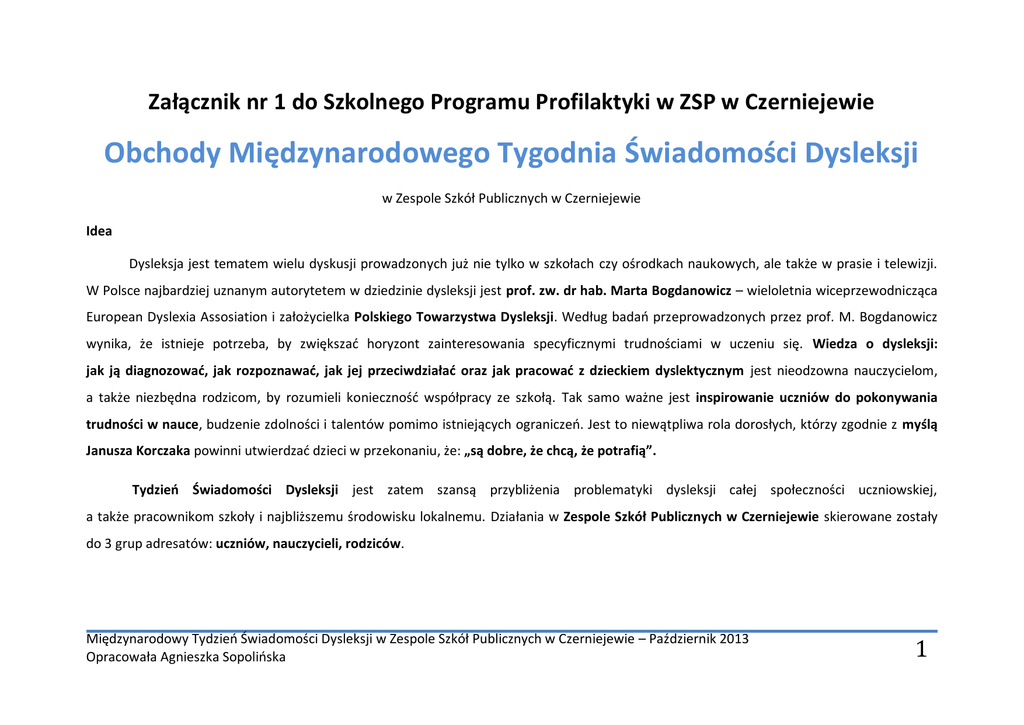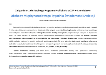 Załącznik nr 1 do Szkolnego Programu Profilaktyki w ZSP w Czerniejewie Obchody Międzynarodowego Tygodnia Świadomości Dysleksji w Zespole Szkół Publicznych w Czerniejewie Idea Dysleksja jest tematem wielu dyskusji prowadzonych już nie tylko w szkołach czy ośrodkach naukowych, ale także w prasie i telewizji. W Polsce najbardziej uznanym autorytetem w dziedzinie dysleksji jest prof. zw. dr hab. Marta Bogdanowicz – wieloletnia wiceprzewodnicząca European Dyslexia Assosiation i założycielka Polskiego Towarzystwa Dysleksji. Według badań przeprowadzonych przez prof. M. Bogdanowicz wynika, że istnieje potrzeba, by zwiększać horyzont zainteresowania specyficznymi trudnościami w uczeniu się. Wiedza o dysleksji: jak ją diagnozować, jak rozpoznawać, jak jej przeciwdziałać oraz jak pracować z dzieckiem dyslektycznym jest nieodzowna nauczycielom, a także niezbędna rodzicom, by rozumieli konieczność współpracy ze szkołą. Tak samo ważne jest inspirowanie uczniów do pokonywania trudności w nauce, budzenie zdolności i talentów pomimo istniejących ograniczeń. Jest to niewątpliwa rola dorosłych, którzy zgodnie z myślą Janusza Korczaka powinni utwierdzać dzieci w przekonaniu, że: „są dobre, że chcą, że potrafią”. Tydzień Świadomości Dysleksji jest zatem szansą przybliżenia problematyki dysleksji całej społeczności uczniowskiej, a także pracownikom szkoły i najbliższemu środowisku lokalnemu. Działania w Zespole Szkół Publicznych w Czerniejewie skierowane zostały do 3 grup adresatów: uczniów, nauczycieli, rodziców. Międzynarodowy Tydzień Świadomości Dysleksji w Zespole Szkół Publicznych w Czerniejewie – Październik 2013 Opracowała Agnieszka Sopolińska 1 Działania adresowane do uczniów: Formy i cele Warsztaty edukacyjne dla uczniów: Cel: wdrożenie i zachęcenie uczniów do stosowania nowych technik uczenia się Tematyka Oswoić dysleksję z J.Ch. Andersenem Cel: Przybliżenie postaci słynnego pisarza zmagającego się przez całe życie z dysleksją, ukazanie szans i możliwości dla uczniów z trudnościami, zainteresowanie czytelnictwem, itd. Zapoznanie z baśniami J. Ch. Andersena Ciekawe sposoby na naukę „Żeby, kurka nie bazgrała” – warsztaty kaligraficzne Ucz się ortografii inaczej Sposoby radzenia sobie ze stresem Dysleksja a nauka języków obcych Książka moim przyjacielem W na przykładzie postaci słynnego bajkopisarza ukazanie uczniom możliwych sposobów radzenia sobie z trudnościami Osoby odpowiedzialne A . Sopolińska M. Zakrzewska E. Łachowska Zaproszone do współpracy instytucje Biblioteka Miejska w Czerniejewie – L. Doradzała-Kowalewska E. Łachowska Nauczyciele kl. I-III SP, Chętni rodzice Czytanie uczniom kl. I-III wybranych baśni J. Wychowawcy kl. I-III SP Ch. Andersena (około 20 minut codziennie przez: starszych uczniów, rodziców, dziadków oraz wychowawców lub inną wyjątkową osobę) Międzynarodowy Tydzień Świadomości Dysleksji w Zespole Szkół Publicznych w Czerniejewie – Październik 2013 Opracowała Agnieszka Sopolińska 2 Ekspert od Andersena – Turniej wiedzy dla klas IIV SP Baśnie tematycznie związane są ważnymi A. Sopolińska wartościami będącymi drogowskazem w pokonywaniu trudności, proponowane baśnie: „Brzydkie kaczątko” „Dziewczynka z zapałkami” „Mała syrena” „Pięć ziarenek grochu” „Słowik” „Świniopas” „Stokrotka” Konkurs na prezentację multimedialną o życiu i twórczości J.Ch. Andersena oraz okolicznościowa gazetka lub wystawa związana z pisarzem Sztafeta ortograficzna dla uczniów lub Dyktando ortograficzne dla rodziców i dzieci Przybliżenie postaci słynnego pisarza A. A.Sopolińska zmagającego się przez całe życie z dysleksją, ukazanie szans i możliwości dla uczniów z trudnościami M.in. na podstawie baśni opracowanie A.Sopolińska, zestawu wyrazów trudnych ortograficznie, chętni nauczyciele nagrodzenie zwycięskich zespołów Konkurs Plastyczny dla SP – Ilustracja ulubionej baśni Andersen dla SP Rozwijanie wyobraźni, twórczość plastyczna jako forma odreagowania stresu Inscenizacja teatralna w wykonaniu uczniów kl. III SP Gazetka informacyjno-edukacyjna Cel: popularyzowanie wiedzy na temat dysleksji, portrety słynnych osób z dysleksją, ukazywanie sposobów na skuteczną naukę, radzenie sobie z trudnościami G. Szała Uczniowie zaprezentują przedstawienie M. Banaszak. R. Krygier o tematyce związanej z nauką ortografii. Ukazanie sposobów radzenia sobie ze stresemA. A.Sopolińska szkolnym, informowanie o skutecznych sposobach odreagowania trudności Międzynarodowy Tydzień Świadomości Dysleksji w Zespole Szkół Publicznych w Czerniejewie – Październik 2013 Opracowała Agnieszka Sopolińska 3 Wycieczki do teatru, biblioteki miejskiej Cel: zachęcanie do korzystania z miejsc kultury, wzmacnianie potrzeb kulturalnych Konkurs dla Klas: wykonanie słowniczków ortograficznych lub innych pomocy do nauki ortografii Cel: rozwijanie świadomości ortograficznej Dzień otwarty w pokoju terapeutycznym Cel: stworzenie atmosfery przyjaznej uczniom, popularyzowanie pomocy terapeutycznej Konsultacje i porady dla uczniów Cel: udzielenie indywidualnego wsparcia uczniom z trudnościami w nauce oraz zachęcanie uczniów do skorzystania z pomocy specjalistów Inspirowanie do poszukiwania ciekawych miejsc spędzania wolnego czasu sprzyjających rozwojowi dzieci w tym rozwojowi potrzeb kulturalnych Wyrabianie czujności ortograficznej, dbałość o poprawność ortograficzną wytworów pisemnych uczniów, nagrodzenie ciekawych pomysłów Pokój terapeutyczny jako miejsce pomocy dla ucznia, przyjazna przestrzeń do pokonywania trudności wychowawcy, nauczyciele języka polskiego wychowawcy, nauczyciele języka polskiego pedagog/psycholog Rozmowy z uczniami mającymi trudności pedagog/psycholog/logopeda w nauce, zaproszenie do współpracy Międzynarodowy Tydzień Świadomości Dysleksji w 
