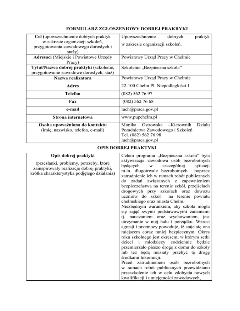 FORMULARZ ZGŁOSZENIOWY DOBREJ PRAKRYKI Cel (upowszechnienie dobrych praktyk w zakresie organizacji szkoleń, przygotowania zawodowego dorosłych i staży) Adresaci (Miejskie i Powiatowe Urzędy Pracy) Tytuł/Nazwa dobrej praktyki (szkolenie, przygotowanie zawodowe dorosłych, staż) Nazwa realizatora Upowszechnienie dobrych praktyk w zakresie organizacji szkoleń. Powiatowy Urząd Pracy w Chełmie Szkolenie „Bezpieczna szkoła” Powiatowy Urząd Pracy w Chełmie 22-100 Chełm Pl. Niepodległości 1 Adres Telefon (082) 562 76 97 Fax (082) 562 76 68 e-mail [email protected] Strona internetowa www.pupchelm.pl Osoba upoważniona do kontaktu (imię, nazwisko, telefon, e-mail) Monika Ostrowska –Kierownik Działu Poradnictwa Zawodowego i Szkoleń Tel. (082) 562 76 98 [email protected] OPIS DOBREJ PRAKTYKI Opis dobrej praktyki (przesłanki, problemy, potrzeby, które zainspirowały realizację dobrej praktyki, krótka charakterystyka podjętego działania) Celem programu „Bezpieczna szkoła” była aktywizacja zawodowa osób bezrobotnych będących w szczególnej sytuacji m.in. długotrwale bezrobotnych poprzez zatrudnienie ich w ramach robót publicznych do zadań związanych z zapewnieniem bezpieczeństwa na terenie szkół, przejściach drogowych przy szkołach oraz dowozu uczniów do szkół na terenie powiatu chełmskiego oraz miasta Chełm. Niezbędnym warunkiem, aby szkoła mogła się zająć swymi podstawowymi zadaniami tj. nauczaniem oraz wychowaniem, jest utrzymanie w niej ładu i porządku. Wzrost agresji i przemocy powoduje, iż staje się ona miejscem coraz mniej bezpiecznym. Okres roku szkolnego jest okresem, w którym setki dzieci i młodzieży codziennie będzie przemierzało pieszo drogę z domu do szkoły lub też będą musiały przebyć tę drogę środkami lokomocji. Przed zatrudnieniem osób bezrobotnych w ramach robót publicznych przewidziano przeszkolenie ich w celu zdobycia nowych kwalifikacji i umiejętności zawodowych, Partnerzy współpracujący w realizacji działania /o ile uczestniczyli/ niezbędnych do wykonywania zadań związanych z podjętą pracą. Ponadto celem niniejszego szkolenia było: zwiększenie bezpieczeństwa na terenach szkół powiatu chełmskiego oraz miasta Chełm, poprawa bezpieczeństwa na przejściach drogowych w obrębie szkół powiatu chełmskiego oraz miasta Chełm, zapewnienie nadzoru nad dziećmi w autobusach w drodze do szkoły, zmniejszenie i ograniczenie przemocy w środowisku szkolnym Szkolenie „Bezpieczna szkoła” w wymiarze 25 godzin zegarowych obejmowało następujące bloki tematyczne: Kierowanie ruchem drogowym Szkoła wolna od uzależnień Pierwsza pomoc przedmedyczna. Efekty programu mającego charakter cykliczny: ukończenie szkolenia przez 124 osoby bezrobotne zaktywizowanie osób bezrobotnych w formie robót publicznych Jednostki samorządu terytorialnego powiatu chełmskiego i miasta Chełm oraz instytucja szkoleniowa - Wojewódzki Ośrodek Ruchu Drogowego w Chełmie _ Załączniki /dodatkowe materiały uzupełniające np.fotografie, artykuły prasowe/ Oświadczam, że zgadzam się na przetwarzanie informacji zawartych w powyższym formularzu oraz materiałów dodatkowych (załączników) w celach promocyjnych związanych z upowszechnianiem i wykorzystaniem powyższych materiałów na stronie internetowej Wojewódzkiego Urzędu Pracy w Lublinie (na podstawie art. 23 ust.1 pkt.1 ustawy z dnia 29 sierpnia 1997r. o ochronie danych osobowych (tj. Dz.U. z 2002r. Nr 101, poz.926 z późn.zmianiami). Podpis osoby upoważnionej
