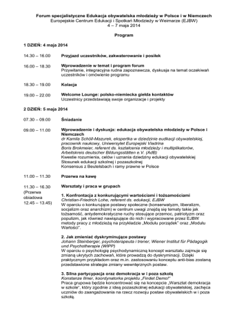 Forum specjalistyczne Edukacja obywatelska młodzieży w Polsce i w Niemczech Europejskie Centrum Edukacji i Spotkań Młodzieży w Weimarze (EJBW) 4 – 7 maja 2014 Program 1 DZIEŃ: 4 maja 2014 14.30 – 16.00 Przyjazd uczestników, zakwaterowanie i posiłek 16.00 – 18.30 Wprowadzenie w temat i program forum Przywitanie, integracyjna rudna zapoznawcza, dyskusja na temat oczekiwań uczestników i omówienie programu 18.30 – 19.00 Kolacja 19.00 – 22.00 Welcome Lounge: polsko-niemiecka giełda kontaktów Uczestnicy przedstawiają swoje organizacje i projekty 2 DZIEŃ: 5 maja 2014 07.30 – 09.00 Śniadanie 09.00 – 11.00 Wprowadzenie i dyskusja: edukacja obywatelska młodzieży w Polsce i Niemczech dr Kamila Schöll-Mazurek, ekspertka w dziedzinie eudkacji obywatelskiej, pracownik naukowy, Uniwersytet Europejski Viadrina Boris Brokmeier, referent ds. kształcenia młodzieży i multiplikatorów, Arbeitskreis deutscher Bildungsstätten e.V. (AdB) Kwestie rozumienia, celów i uznania dziedziny edukacji obywatelskiej Stosunek edukacji szkolnej i pozaszkolnej Konsensus z Beutelsbach i ramy prawne w Polsce 11.00 – 11.30 Przerwa na kawę 11.30 – 16.30 (Przerwa obiadowa 12.45 – 13.45) Warsztaty i praca w grupach 1. Konfrontacja z konkurującymi wartościami i tożsamościami Christian-Friedrich Lohe, referent ds. edukacji, EJBW W oparciu o konkurujące postawy społeczne (konserwatyzm, liberalizm, socjalizm oraz anarchizm) w centrum uwagi znajdą się tematy takie jak tożsamość, antydemokratyczne ruchy stosujące przemoc, patriotyzm oraz populizm, jak również nawiązujące do nich i wypracowane przez EJBW metody pracy z młodzieżą na przykładzie „Modułu porządek” oraz „Modułu Wartości”. 2. Jak zmieniać dyskryminujące postawy Johann Steinberger, psychoterapeuta i trener, Wiener Institut für Pädagogik und Psychotherapie (WIPP) W oparciu o psychologię psychodynamiczną koncept warsztatu zajmuje się zmianą ukrytych zachowań, które prowadzą do dyskryminacji. Dzięki praktycznym przykładom oraz m.in. zastosowaniu konceptu anti-bias zostaną przedstawione strategie zmiany wewntęrznych postaw. 3. Silna partycypacja oraz demokracja w i poza szkołą Konstanze Ilmer, koordynatorka projektu „Findet Demo!“ Praca grupowa będzie koncentrować się na koncepcie „Warsztat demokracja w szkole“, który zgodnie z ideą pozaszkolnej edukacji obywatelskiej, zachęca uczniów do zaangażowania na rzecz rozwoju postaw obywatelskich w i poza szkołą. 4. E-partycypacja: zaangażowanie w życie obywatelskie w sieci Jürgen Ertelt, koordynator projektu youthpart - Jugendbeteiligung in der digitalen Gesellschaft (Partycypacja młodzieży w społeczeństwie cyfrowym) Podczas warsztatów uczestnicy wymienią się wiedzą oraz zdobędą nowe doświadczenia w zakresie odpowiedzialnego korzystania i partycypacji w mediach społecznościowych. 16.30 – 17.00 Przerwa na kawę 17.00 – 18.00 Prezentacja wyników pracy w grupach 18.30 – 19.00 Kolacja 19.30 – 21.00 Zwiedzanie nocne Weimaru z przewodnikiem 3 DZIEŃ: 6 maja 2014 07.30 – 09.00 Śniadanie 09.00 – 10.30 Przejazd do Erfurtu 10.30 – 13.30 Wizyta w miejscu edukacji i pamięci Andreasstraße w Erfurcie Wprowadzenie w tematykę pedagogiki miejsc pamięci 13.30 – 15.00 Powrót do Weimaru 15.00 – 18.30 (w tym przerwa na kawę) Warsztaty przyszłości: metoda otwartej przestrzeni Temat: Koncepcje przyszłej współpracy między uczestnikami forum oraz ich organizacji 18.30 – 20.00 Kolacja 20.00 – 22.00 Networking Lounge 4 DZIEŃ: 7 maja 2014 07.30 – 09.00 Śniadanie 09.00 – 13.00 Ewaluacja i prezentacja wyników prac w ramach warsztatów przyszłości Ewaluacja forum Pożegnanie 13.00 – 14.30 Obiad i wyjazd uczestników Moderacja: Wolfgang Sieberth, pedagog wczesnej edukacji, CULTURE GOES EUROPE e.V. (CGE) Katarzyna Malinowska, trenerka, Polska Fundacja im. Roberta Schumana Dorota Kondiuch, trenerka, Polska Fundacja im. Roberta Schumana Zastrzega się możliwość zmian w programie. Partnerami projektu są: Przy finansowym wsparciu: