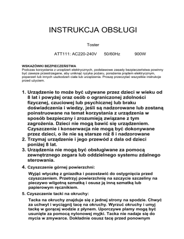 INSTRUKCJA OBSŁUGI Toster ATT111: AC220-240V 50/60Hz 900W WSKAZÓWKI BEZPIECZEŃSTWA Podczas korzystania z urządzeń elektrycznych, podstawowe zasady bezpieczeństwa powinny być zawsze przestrzegane, aby uniknąć ryzyka pożaru, porażenia prądem elektrycznym, poparzeń lub innych uszkodzeń ciała lub urządzenia. Proszę przeczytać wszystkie instrukcje przed użyciem. 1. Urządzenie to może być używane przez dzieci w wieku od 8 lat i powyżej oraz osób o ograniczonej zdolności fizycznej, czuciowej lub psychicznej lub braku doświadczenia i wiedzy, jeśli są nadzorowane lub zostaną poinstruowane na temat korzystania z urządzenia w sposób bezpieczny i zrozumieją związane z tym zagrożenia. Dzieci nie mogą bawić się urządzeniem. Czyszczenie i konserwacja nie mogą być dokonywane przez dzieci, o ile nie są starsze niż 8 i nadzorowane 2. Trzymaj urządzenie i jego przewód z dala od dzieci poniżej 8 lat. 3. Urządzenia nie mogą być obsługiwane za pomocą zewnętrznego zegara lub oddzielnego systemu zdalnego sterowania. 4. Czyszczenie górnej powierzchni: Wyjąć wtyczkę z gniazdka i pozostawić do ostygnięcia przed czyszczeniem. Przetrzyj powierzchnię na szczycie szczeliny na pieczywo wilgotną szmatką i osusz ją inną szmatką lub papierowym ręcznikiem. 5. Czyszczenie tacki na okruchy: Tacka na okruchy znajduje się z jednej strony na spodzie. Chwyć za uchwyt i wyciągnij tacę na okruchy. Wyrzuć okruchy i umyj tackę w gorącej wodzie z płynem. Uporczywe plamy mogą być usunięte za pomocą nylonowej myjki. Tacka nie nadaje się do mycia w zmywarce. Dokładnie osusz tacę przed ponownym włożeniem do gniazda w tosterze. Ostrzeżenie: opróżniaj tacę na okruchy często. Okruchy gromadzące się na tacy mogą się zapalić, jeśli taca nie będzie systematycznie opróżniana. 5. Zewnętrzna powierzchnia urządzewnia może się nagrzewać podczas jego pracy. 6. Chleb może się palić, więc nie korzystać z tostera w pobliżu lub poniżej materiałów łatwopalnych, tj. zasłony itp. 7. Jeśli przewód zasilający jest uszkodzony, musi zostać wymieniony przez producenta lub jego autoryzowany serwis lub wykwalifikowaną osobę w celu uniknięcia zagrożenia. 8. Nie dotykaj gorących powierzchni. 9. W celu ochrony przed porażeniem prądem elektrycznym, NIE WOLNO zanurzać przewodu, wtyczki ani żadnych części tego tostera w wodzie lub innej cieczy. 10. Nie używaj urządzenia z uszkodzonym przewodem lub wtyczką, lub po awarii urządzenia lub jeśli zostało uszkodzone w jakikolwiek sposób. W celu sprawdzenia, naprawy lub regulacji skontaktuj się z odpowiednio wykwalifikowanym elektrykiem/serwisantem. 11. Stosowanie akcesoriów niezalecanych lub niesprzedawanych przez producenta urządzenia może spowodować obrażenia ciała lub uszkodzenie urządzenia. 12. Nie używać na zewnątrz. Urządzenie jest przeznaczone wyłącznie do użytku domowego. 13. Nigdy nie pozwól aby kabel zwisał ze stołu lub z blatu ani dotykał gorących powierzchni. 14. Nie umieszczaj na lub w pobliżu gorącego palnika gazowego lub elektrycznego, lub w nagrzanym piekarniku 15. 16. NIE WOLNO używać tostera niezgodnie z przeznaczeniem. Zbyt duże pieczywo, folia metalowa lub naczynia nie mogą być umieszczane w tosterze, ponieważ mogą stworzyć ryzyko pożaru lub porażenia prądem. 17. Ogień może wystąpić, jeśli toster jest przykryty lub znajduje się w pobliżu materiałów łatwopalnych, w tym zasłon, firan, ścian i tym podobnych, w trakcie pracy. 18. 19. 20. 21. Nie próbuj wyciągać pieczywa, gdy toster jest podłączony. Nie pozostawiaj tostera bez nadzoru podczas gdy jest włączony. Jeśli taca na okruchy nie jest regularnie czyszczona, występuje ryzyko pożaru. NIE WOLNO używać metalowej ściereczki do czyszczenia. Kawałki ściereczki mogą dostać się do tostera powodując ryzyko porażenia prądem, jeśli wejdą w kontakt z częściami elektrycznymi. 22. Nie tostować wafli /placków ryżowych, placków chlebowych i innych podobnych produktów. 23. PROSZĘ ZACHOWAĆ INSTRUKCJĘ. OBSŁUGA: Przed pierwszym użyciem 1. Usuń wszystkie elementy opakowania, etykiety i / lub naklejki z tostera. Upewnij się, że nie ma żadnego materiału opakowaniowego w otworach tostera. 2. Włóż tacę na okruchy. 3. Wybierz lokalizację tostera, powinna być: - płaska, odporna na ciepło, niepalna powierzchnia - minimum 3 cale z dala od ścian, szaf itp. - ok 30-40 cm z dala od szaf itp. Które mogą znajdować się powyżej tostera. - z dala od łatwopalnych materiałów tj. zasłony i inne materiały. - z dala od piecyków gazowych I elementów elektrycznych. 4. Podłącz przewód zasilający do gniazdka, 50Hz 220-240Volt AC. Aby zabezpieczyć przewód użyj uchwytu na kabel znajdującego się pod tosterem. Używanie tostera 1. Większość rodzajów pieczywa może byc tostowana. Jednakże kromka chleba nie powinna być tak mała, aby wpadać do otworu na chleb. 2. Kromka powinna być umieszczona na środku siatki (dla T-885) lub otworu (dla innych modeli) 3. Dla T-885, po umeiszczeniu chleba na siatce wybierz porządany poziom zbrązowienia pieczywa (czas tostowania) za pomocą dźwigni. Urządzenie przestanie działać kiedy ustawiony czas pieczenia upłynie. Za pomocą dołączonego narzędzia zdejmij chleb z tostera. 4. Dla pozostałych modeli, po umieszczeniu chleba w otworze, wybierz poziom zbrązowienia (czas tostowania) za pomocą dźwigni i wciśnij przycisk do momentu kliknięcia. Autoregulacja (umieszczona wewnątrz otworów na pieczywo) automatycznie ustawi chleb po środku dla równego zbrązowienia. Po upływie ustawionego czasu, chleb wyskoczy automatycznie a przycisk blokujący i auto-regulacja powrócą do stanu wyjściowego. 5. Powierzchnia siatki, elementy grzewcze, otwory na pieczywo i boki tostera są gorące, dlatego zachowaj ostożność podczas wyciagania pieczywa. Ostrzeżenie: 1. Upieczony chleb może być bardzo gorący. Obchodź 