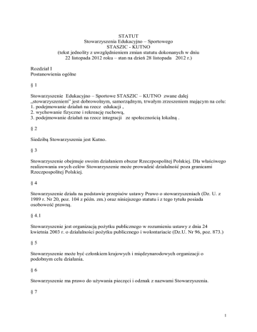 STATUT Stowarzyszenia Edukacyjno – Sportowego STASZIC - KUTNO (tekst jednolity z uwzględnieniem zmian statutu dokonanych w dniu 22 listopada 2012 roku – stan na dzień 28 listopada 2012 r.) Rozdział I Postanowienia ogólne §1 Stowarzyszenie Edukacyjno – Sportowe STASZIC – KUTNO zwane dalej „stowarzyszeniem” jest dobrowolnym, samorządnym, trwałym zrzeszeniem mającym na celu: 1. podejmowanie działań na rzecz edukacji , 2. wychowanie fizyczne i rekreację ruchową, 3. podejmowanie działań na rzecz integracji ze społecznością lokalną . §2 Siedzibą Stowarzyszenia jest Kutno. §3 Stowarzyszenie obejmuje swoim działaniem obszar Rzeczpospolitej Polskiej. Dla właściwego realizowania swych celów Stowarzyszenie może prowadzić działalność poza granicami Rzeczpospolitej Polskiej. §4 Stowarzyszenie działa na podstawie przepisów ustawy Prawo o stowarzyszeniach (Dz. U. z 1989 r. Nr 20, poz. 104 z późn. zm.) oraz niniejszego statutu i z tego tytułu posiada osobowość prawną. § 4.1 Stowarzyszenie jest organizacją pożytku publicznego w rozumieniu ustawy z dnia 24 kwietnia 2003 r. o działalności pożytku publicznego i wolontariacie (Dz.U. Nr 96, poz. 873.) §5 Stowarzyszenie może być członkiem krajowych i międzynarodowych organizacji o podobnym celu działania. §6 Stowarzyszenie ma prawo do używania pieczęci i odznak z nazwami Stowarzyszenia. §7 1 Stowarzyszenie może powoływać "Komisje" i "Fundusze" na zasadach określonych w statucie. §8 Czas trwania Stowarzyszenia jest nieokreślony. §9 Stowarzyszenie realizuje cele określone w § 1 następującymi sposobami: 1. współdziałanie ze szkołami , instytucjami samorządowymi i rządowymi oraz organizacjami społecznymi , 2. wspomaganie organizacji zajęć pozaszkolnych , w tym organizacja konkursów , turniejów i festynów , 3. promowanie i wspieranie uczniów wyróżniających się w nauce oraz ich działaniach na rzecz szkoły , 4. prowadzenie akcji charytatywnych , 5. dbałość o rozwój psychofizyczny członków poprzez organizowanie zajęć rekreacyjno sportowych, 6. organizowanie imprez rekreacyjno- sportowych , 7. udział w amatorskim współzawodnictwie sportowym. § 9(1) W zakresie określonym w § 9 Stowarzyszenie prowadzi nieodpłatną działalność pożytku publicznego w zakresie : 1. pozaszkolnych form edukacji sportowej oraz zajęć sportowych i rekreacyjnych - PKD 85.51.Z 2. działalność wspomagająca edukację - PKD 85.60.Z 3. działalność związaną ze sportem - PKD 93.1 § 10 Stowarzyszenie celem realizacji swych statutowych celów może powoływać inne organizacje w granicach prawem dopuszczonych. § 11 Realizując powyższe cele Stowarzyszenie opiera się na społecznej pracy członków. Może jednak zatrudnić pracowników do prowadzenia swych spraw. § 12 1. Członkowie Stowarzyszenia dzielą się na: a) członków zwyczajnych b) członków wspierających 2. Członkiem Stowarzyszenia może być obywatel Rzeczpospolitej Polskiej, oraz cudzoziemiec, mający pełną zdolność do czynności prawnych, który złoży deklarację o przystąpieniu do stowarzyszenia. 3. Małoletni w wieku od 16 lat do 18 lat, którzy mają ograniczoną zdolność do czynności prawnych, mogą należeć do Stowarzyszenia i korzystać z czynnego i biernego prawa 2 wyborczego z tym, że w składzie Zarządu Stowarzyszenia większość muszą stanowić osoby o pełnej zdolności do czynności prawnych. 4. Osoby prawne deklarujące pomoc w realizacji celów Stowarzyszenia, w szczególności pomoc finansową, mogą być członkami wspierającymi Stowarzyszenia. § 13 1. Członkowstwo Stowarzyszenia nabywa się po przyjęciu kandydatury przez Zarząd Stowarzyszenia zwykłą większością głosów w drodze uchwały; o podjęciu uchwały Zarząd powiadamia zainteresowanego. 2. Założyciele Stowarzyszenia, którzy podpisali listę założycieli dołączoną do wniosku o rejestrację Stowarzyszenia, stają się członkami z chwilą uprawomocnienia się postanowienia sądu o zarejestrowaniu. § 14 1. Członkowie stowarzyszenia zobowiązani są: a) swoją postawą i działaniami przyczyniać się do wzrostu roli i znaczenia Stowarzyszenia, b) dbać o jego dobre imię, c) popierać i czynnie realizować cele Stowarzyszenia, d) przestrzegać postanowień Statutu i powszechnie obowiązującego prawa, e) regularnie opłacać składki. 2. Członek Stowarzyszenia ma prawo brać udział w życiu Stowarzyszenia, w szczególności: a) wybierać i być wybieranym do władz Stowarzyszenia, b) wnioskować we wszystkich sprawach dotyczących celów i funkcjonowania Stowarzyszenia, c) korzystać z lokalu Stowarzyszenia, d) korzystać z rekomendacji, gwarancji i opieki Stowarzyszenia w swojej działalności, e) korzystać na preferencyjnych warunkach z urządzeń technicznych, poradnictwa i opieki Stowarzyszenia w swojej działalności, f) korzystać z innych możliwości, jakie stwarza swoim członkom Stowarzyszenie, g) posiadać legitymację Stowarzyszenia i nosić odznaki Stowarzyszenia. § 15 1. Osoby prawne mogą zostać członkami wspierającymi poprzez złożenie oświadczenia woli zarządowi Stowarzyszenia, który podejmuje w tej kwestii stosowną uchwałę. 2. W takim samym trybie następuje ustalenie członkostwa wspierającego Stowarzyszenia, 3. Formę i rodzaj wspierania Stowarzyszenia członkowie wspierający ustalą z Zarządem Stowarzyszenia. 4. Członkowie wspierający będą korzystać z praw przysługujących członkom zwyczajnym wymienionych w § 14 z wyłączeniem prawa wyborczego. § 16 1. Skreślenie z listy członków Stowarzyszenia następuje przez: a) rezygnację pisemną złożoną na ręce zarządu, b) wykluczenie przez Zarząd: - za: działalność sprzeczną ze statutem oraz uchwałami Stowarzyszenia, - nieusprawiedliwioną nieobecność podczas prac Stowarzyszenia, 3 - zaleganie z opłatą składki członkowskiej przez rok, -utratę praw obywatelskich w wyniku prawomocnego wyroku sądu,
