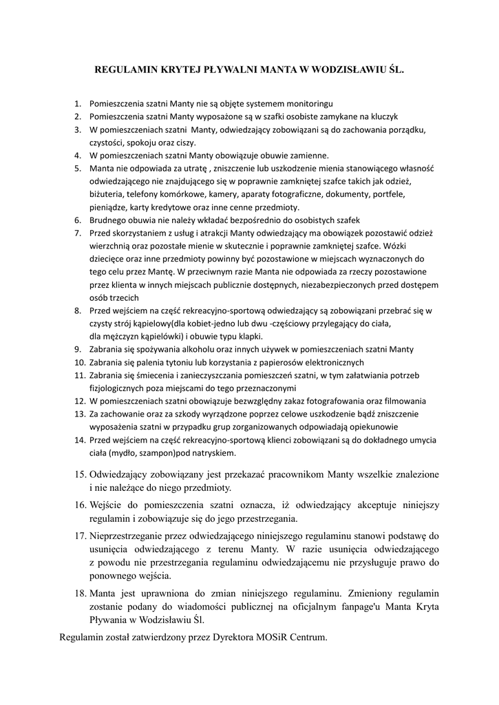REGULAMIN KRYTEJ PŁYWALNI MANTA W WODZISŁAWIU ŚL. 1. Pomieszczenia szatni Manty nie są objęte systemem monitoringu 2. Pomieszczenia szatni Manty wyposażone są w szafki osobiste zamykane na kluczyk 3. W pomieszczeniach szatni Manty, odwiedzający zobowiązani są do zachowania porządku, czystości, spokoju oraz ciszy. 4. W pomieszczeniach szatni Manty obowiązuje obuwie zamienne. 5. Manta nie odpowiada za utratę , zniszczenie lub uszkodzenie mienia stanowiącego własność odwiedzającego nie znajdującego się w poprawnie zamkniętej szafce takich jak odzież, biżuteria, telefony komórkowe, kamery, aparaty fotograficzne, dokumenty, portfele, pieniądze, karty kredytowe oraz inne cenne przedmioty. 6. Brudnego obuwia nie należy wkładać bezpośrednio do osobistych szafek 7. Przed skorzystaniem z usług i atrakcji Manty odwiedzający ma obowiązek pozostawić odzież wierzchnią oraz pozostałe mienie w skutecznie i poprawnie zamkniętej szafce. Wózki dziecięce oraz inne przedmioty powinny być pozostawione w miejscach wyznaczonych do tego celu przez Mantę. W przeciwnym razie Manta nie odpowiada za rzeczy pozostawione przez klienta w innych miejscach publicznie dostępnych, niezabezpieczonych przed dostępem osób trzecich 8. Przed wejściem na część rekreacyjno-sportową odwiedzający są zobowiązani przebrać się w czysty strój kąpielowy(dla kobiet-jedno lub dwu -częściowy przylegający do ciała, dla mężczyzn kąpielówki) i obuwie typu klapki. 9. Zabrania się spożywania alkoholu oraz innych używek w pomieszczeniach szatni Manty 10. Zabrania się palenia tytoniu lub korzystania z papierosów elektronicznych 11. Zabrania się śmiecenia i zanieczyszczania pomieszczeń szatni, w tym załatwiania potrzeb fizjologicznych poza miejscami do tego przeznaczonymi 12. W pomieszczeniach szatni obowiązuje bezwzględny zakaz fotografowania oraz filmowania 13. Za zachowanie oraz za szkody wyrządzone poprzez celowe uszkodzenie bądź zniszczenie wyposażenia szatni w przypadku grup zorganizowanych odpowiadają opiekunowie 14. Przed wejściem na część rekreacyjno-sportową klienci zobowiązani są do dokładnego umycia ciała (mydło, szampon)pod natryskiem. 15. Odwiedzający zobowiązany jest przekazać pracownikom Manty wszelkie znalezione i nie należące do niego przedmioty. 16. Wejście do pomieszczenia szatni oznacza, iż odwiedzający akceptuje niniejszy regulamin i zobowiązuje się do jego przestrzegania. 17. Nieprzestrzeganie przez odwiedzającego niniejszego regulaminu stanowi podstawę do usunięcia odwiedzającego z terenu Manty. W razie usunięcia odwiedzającego z powodu nie przestrzegania regulaminu odwiedzającemu nie przysługuje prawo do ponownego wejścia. 18. Manta jest uprawniona do zmian niniejszego regulaminu. Zmieniony regulamin zostanie podany do wiadomości publicznej na oficjalnym fanpage'u Manta Kryta Pływania w Wodzisławiu Śl. Regulamin został zatwierdzony przez Dyrektora MOSiR Centrum.