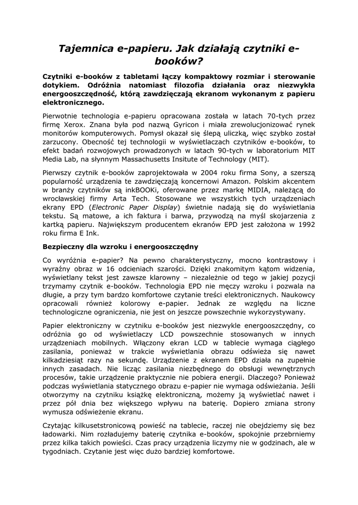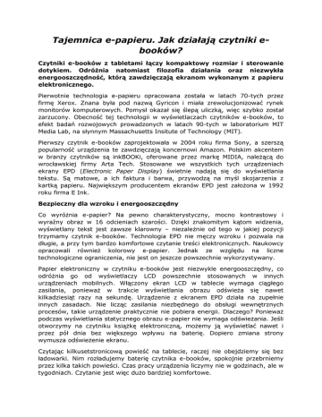 Tajemnica e-papieru. Jak działają czytniki ebooków? Czytniki e-booków z tabletami łączy kompaktowy rozmiar i sterowanie dotykiem. Odróżnia natomiast filozofia działania oraz niezwykła energooszczędność, którą zawdzięczają ekranom wykonanym z papieru elektronicznego. Pierwotnie technologia e-papieru opracowana została w latach 70-tych przez firmę Xerox. Znana była pod nazwą Gyricon i miała zrewolucjonizować rynek monitorów komputerowych. Pomysł okazał się ślepą uliczką, więc szybko został zarzucony. Obecność tej technologii w wyświetlaczach czytników e-booków, to efekt badań rozwojowych prowadzonych w latach 90-tych w laboratorium MIT Media Lab, na słynnym Massachusetts Insitute of Technology (MIT). Pierwszy czytnik e-booków zaprojektowała w 2004 roku firma Sony, a szerszą popularność urządzenia te zawdzięczają koncernowi Amazon. Polskim akcentem w branży czytników są inkBOOKi, oferowane przez markę MIDIA, należącą do wrocławskiej firmy Arta Tech. Stosowane we wszystkich tych urządzeniach ekrany EPD (Electronic Paper Display) świetnie nadają się do wyświetlania tekstu. Są matowe, a ich faktura i barwa, przywodzą na myśl skojarzenia z kartką papieru. Największym producentem ekranów EPD jest założona w 1992 roku firma E Ink. Bezpieczny dla wzroku i energooszczędny Co wyróżnia e-papier? Na pewno charakterystyczny, mocno kontrastowy i wyraźny obraz w 16 odcieniach szarości. Dzięki znakomitym kątom widzenia, wyświetlany tekst jest zawsze klarowny – niezależnie od tego w jakiej pozycji trzymamy czytnik e-booków. Technologia EPD nie męczy wzroku i pozwala na długie, a przy tym bardzo komfortowe czytanie treści elektronicznych. Naukowcy opracowali również kolorowy e-papier. Jednak ze względu na liczne technologiczne ograniczenia, nie jest on jeszcze powszechnie wykorzystywany. Papier elektroniczny w czytniku e-booków jest niezwykle energooszczędny, co odróżnia go od wyświetlaczy LCD powszechnie stosowanych w innych urządzeniach mobilnych. Włączony ekran LCD w tablecie wymaga ciągłego zasilania, ponieważ w trakcie wyświetlania obrazu odświeża się nawet kilkadziesiąt razy na sekundę. Urządzenie z ekranem EPD działa na zupełnie innych zasadach. Nie licząc zasilania niezbędnego do obsługi wewnętrznych procesów, takie urządzenie praktycznie nie pobiera energii. Dlaczego? Ponieważ podczas wyświetlania statycznego obrazu e-papier nie wymaga odświeżania. Jeśli otworzymy na czytniku książkę elektroniczną, możemy ją wyświetlać nawet i przez pół dnia bez większego wpływu na baterię. Dopiero zmiana strony wymusza odświeżenie ekranu. Czytając kilkusetstronicową powieść na tablecie, raczej nie obejdziemy się bez ładowarki. Nim rozładujemy baterię czytnika e-booków, spokojnie przebrniemy przez kilka takich powieści. Czas pracy urządzenia liczymy nie w godzinach, ale w tygodniach. Czytanie jest więc dużo bardziej komfortowe. Tajemnicze mikrokapsułki Czym jeszcze różni się papier elektroniczny od LCD? Pod mikroskopem dostrzeglibyśmy w jego strukturze coś, czego nie znajdziemy w żadnym tabletowym wyświetlaczu. Ekran przykładowego, 6-calowego czytnika e-booków, takiego jak inkBOOK Classic lub inkBOOK Obsidian, składa się z milionów mikrokapsułek wypełnionych cząsteczkami białego oraz czarnego pigmentu. Pigment jest zawieszony w przeźroczystej cieczy. Możemy dla uproszczenia przyjąć, że jedna taka mikrokapsułka to odpowiednik jednego piksela na ekranie czytnika. Mikrokapsułki umieszczone zostały w obwodzie elektrycznym, składającym się z elektrod sterujących. Zamknięte w nich cząsteczki pigmentu są wrażliwe na pole elektryczne. Białe są naładowane dodatnio, a czarne ujemnie. Każda zmiana przyłożonego napięcia w elektrodach powoduje ich ruch, a w efekcie zmianę koloru mikrokapsułki. Statyczny obraz wyświetlany na ekranie EPD to nic innego, jak efekt „zamrożenia” aktualnego układu cząsteczek pigmentu w mikrokapsułkach. Stąd też niewielki apetyt e-papieru na energię, przekładający się na długi czas pracy czytników na baterii. Doświetlenie i dotyk Dla naszego wzroku bardzo istotne jest to, że papier elektroniczny nie świeci. Czarny pigment w mikrokapsułkach jest widoczny zarówno w świetle naturalnym, jak i sztucznym. Ekrany LCD w tabletach muszą świecić, gdyż bez tego w ogóle nie mogłyby wyświetlać obrazu. Dodatkowo tablety mają ekran chroniony szklaną taflą, która przy intensywnym świetle słonecznym działa jak lustro. W ekranach EPD warto zwrócić uwagę na doświetlenie. Znajdziemy je w bardziej zaawansowanych czytnikach, takich jak: inkBOOK Obsidian, inkBOOK 8, Kindle Paperwhite czy Kobo Aura. Pozwala ono na komfortowe korzystanie z urządzenia w pochmurny dzień lub wieczorem, bez konieczności sięgania po lampkę nocną. Doświetlenie wykorzystuje diody LED świecące na ekran EPD z góry. Takie rozwiązanie jest przyjazne dla wzroku, gdyż ten rodzaj iluminacji nie razi w oczy. Doświetlenie w ekranie EPD warto odróżnić od podświetlenia obecnego w matrycach LCD, gdzie diody są zdecydowanie mocniejsze i zupełnie inaczej umieszczone. Co z funkcją dotyku? Większość dostępnych na rynku czytników e-booków wyposażona jest w ekrany pojemnościowe typu multi-touch. Niektóre z nich, jak choćby wspomniane już inkBOOKi polskiej marki MIDIA, bazują na popularnym systemie operacyjnym Android i wykorzystują gesty, które bardzo dobrze znamy ze smartfonów oraz tabletów. Wspierają również aplikacje mobilne. Tablety i czytniki e-booków dużo łączy, ale równie dużo dzieli. Czytniki są urządzeniami mocno wyspecjalizowanymi. Potrafią rewelacyjnie radzić sobie z książkami, dokumentami, czarno-białymi komiksami i grafikami. Można na nich również przeglądać strony internetowe oraz komfortowo czytać długie artykuły i elektroniczne wydania gazet czy magazynów. Niestety, n