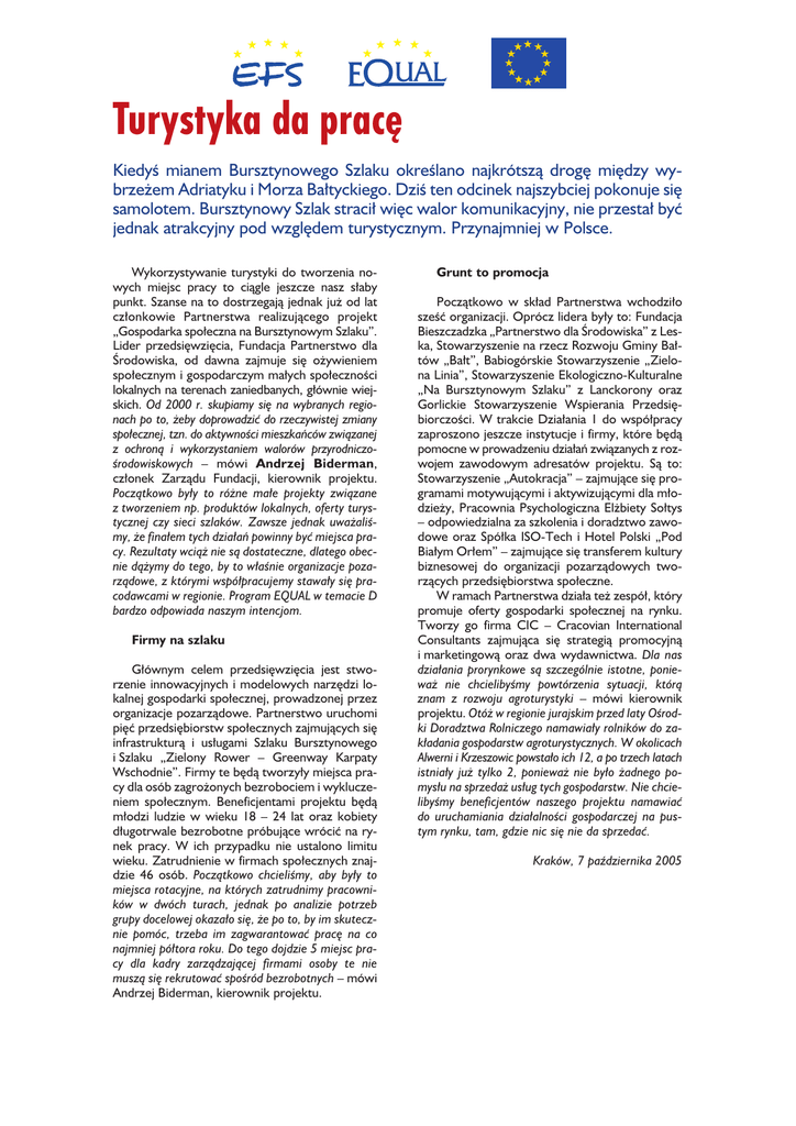 Turystyka da pracę Kiedyś mianem Bursztynowego Szlaku określano najkrótszą drogę między wybrzeżem Adriatyku i Morza Bałtyckiego. Dziś ten odcinek najszybciej pokonuje się samolotem. Bursztynowy Szlak stracił więc walor komunikacyjny, nie przestał być jednak atrakcyjny pod względem turystycznym. Przynajmniej w Polsce. Wykorzystywanie turystyki do tworzenia nowych miejsc pracy to ciągle jeszcze nasz słaby punkt. Szanse na to dostrzegają jednak już od lat członkowie Partnerstwa realizującego projekt „Gospodarka społeczna na Bursztynowym Szlaku”. Lider przedsięwzięcia, Fundacja Partnerstwo dla Środowiska, od dawna zajmuje się ożywieniem społecznym i gospodarczym małych społeczności lokalnych na terenach zaniedbanych, głównie wiejskich. Od 2000 r. skupiamy się na wybranych regionach po to, żeby doprowadzić do rzeczywistej zmiany społecznej, tzn. do aktywności mieszkańców związanej z ochroną i wykorzystaniem walorów przyrodniczośrodowiskowych – mówi Andrzej Biderman, członek Zarządu Fundacji, kierownik projektu. Początkowo były to różne małe projekty związane z tworzeniem np. produktów lokalnych, oferty turystycznej czy sieci szlaków. Zawsze jednak uważaliśmy, że finałem tych działań powinny być miejsca pracy. Rezultaty wciąż nie są dostateczne, dlatego obecnie dążymy do tego, by to właśnie organizacje pozarządowe, z którymi współpracujemy stawały się pracodawcami w regionie. Program EQUAL w temacie D bardzo odpowiada naszym intencjom. Firmy na szlaku Głównym celem przedsięwzięcia jest stworzenie innowacyjnych i modelowych narzędzi lokalnej gospodarki społecznej, prowadzonej przez organizacje pozarządowe. Partnerstwo uruchomi pięć przedsiębiorstw społecznych zajmujących się infrastrukturą i usługami Szlaku Bursztynowego i Szlaku „Zielony Rower – Greenway Karpaty Wschodnie”. Firmy te będą tworzyły miejsca pracy dla osób zagrożonych bezrobociem i wykluczeniem społecznym. Beneficjentami projektu będą młodzi ludzie w wieku 18 – 24 lat oraz kobiety długotrwale bezrobotne próbujące wrócić na rynek pracy. W ich przypadku nie ustalono limitu wieku. Zatrudnienie w firmach społecznych znajdzie 46 osób. Początkowo chcieliśmy, aby były to miejsca rotacyjne, na których zatrudnimy pracowników w dwóch turach, jednak po analizie potrzeb grupy docelowej okazało się, że po to, by im skutecznie pomóc, trzeba im zagwarantować pracę na co najmniej półtora roku. Do tego dojdzie 5 miejsc pracy dla kadry zarządzającej firmami osoby te nie muszą się rekrutować spośród bezrobotnych – mówi Andrzej Biderman, kierownik projektu. Grunt to promocja Początkowo w skład Partnerstwa wchodziło sześć organizacji. Oprócz lidera były to: Fundacja Bieszczadzka „Partnerstwo dla Środowiska” z Leska, Stowarzyszenie na rzecz Rozwoju Gminy Bałtów „Bałt”, Babiogórskie Stowarzyszenie „Zielona Linia”, Stowarzyszenie Ekologiczno-Kulturalne „Na Bursztynowym Szlaku” z Lanckorony oraz Gorlickie Stowarzyszenie Wspierania Przedsiębiorczości. W trakcie Działania 1 do współpracy zaproszono jeszcze instytucje i firmy, które będą pomocne w prowadzeniu działań związanych z rozwojem zawodowym adresatów projektu. Są to: Stowarzyszenie „Autokracja” – zajmujące się programami motywującymi i aktywizującymi dla młodzieży, Pracownia Psychologiczna Elżbiety Sołtys – odpowiedzialna za szkolenia i doradztwo zawodowe oraz Spółka ISO-Tech i Hotel Polski „Pod Białym Orłem” – zajmujące się transferem kultury biznesowej do organizacji pozarządowych tworzących przedsiębiorstwa społeczne. W ramach Partnerstwa działa też zespół, który promuje oferty gospodarki społecznej na rynku. Tworzy go firma CIC – Cracovian International Consultants zajmująca się strategią promocyjną i marketingową oraz dwa wydawnictwa. Dla nas działania prorynkowe są szczególnie istotne, ponieważ nie chcielibyśmy powtórzenia sytuacji, którą znam z rozwoju agroturystyki – mówi kierownik projektu. Otóż w regionie jurajskim przed laty Ośrodki Doradztwa Rolniczego namawiały rolników do zakładania gospodarstw agroturystycznych. W okolicach Alwerni i Krzeszowic powstało ich 12, a po trzech latach istniały już tylko 2, ponieważ nie było żadnego pomysłu na sprzedaż usług tych gospodarstw. Nie chcielibyśmy beneficjentów naszego projektu namawiać do uruchamiania działalności gospodarczej na pustym rynku, tam, gdzie nic się nie da sprzedać. Kraków, 7 października 2005