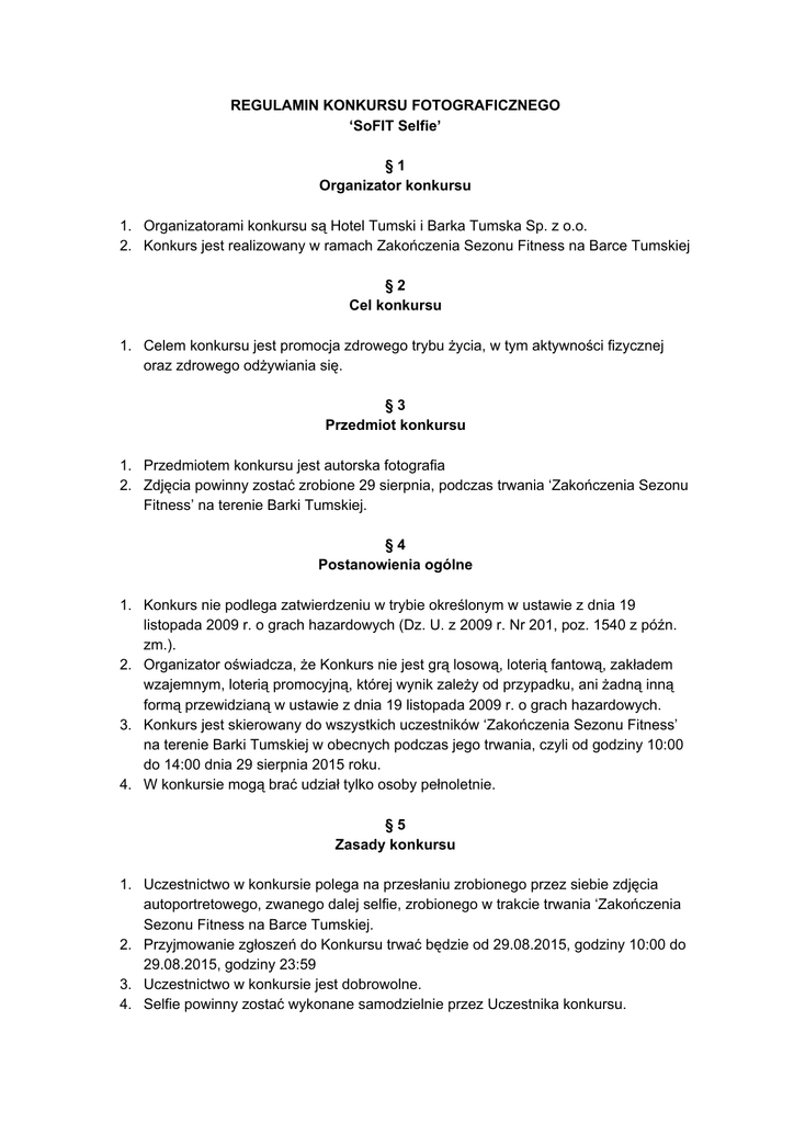 REGULAMIN KONKURSU FOTOGRAFICZNEGO ‘SoFIT Selfie’ § 1 Organizator konkursu 1. Organizatorami konkursu są Hotel Tumski i Barka Tumska Sp. z o.o. 2. Konkurs jest realizowany w ramach Zakończenia Sezonu Fitness na Barce Tumskiej § 2 Cel konkursu 1. Celem konkursu jest promocja zdrowego trybu życia, w tym aktywności fizycznej oraz zdrowego odżywiania się. 1. 2. 1. 2. 3. 4. § 3 Przedmiot konkursu Przedmiotem konkursu jest autorska fotografia Zdjęcia powinny zostać zrobione 29 sierpnia, podczas trwania ‘Zakończenia Sezonu Fitness’ na terenie Barki Tumskiej. § 4 Postanowienia ogólne Konkurs nie podlega zatwierdzeniu w trybie określonym w ustawie z dnia 19 listopada 2009 r. o grach hazardowych (Dz. U. z 2009 r. Nr 201, poz. 1540 z późn. zm.). Organizator oświadcza, że Konkurs nie jest grą losową, loterią fantową, zakładem wzajemnym, loterią promocyjną, której wynik zależy od przypadku, ani żadną inną formą przewidzianą w ustawie z dnia 19 listopada 2009 r. o grach hazardowych. Konkurs jest skierowany do wszystkich uczestników ‘Zakończenia Sezonu Fitness’ na terenie Barki Tumskiej w obecnych podczas jego trwania, czyli od godziny 10:00 do 14:00 dnia 29 sierpnia 2015 roku. W konkursie mogą brać udział tylko osoby pełnoletnie. 1. 2. 3. 4. § 5 Zasady konkursu Uczestnictwo w konkursie polega na przesłaniu zrobionego przez siebie zdjęcia autoportretowego, zwanego dalej selfie, zrobionego w trakcie trwania ‘Zakończenia Sezonu Fitness na Barce Tumskiej. Przyjmowanie zgłoszeń do Konkursu trwać będzie od 29.08.2015, godziny 10:00 do 29.08.2015, godziny 23:59 Uczestnictwo w konkursie jest dobrowolne. Selfie powinny zostać wykonane samodzielnie przez Uczestnika konkursu. 5. Jedna osoba może zgłosić na konkurs 4 selfie. 6. Selfie należy przesłać na adres: marketing@leogrupa.pl , wpisując w tytule wiadomości ‘SoFIT Selfie’. W treści maila należy podać swoje imię, nazwisko oraz telefon kontaktowy. Zdjęcia powinny być opisane według szablonu: imię_nazwisko.jpg. Rozmiar jednej fotografii nie powinien przekraczać 2 MB. 7. Należy dysponować ważną zgodą wyrażoną na piśmie, na użycie wizerunku osób widniejących na zdjęciu w ramach Konkursu (w przypadku osoby, która nie ukończyła 18. roku życia zgoda opiekuna prawnego), której dołączenie jest niezbędne do wzięcia udziału w konkursie, chyba że zachodzą okoliczności, o których mowa w art. 81 ust. 2 ustawy z dnia 4 lutego 1994 roku o prawie autorskim i prawach pokrewnych. 8. Zgłoszenie prac na konkurs uważane będzie za uznanie warunków regulaminu, wyrażenie zgody na publikowanie danych osobowych zgodnie z ustawą z dnia 28.08.1997 o ochronie danych osobowych (Dz. U. Nr 133 poz. 883) oraz przeniesienie praw autorskich w całości na rzecz Hotelu Tumskiego i Barki Tumskiej. 9. Zdjęcia, wysłane na adres: marketing@leogrupa.pl we wskazanym przez organizatora czasie zostaną opublikowane na fanpage’u Barki Tumskiej na portalu facebook.com.Zdjęcie, które uzyska największą liczbę polubień we wskazanym przez organizatora czasie wygrywa. 10. Głosowanie na najlepsze zdjęcie potrwa od 30.08.2015, godziny 9:00 do 31.08 godziny 23:59. 11. Rozstrzygnięcie konkursu nastąpi 1.09.2015 o godzinie 9:00 poprzez ogłoszenie zwycięzcy na fanpage’u Barki Tumskiej. 12. Nagrodą w konkursie jest Voucher na pobyt w SPA w Zamku Kliczków o wartości: 1300 PLN. 13. Nagroda nie podlega wymianie na inne nagrody lub ekwiwalent pieniężny. 14. Rozdanie nagród zwycięzcom konkursu nastąpi indywidualnie, po wcześniejszym kontakcie telefonicznym. Zwycięzcy powinni odebrać nagrody osobiście. 15. Zwycięzca traci prawo do nagrody w przypadkach wynikających z Regulaminu lub z przepisów prawa w szczególności, gdy nie jest pełnoletni. 16. Nieodebranie nagrody z przyczyn niezależnych od Organizatora, a leżących po stronie Zwycięzcy, z powodu nie spełnienia warunków Regulaminu lub odmowy przyjęcia, skutkuje utratą prawa do otrzymania nagrody przez Zwycięzcę Konkursu. § 6 Dane osobowe 1. Organizator będzie przechowywał dane osobowe uczestników konkursu w sposób zgodny z obowiązującymi przepisami, w tym w szczególności zabezpieczy je przed udostępnieniem osobom nieupoważnionym, zabraniem przez osobę nieuprawnioną, przetwarzaniem z naruszeniem ustawy oraz zmianą, utratą, uszkodzeniem lub zniszczeniem. 2. Uczestnik Konkursu ma prawo dostępu do treści swoich Danych osobowych oraz do ich poprawiania oraz ma prawo wnieść pisemne, umotywowane żądanie zaprzestania przetwarzania danych oraz wnieść sprzeciw wobec przetwarzania jego danych, w przypadkach wskazanych przez prawo. 3. Podanie Danych osobowych jest dobrowolne. Jednakże nie podanie Danych osobowych niezbędnych do kontaktu lub weryfikacji Zwycięzcy Konkursu prowadzi do odmowy przyznania prawa do Nagrody lub odmowy jej wydania. § 7 Postanowienia końcowe 1. W kwestiach nie uregulowanych w Regulaminie stosuje się obowiązujące przepisy prawa, w szczególności przepisy kodeksu cywilnego. 2. Organizator zastrzega możliwość wprowadzenia zmian do Konkursu z ważnych przyczyn. 3. Konkurs ten nie jest sponsorowany, administrowany, ani zorganizowany przez Facebook.