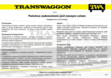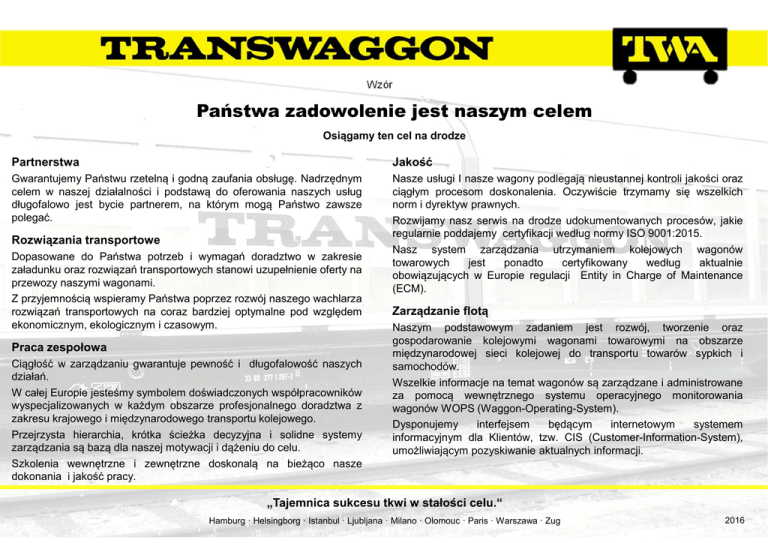 Wzór Państwa zadowolenie jest naszym celem Osiągamy ten cel na drodze Partnerstwa Jakość Gwarantujemy Państwu rzetelną i godną zaufania obsługę. Nadrzędnym celem w naszej działalności i podstawą do oferowania naszych usług długofalowo jest bycie partnerem, na którym mogą Państwo zawsze polegać. Nasze usługi I nasze wagony podlegają nieustannej kontroli jakości oraz ciągłym procesom doskonalenia. Oczywiście trzymamy się wszelkich norm i dyrektyw prawnych. Rozwijamy nasz serwis na drodze udokumentowanych procesów, jakie regularnie poddajemy certyfikacji według normy ISO 9001:2015. Nasz system zarządzania utrzymaniem kolejowych wagonów towarowych jest ponadto certyfikowany według aktualnie obowiązujących w Europie regulacji Entity in Charge of Maintenance (ECM). Rozwiązania transportowe Dopasowane do Państwa potrzeb i wymagań doradztwo w zakresie załadunku oraz rozwiązań transportowych stanowi uzupełnienie oferty na przewozy naszymi wagonami. Z przyjemnością wspieramy Państwa poprzez rozwój naszego wachlarza rozwiązań transportowych na coraz bardziej optymalne pod względem ekonomicznym, ekologicznym i czasowym. Praca zespołowa Ciągłość w zarządzaniu gwarantuje pewność i długofalowość naszych działań. W całej Europie jesteśmy symbolem doświadczonych współpracowników wyspecjalizowanych w każdym obszarze profesjonalnego doradztwa z zakresu krajowego i międzynarodowego transportu kolejowego. Przejrzysta hierarchia, krótka ścieżka decyzyjna i solidne systemy zarządzania są bazą dla naszej motywacji i dążeniu do celu. Szkolenia wewnętrzne i zewnętrzne doskonalą na bieżąco nasze dokonania i jakość pracy. Zarządzanie flotą Naszym podstawowym zadaniem jest rozwój, tworzenie oraz gospodarowanie kolejowymi wagonami towarowymi na obszarze międzynarodowej sieci kolejowej do transportu towarów sypkich i samochodów. Wszelkie informacje na temat wagonów są zarządzane i administrowane za pomocą wewnętrznego systemu operacyjnego monitorowania wagonów WOPS (Waggon-Operating-System). Dysponujemy interfejsem będącym internetowym systemem informacyjnym dla Klientów, tzw. CIS (Customer-Information-System), umożliwiającym pozyskiwanie aktualnych informacji. „Tajemnica sukcesu tkwi w stałości celu.“ Hamburg · Helsingborg · Istanbul · Ljubljana · Milano · Olomouc · Paris · Warszawa · Zug 2016
