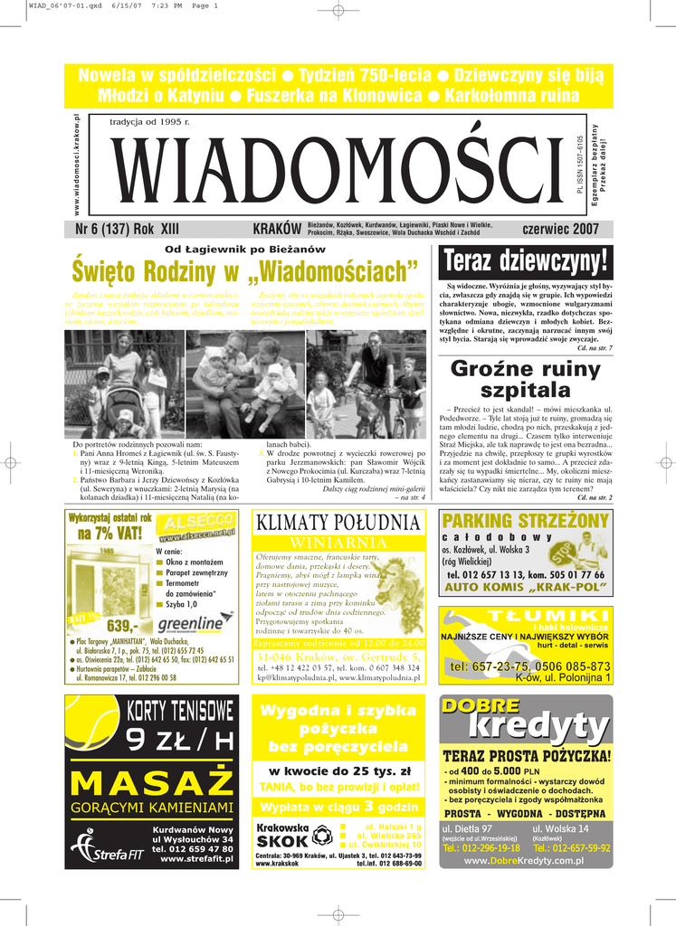 WIAD_06’07-01.qxd 6/15/07 7:23 PM Page 1 WIADOMOŚCI Nr 6 (137) Rok XIII KRAKÓW Bieżanów, Kozłówek, Kurdwanów, Łagiewniki, Piaski Nowe i Wielkie, Prokocim, Rżąka, Swoszowice, Wola Duchacka Wschód i Zachód E g z e m p l a r z b e z p ł a t ny Przekaż dalej! tradycja od 1995 r. PL ISSN 1507−6105 w w w. w i a d o m o s c i . k r a kow. p l Nowela w spółdzielczości ● Tydzień 750−lecia ● Dziewczyny się biją Młodzi o Katyniu ● Fuszerka na Klonowica ● Karkołomna ruina czerwiec 2007 Od £agiewnik po Bie¿anów Święto Rodziny w „Wiadomościach” Teraz dziewczyny! Zgodnie z naszą tradycją, składamy w czerwcu serdeczne życzenia wszystkim rozproszonym po kalendarzu członkom naszych rodzin, czyli babciom, dziadkom, mamom, ojcom, dzieciom... Życzymy, aby we wszystkich rodzinach zagościła zgoda, wzajemny szacunek, zdrowie, dostatek i uśmiech. Abyśmy tworzyli taką rodzinę także w wymiarze sąsiedzkim, dzielnicowym i ponadlokalnym. Są widoczne. Wyróżnia je głośny, wyzywający styl bycia, zwłaszcza gdy znajdą się w grupie. Ich wypowiedzi charakteryzuje ubogie, wzmocnione wulgaryzmami słownictwo. Nowa, niezwykła, rzadko dotychczas spotykana odmiana dziewczyn i młodych kobiet. Bezwzględne i okrutne, zaczynają narzucać innym swój styl bycia. Starają się wprowadzić swoje zwyczaje. Cd. na str. 7 Groźne ruiny szpitala Do portretów rodzinnych pozowali nam: 1. Pani Anna Hromeś z Łagiewnik (ul. św. S. Faustyny) wraz z 9-letnią Kingą, 5-letnim Mateuszem i 11-miesięczną Weroniką. 2. Państwo Barbara i Jerzy Dziewońscy z Kozłówka (ul. Seweryna) z wnuczkami: 2-letnią Marysią (na kolanach dziadka) i 11-miesięczną Natalią (na ko- Wykorzystaj ostatni rok KLIMATY POŁUDNIA na 7% VAT! W cenie: ■ Okno z montażem ■ Parapet zewnętrzny ■ Termometr do zamówienia* ■ Szyba 1,0 RATY 1% 639,− ● Plac Targowy „MANHATTAN”, lanach babci). 3. W drodze powrotnej z wycieczki rowerowej po parku Jerzmanowskich: pan Sławomir Wójcik z Nowego Prokocimia (ul. Kurczaba) wraz 7-letnią Gabrysią i 10-letnim Kamilem. Dalszy ciąg rodzinnej mini-galerii – na str. 4 Wola Duchacka, ul. Białoruska 7, I p., pok. 75, tel. (012) 655 72 45 ● os. Oświecenia 22a, tel. (012) 642 65 50, fax: (012) 642 65 51 ● Hurtownia parapetów – Zabłocie ul. Romanowicza 17, tel. 012 296 00 58 WINIARNIA Oferujemy smaczne, francuskie tarty, domowe dania, przekąski i desery. Pragniemy, abyś mógł z lampką wina, przy nastrojowej muzyce, latem w otoczeniu pachnącego ziołami tarasu a zimą przy kominku odpocząć od trudów dnia codziennego. Przygotowujemy spotkania rodzinne i towarzyskie do 40 os. Zapraszamy codziennie od 12.00 do 24.00 31−046 Kraków, św. Gertrudy 5, tel. +48 12 422 03 57, tel. kom. 0 607 348 324 [email protected], www.klimatypoludnia.pl – Przecież to jest skandal! – mówi mieszkanka ul. Podedworze. – Tyle lat stoją już te ruiny, gromadzą się tam młodzi ludzie, chodzą po nich, przeskakują z jednego elementu na drugi... Czasem tylko interweniuje Straż Miejska, ale tak naprawdę to jest ona bezradna... Przyjedzie na chwilę, przepłoszy te grupki wyrostków i za moment jest dokładnie to samo... A przecież zdarzały się tu wypadki śmiertelne... My, okoliczni mieszkańcy zastanawiamy się nieraz, czy te ruiny nie mają właściciela? Czy nikt nie zarządza tym terenem? Cd. na str. 2 PARKING STRZEŻONY c a ł o d o b o w y os. Kozłówek, ul. Wolska 3 (róg Wielickiej) tel. 012 657 13 13, kom. 505 01 77 66 AUTO KOMIS „KRAK−POL” WIAD_06’07-01.qxd 6/15/07 7:23 PM Page 2 2 WIADOMOŚCI Fuszerka na Klonowica Ruiny wciąż groźne Otrzymaliśmy liczne, krytyczne, uzasadnione sygnały w sprawie zakończenia remontu I odcinka ul. Klonowica, od skrzyżowania z ul. Sławka. I mieszkańcy, i kierowcy stukają się w czoło, jak można było w takim stanie oddać do użytku ten ważny ciąg komunikacyjny. – Jeździ się teraz po tym, „jak na fali na wesołym miasteczku” – powiedział nam jeden z pracowników pobliskiego zakładu usługowego. – Chodzi o to, że nie wyrównano nawierzchni frezarkami – dodaje drugi. Rzeczywiście, nawierzchnia wygląda jak nowa, ale z nowością nie ma nic wspólnego. Licznie przejeżdżający tamtędy autobusy w try miga pogłębią fuszerkę. Jak można było coś takiego zrobić?! Z kolei zbulwersowani mieszkańcy pokazują na spękane od ciężkiego sprzętu zdewastowane płyty chodnikowe (na zdjęciu). Czy i kto odebrał te prace? I czy na tym miały one polegać? Rozpoczęliśmy poszukiwanie sprawców... W Krakowskim Zarządzie Komunalnym dowiedzieliśmy się, że „remont nawierzchni wykonywała firma Omega na zlecenie MPWiK, jako jej odtworzenie”. – Zatem w Wodociągach proszę pytać czy są zadowoleni z wykonanej przez firmę pracy. Nasi inspektorzy potwierdzają, że nawierzchnia jest obecnie nierówna i pozostawia wiele do życzenia. Niestety, nic nie wskazuje na to, abyśmy w najbliższym czasie remontowali chodniki na ul. Klonowica, bowiem nie mamy na to w tym roku pieniędzy – powiedział nam rzecznik KZK, Jacek Bartlewicz. Odesłani do MPWiK, szukaliśmy wyjaśnienia u rzecznika tego przedsiębiorstwa, Piotra Ziętary. Oto one: „1. Na odcinku ok. 200 m miała miejsce budowa sieci kanalizacyjnej wraz z przyłączami. 2. W wyniku uzgodnień z zarządcą drogi (którym jest KZK), MPWiK było zobowiązane do odtworzenia nawierzchni na odcinku, który obejmowały roboty. 3. Wykonane prace do tej pory nie zostały odebrane przez zarządcę drogi (podkreślenie od red.).” Z tego wynika, że I etap modernizacji ul. Klonowica, polegający na wykonaniu przyłączy wodociągowych, już stał się zarzewiem sporu. Na własnej skórze odczuwają to mieszkańcy, kierowcy i pasażerowie. Oby to trwało jak najkrócej! Tekst i foto: (Kaj) Nie mogli dojechać... W poprzednim numerze pisaliśmy o utrudnieniach, jakie ma Straż Pożarna z dojazdami do miejsc zagrożenia. E