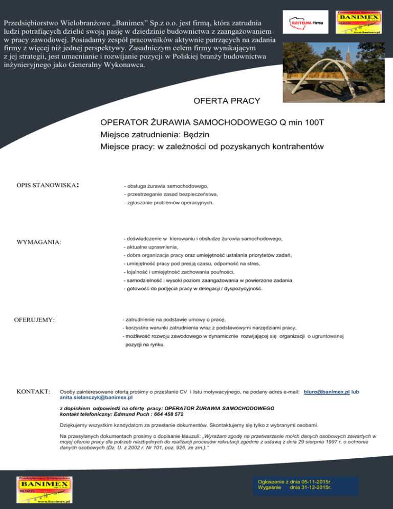 Przedsiębiorstwo Sp.zz o.o. o.o. jest jestfirmą firmą, która zatrudnia OFERUJEMY: Wielobranżowe Przedsiębiorstwo Wielobranżowe „„Banimex” BANIMEX” Sp. która zatrudnia ludzi ludzi potrafiących dzielić swoją pasję w dziedzinie budownictwa z zaangażowaniem potrafiących dzielić swoją pasję w dziedzinie budownictwa z zaangażowaniem w , w pracy pracy zawodowej. zawodowej.Posiadamy Posiadamyzespół zespółpracowników pracowników aktywnie patrzących zadania aktywnie patrzących na na zadania firmy z więcej niż jednej perspektywy. Zasadniczym celem firmy wynikającym firmy z więcej niż jednej perspektywy .Zasadniczym celem firmy wynikającym z jego z jej strategii, jestumacnianie umacnianiei i rozwijanie rozwijanie pozycji pozycji ww Polskiej strategii, jest Polskiej branży branży budownictwa budownictwa inżynieryjnego jako Generalny Wykonawca. inżynieryjnego jako Generalny Wykonawca. OFERTA PRACY OPERATOR ŻURAWIA SAMOCHODOWEGO Q min 100T Miejsce zatrudnienia: Będzin Miejsce pracy: w zależności od pozyskanych kontrahentów OPIS STANOWISKA: - obsługa żurawia samochodowego, - przestrzeganie zasad bezpieczeństwa, - zgłaszanie problemów operacyjnych. WYMAGANIA: - doświadczenie w kierowaniu i obsłudze żurawia samochodowego, - aktualne uprawnienia, - dobra organizacja pracy oraz umiejętność ustalania priorytetów zadań, - umiejętność pracy pod presją czasu, odporność na stres, - lojalność i umiejętność zachowania poufności, - samodzielność i wysoki poziom zaangażowania w powierzone zadania, - gotowość do podjęcia pracy w delegacji / dyspozycyjność. technologia OFERUJEMY: - zatrudnienie na podstawie umowy o pracę, - korzystne warunki zatrudnienia wraz z podstawowymi narzędziami pracy, - możliwość rozwoju zawodowego w dynamicznie rozwijającej się organizacji o ugruntowanej pozycji na rynku. KONTAKT: Osoby zainteresowane ofertą prosimy o przesłanie CV i listu motywacyjnego, na podany adres e-mail: [email protected] lub [email protected] z dopiskiem odpowiedź na ofertę pracy: OPERATOR ŻURAWIA SAMOCHODOWEGO kontakt telefoniczny: Edmund Puch : 664 458 572 Dziękujemy wszystkim kandydatom za przesłanie dokumentów. Skontaktujemy się tylko z wybranymi osobami. Na przesyłanych dokumentach prosimy o dopisanie klauzuli: „Wyrażam zgodę na przetwarzanie moich danych osobowych zawartych w mojej ofercie pracy dla potrzeb niezbędnych do realizacji procesów rekrutacji zgodnie z ustawą z dnia 29 sierpnia 1997 r. o ochronie danych osobowych (Dz. U. z 2002 r. Nr 101, poz. 926, ze zm.).” Ogłoszenie z dnia 05-11-2015r . Wygaśnie dnia 31-12-2015r.