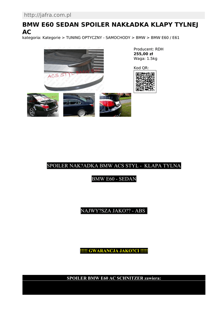 http://jafra.com.pl BMW E60 SEDAN SPOILER NAKŁADKA KLAPY TYLNEJ AC kategoria: Kategorie > TUNING OPTYCZNY - SAMOCHODY > BMW > BMW E60 / E61 Producent: RDH 255,00 zł Waga: 1.5kg Kod QR: SPOILER NAK?ADKA BMW ACS STYL - KLAPA TYLNA BMW E60 - SEDAN NAJWY?SZA JAKO?? - ABS !!!!! GWARANCJA JAKO?CI !!!!! SPOILER BMW E60 AC SCHNITZER zawiera: strona: 1/2 wydrukowano: 02-03-2017 http://jafra.com.pl/spoiler-bmw-e60-sedan-nakladka-klapa-tylna-acs-style-jafra-szczecin.html - KOLOR: Szary - do malowania - Profil spoilera pe?ny zamkni?ty - JEDEN ELEMENT: 1. Jeden Spoiler wykonany z wysokiej jako?? ABS'u, bardzo lekki i wytrzyma?y - ACS Style ( nie tak jak spoilery podróby wykonane z bardzo s?abej jako?ci materia?ów ) 2. Emblemat ACS - kolor czarny lub srebrny 3. Pasuje idealnie, le?y jak orygina? 4. Bardzo prosty monta? na ta?me dwustronn? najlepiej 3M ( brak ), Spoiler przy monta?u warto wzmocni? w trzech miejscach klejem do szyb lub specjalnym silikonem, który mamy równie? w ofercie 5. Spoiler nadaje agresywnego i sportowego wygl?du 6. Zastosowanie do BMW E60-SEDAN - 2003 - 2010, strona: 2/2 wydrukowano: 02-03-2017 http://jafra.com.pl/spoiler-bmw-e60-sedan-nakladka-klapa-tylna-acs-style-jafra-szczecin.html