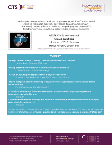 Jak bezpiecznie przetwarzać dane i zapewnić prywatność w chmurze? Jakie są regulacje prawne, dotyczące Cloud Computingu? Jak rozwija się on w Polsce i jakie są perspektywy na przyszłość? Między innymi na te pytania odpowiedzą eksperci podczas: BEZPŁATNEJ konferencji Cloud Solutions 19 marca 2013, Kraków Hotel Hilton Garden Inn http://platiniumcast.pl/cloud-solutions-19-03-2013-krakow Wykłady: - Dokąd zmierza SaaS? -‐ trendy i perspektywa aplikacji w chmurze Miłosz Baluś (HumanoIT Group) - Usługi przetwarzania danych w chmurze w polskich firmach Paweł Olszynka (PMR Consulting) - Cloud computing a bezpieczeństwo danych osobowych Xawery Konarski (Traple Konarski Podrecki i Wspólnicy) - Nowe narzędzia cloud computing w zapewnieniu usług bezpieczeństwa i zarządzania infrastrukturą IT Piotr Olewniczak (Panda Security) - Korzyści z wirtualnych środowisk testowych przy tworzeniu krytycznych systemów informatycznych dla biznesu Parasoft - Budowanie środowisk testowych w oparciu o wirtualizację komponentów współczesnych systemów informatycznych Parasoft Na zakończenie konferencji trener Paweł Zdziarski z firmy szkoleniowej CTS poprowadzi dyskusję na temat: "Mobilność w chmurze - przykładowe rozwiązania w oparciu o Microsoft Office 365" CTS Customized Training Solutions Sp. z o.o., ul. Filipinki 20, 02-207 Warszawa NIP: 5271006543; Regon: 010749701 [email protected] [email protected] www.cts.com.pl +48 22 838 52 70 +48 22 838 88 78 +48 22 838 19 08 Konferencję kierujemy do przedstawicieli firm wykorzystujących omawiane zagadnienia. Zapraszamy reprezentantów branż: bankowej, finansowej, administracji, ubezpieczeń, telekomunikacji, przemysłu, informatycznej, usługowej. W szczególności zapraszamy: kadry wyższego i średniego szczebla Szefów departamentów ds. IT, bezpieczeństwa, CSO, CIO, Dyrektorów, kierowników odpowiedzialnych za wdrażanie nowych technologii, Administratorów Cloud Computing Udział w konferencji jest bezpłatny, wystarczy wcześniejsza rejestracja na stronie wydarzenia: http://platiniumcast.pl/formularz-cloud-solutions-19-03-2013 Udział jest płatny dla przedstawicieli firm sprzedających rozwiązania/produkty dotyczące tematu konferencji Dla uczestników konferencji przewidziane zostały NAGRODY: 1. 10 oprogramowań antywirusowych ufundowanych przez firmę Panda Security 2. Książki ufundowane przez wydawnictwo Znak Litera Nova 3. Bezpłatne szkolenie przygotowujące do egzaminu CCSK ufundowane przez Cloud Security Alliance 4. Każdy uczestnik otrzyma Kartę Smakosza - karta zniżkowa do restauracji w całej Polsce 5. Każdy z uczestników otrzyma 20 % rabatu na szkolenie przygotowujące do egzaminu CCSK http://platiniumcast.pl/szkolenia Ilość miejsc jest ograniczona! Zapraszamy do rejestracji już dziś! Więcej informacji i kolejne edycje: www.platiniumcast.pl CTS Customized Training Solutions Sp. z o.o., ul. Filipinki 20, 02-207 Warszawa NIP: 5271006543; Regon: 010749701 [email protected] [email protected] www.cts.com.pl +48 22 838 52 70 +48 22 838 88 78 +48 22 838 19 08