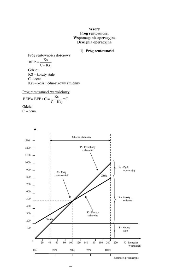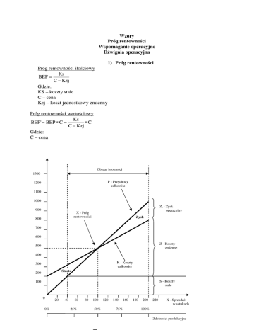Wzory Próg rentowności Wspomaganie operacyjne Dźwignia operacyjna 1) Próg rentowności Próg rentowności ilościowy Ks BEP = C − Kzj Gdzie: KS – koszty stałe C – cena Kzj – koszt jednostkowy zmienny Próg rentowności wartościowy Ks BEP' = BEP ∗ C = ∗C C − Kzj Gdzie: C – cena Obszar istotności 1300 P - Przychody całkowite 1200 1100 1000 Zs - Zysk operacyjny 900 X - Próg rentowności 800 Zysk 700 600 Z - Koszty zmienne 500 400 K - Koszty całkowite 300 Strata 200 S - Koszty stałe 100 0 0% 20 40 60 25% 80 100 50% 120 140 160 75% 180 200 220 X - Sprzedaż w sztukach 100% Zdolności produkcyjne Margines bezpieczeństwa w wartościach bezwzględnych Bp=Q-BEP Margines bezpieczeństwa w wielkościach względnych WB = Q − BEP ∗100% Q Udział progu rentowności w maksymalnej mocy zdolności produkcyjnych BEP' ' = BEP Pmax Pmax – maksymalna ilość produkcji przy obecnym stanie majątku. Produkcja wieloasortymentowa Szacując próg rentowności w przypadku produkcji wieloasortymentowej należy obliczyć ważoną cenę i koszt udziałami poszczególnych produktów w sprzedaży. c' = c A * u A + cB * u B + ... + cn * un k ' = k jz A * u A + k jz B * u B + ... + k jz n * un Po obliczeniu ważonej ceny i kosztu jednostkowego podstawiamy do wzoru: BEP = KS C '− Kzj ' Wzór wyznaczający wysokość produkcji przy założeniu że chcemy osiągnąć określony poziom zysku. Px = Ks + zysk C − Kzj 2. Wspomaganie operacyjne Gdzie: d- stopa marży (d=c-kjz) 3). Stopień dźwigni operacyjnej o W ujęciu statycznym (służy do obliczenia relacji, które zaszły w poprzednich okresach) DOL = S − KZ MBc = S − KZ − KS EBIT ; gdzie S-sprzedaż, KZ - koszty zmienne, MB – marża brutto całkowita EBIT – zysk operacyjny (Zysk brutto plus odsetki) • w ujęciu dynamicznym (służy w analizie ex ante) DOL = %∆EBIT %∆S czyli %delta EBIT = % delta S * DOL Np. DOL=2,5 . Oznacza to, że przy wzroście sprzedaży o 10 %, nastąpi wzrost zysku operacyjnego o 25 % (2,5*10%) DOL można wyrazić również za pomocą współczynnika bezpieczeństwa (margines bezpieczeństwa).