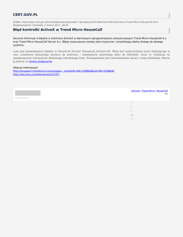 CERT.GOV.PL Źródło: http://www.cert.gov.pl/cer/wiadomosci/poprawki-i-aktualizacj/207,Blad-kontrolki-ActiveX-w-Trend-Micro-HouseCall.html Wygenerowano: Czwartek, 2 marca 2017, 18:25 Błąd kontrolki ActiveX w Trend Micro HouseCall Secunia informuje o błędzie w kontrolce ActiveX w darmowym oprogramowaniu antywirusowym Trend Micro HouseCall 6.x oraz Trend Micro HouseCall Server 6.x. Błędy oszacowane zostały jako krytyczne i umożliwiają zdalny dostęp do danego systemu. Luka jest spowodowana błędem w HouseCall ActiveX (Housecall_ActiveX.dll). Może być wykorzystana przez atakującego w celu ustawienia fałszywego serwera do pobrania i załadowania dowolnego pliku do biblioteki. Grozi to instalacją na zaatakowanym komputerze dowolnego szkodliwego kodu. Rozwiązaniem jest zainstalowanie wersji z nową biblioteką. Można ją pobrać ze strony producenta. Więcej informacji: http://esupport.trendmicro.com/suppor...ontentID=EN-1038646&id=EN-1038646 http://secunia.com/Advisories/31337/ ActiveX, Trend Micro, HouseCall PS Ocena: 0/5 (0)