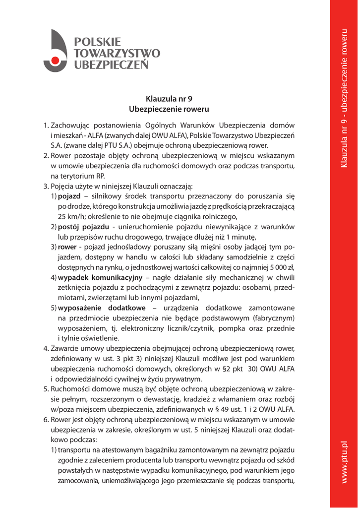 Klauzula nr 9 - ubezpieczenie roweru 1.Zachowując postanowienia Ogólnych Warunków Ubezpieczenia domów i mieszkań - ALFA (zwanych dalej OWU ALFA), Polskie Towarzystwo Ubezpieczeń S.A. (zwane dalej PTU S.A.) obejmuje ochroną ubezpieczeniową rower. 2.Rower pozostaje objęty ochroną ubezpieczeniową w miejscu wskazanym w umowie ubezpieczenia dla ruchomości domowych oraz podczas transportu, na terytorium RP. 3.Pojęcia użyte w niniejszej Klauzuli oznaczają: 1)pojazd – silnikowy środek transportu przeznaczony do poruszania się po drodze, którego konstrukcja umożliwia jazdę z prędkością przekraczającą 25 km/h; określenie to nie obejmuje ciągnika rolniczego, 2)postój pojazdu - unieruchomienie pojazdu niewynikające z warunków lub przepisów ruchu drogowego, trwające dłużej niż 1 minutę, 3)rower - pojazd jednośladowy poruszany siłą mięśni osoby jadącej tym pojazdem, dostępny w handlu w całości lub składany samodzielnie z części dostępnych na rynku, o jednostkowej wartości całkowitej co najmniej 5 000 zł, 4)wypadek komunikacyjny – nagłe działanie siły mechanicznej w chwili zetknięcia pojazdu z pochodzącymi z zewnątrz pojazdu: osobami, przedmiotami, zwierzętami lub innymi pojazdami, 5)wyposażenie dodatkowe – urządzenia dodatkowe zamontowane na przedmiocie ubezpieczenia nie będące podstawowym (fabrycznym) wyposażeniem, tj. elektroniczny licznik/czytnik, pompka oraz przednie i tylnie oświetlenie. 4.Zawarcie umowy ubezpieczenia obejmującej ochroną ubezpieczeniową rower, zdefiniowany w ust. 3 pkt 3) niniejszej Klauzuli możliwe jest pod warunkiem ubezpieczenia ruchomości domowych, określonych w §2 pkt 30) OWU ALFA i odpowiedzialności cywilnej w życiu prywatnym. 5.Ruchomości domowe muszą być objęte ochroną ubezpieczeniową w zakresie pełnym, rozszerzonym o dewastację, kradzież z włamaniem oraz rozbój w/poza miejscem ubezpieczenia, zdefiniowanych w § 49 ust. 1 i 2 OWU ALFA. 6.Rower jest objęty ochroną ubezpieczeniową w miejscu wskazanym w umowie ubezpieczenia w zakresie, określonym w ust. 5 niniejszej Klauzuli oraz dodatkowo podczas: 1)transportu na atestowanym bagażniku zamontowanym na zewnątrz pojazdu zgodnie z zaleceniem producenta lub transportu wewnątrz pojazdu od szkód powstałych w następstwie wypadku komunikacyjnego, pod warunkiem jego zamocowania, uniemożliwiającego jego przemieszczanie się podczas transportu, www.ptu.pl Klauzula nr 9 Ubezpieczenie roweru Klauzula nr 9 - ubezpieczenie roweru www.ptu.pl 2)transportu wewnątrz pojazdu w zakresie rozboju, 3)postoju pojazdu od kradzieży z włamaniem oraz rozboju, 4)kradzieży pojazdu wraz z rowerem przechowywanym wewnątrz pojazdu lub na bagażniku rowerowym, 5)użytkowania przedmiotu ubezpieczenia poza miejscem ubezpieczenia w zakresie rozboju. 7.Zachowując postanowienia określone w §34 oraz §50 OWU ALFA, PTU S.A. nie odpowiada za szkody: 1)jeżeli nie dochowano wymogów zabezpieczenia przedmiotu ubezpieczenia, o których mowa w ust. 8 oraz w ust. 6 pkt 1) niniejszej Klauzuli, 2)polegające na kradzieży z włamaniem przedmiotu ubezpieczenia z pomieszczeń przynależnych znajdujących się w budynku wielomieszkaniowym, 3)polegające na kradzieży pojazdu, którym przewożony jest przedmiot ubezpieczenia, 4)powstałe w częściach zamiennych i zapasowych przedmiotu ubezpieczenia, 5)polegające na pobrudzeniu, pomazaniu, zachlapaniu, pomalowaniu, porysowaniu oraz graffiti, 6)powstałych w wyniku naturalnego zużycia przedmiotu ubezpieczenia. 8.Przez należyte zabezpieczenie przedmiotu ubezpieczenia przed kradzieżą z włamaniem i rozbojem w czasie transportu oraz postoju pojazdu rozumie się: 1)postój na parkingach strzeżonych lub na oświetlonych parkingach przy stacjach benzynowych, w polu widzenia kamer, w przypadku postoju pojazdu na stacji benzynowej, jeżeli kradzież przewożonego przedmiotu ubezpieczenia została ujawniona bezpośrednio w miejscu postoju, 2)pozostawienie pojazdu wraz z przedmiotem ubezpieczenia w miejscach określonych w ust. 8 pkt 1) jest jego uprzednie zabezpieczenie przez wyjęcie kluczyka ze stacyjki, zamknięcie zamków, jak również uruchomienie atestowanego systemu alarmowego lub użycie innych elektronicznych i mechanicznych systemów zabezpieczeń, jeżeli takie są zainstalowane w pojeździe (immobiliser, blokada skrzyni biegów, kierownicy, hamulców), 3)zamknięcie uniemożliwiające zdjęcie przedmiotu ubezpieczenia z bagażnika rowerowego bez pozostawienia śladów użycia siły lub narzędzi – poprzez zniszczenie zamka lub inne mechaniczne uszkodzenie zabezpieczenia. 9.Objęcie ochroną ubezpieczeniową roweru, o którym mowa w ust. 3 pkt 3) niniejszej Klauzuli jest możliwe po spełnieniu łącznie następujących warunków: 1)do wniosku o zawarcie umowy ubezpieczenia wg OWU ALFA Ubezpieczający dołącza aktualne zdjęcie przedmiotu ubezpieczenia (roweru) – wymóg nie dotyczy bezszkodowej kontynuacji umowy ubezpieczenia, 2)do wniosku o ubezpieczenie Ubezpieczający dołącza następujące informacje: a)nazwę roweru, b)marka i model roweru, c)nazwę producenta, d)numer indentyfikacyjny (jeżeli jest to możliwe), e)wykaz wyposażenia dodatkowego, f )sumę ubezpieczenia. Klauzula nr 9 - ubezpieczenie roweru www.ptu.pl 10. Sumę ubezpieczenia dla roweru ustala Ubezpieczający w systemie sum stałych, na podstawie wartości odtworzeniowej (nowej) lub rzeczywistej, zdefiniowanych w OWU ALFA dla ruchomości domowych. 11. Odszkodowanie za utracony lub uszkodzony rower wylicza się jak dla ruchomości domowych wg OWU ALFA, z tym że w przypadku roweru składanego samodzielnie przez Ubezpieczającego uwzględnia się przedstawione przez niego rachunki na zakup poszczególnych podzespołów, a w przypadku braku takich rachunków – na podstawie cen analogicznych części z dnia ustalenia odszkodowania. 12. W odniesieniu do ubezpieczenia odpowiedzialności cywilnej w życiu prywatnym PTU S.A. udziela dodatkowo