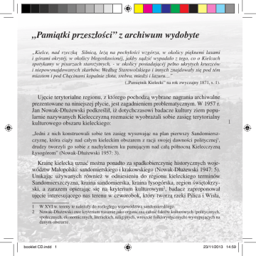 „Pamiątki przeszłości” z archiwum wydobyte „Kielce, nad rzeczką Silnicą, leżą na pochyłości wzgórza, w okolicy pięknemi lasami i górami okrytéj, w okolicy błogosławionéj, jakby sądzić wypadało z tego, co o Kielcach spotykamy w pisarzach starożytnych, - w okolicy posiadającéj pełno ukrytych kruszców i niepowynajdowanych skarbów. Według Starowolskiego i innych znajdowały się pod tém miastem i pod Chęcinami kopalnie złota, srebra, miedzi i lazuru…” („Pamiętnik Kielecki” na rok zwyczajny 1871, s. 1). Ujęcie terytorialne regionu, z którego pochodzą wybrane nagrania archiwalne prezentowane na niniejszej płycie, jest zagadnieniem problematycznym. W 1957 r. Jan Nowak-Dłużewski podkreślił, iż dotychczasowi badacze kultury ziem popularnie nazywanych Kielecczyzną rozmaicie wyobrażali sobie zasięg terytorialny kulturowego obszaru kieleckiego: 1 „Jedni z nich konstruowali sobie ten zasięg wysuwając na plan pierwszy Sandomierszczyznę, która ciąży nad całym kieleckim obszarem z racji swojej dawności politycznej1, drudzy tworzyli go sobie z nachyleniem ku panującym nad całą północną Kielecczyzną Łysogórom” (Nowak-Dłużewski 1957: 3). Krainę kielecką uznać można ponadto za spadkobierczynię historycznych województw Małopolski: sandomierskiego i krakowskiego (Nowak-Dłużewski 1947: 5). Unikając używanych również w odniesieniu do regionu kieleckiego terminów Sandomierszczyzna, kraina sandomierska, kraina łysogórska, region świętokrzyski, a zarazem opierając się na kryterium kulturowym2, badacz zaproponował ujęcie interesującego nas terenu w czworobok, który tworzą rzeki Pilica i Wisła, 1 W XVI w. tereny te należały do rozległego województwa sandomierskiego. 2 Nowak-Dłużewski owo kryterium rozumie jako organiczną całość faktów kulturowych (politycznych, społecznych, ekonomicznych, literackich, religijnych, wreszcie folklorystycznych) występujących na danym obszarze. booklet CD.indd 1 23/11/2013 14:59 2 odcinający się od Krakowskiego rzekami Szreniawą i Dłubnią, zaś od Mazowsza Pilicą. W tak ujętym regionie umiejscawiamy znacznie mniejszy obszar określony wyborem nagrań dokumentalnych, prezentujących zarówno centrum, skupione wokół samych Kielc, jak również tereny oddalone od centrum w różnych kierunkach, tworzące specyficzne subregiony oraz obszary przejściowe szeroko pojętej Kielecczyzny3. W przypadku tych drugich łatwo usłyszymy charakterystyczne nakładanie się elementów muzycznych przenikających do omawianego regionu np. z Krakowskiego. Ową osmozę kulturową widać nie tylko w muzyce tradycyjnej. Na zróżnicowany charakter kultury ludowej Kieleckiego – podkreślany również przez etnografów – miały wpływ otaczające regiony. Już Oskar Kolberg, który z racji współczesnych sobie podziałów administracyjnych Kieleckie pojmował szeroko, dostrzegał wpływy Śląska od zachodu (od Siewierza i Sławkowa) w kierunku miejscowości Irządze, Sędziszowa, Kozłowa, aż po Włoszczową, zaś wpływy Sandomierskiego od wschodu. Od południa przenikał na omawiany region repertuar krakowski. Omawiany teren pod względem językowym zaliczany jest do Małopolski. Najogólniej rzecz ujmując, należy podkreślić przejściowy charakter całej Kielecczyzny między Małopolską a Mazowszem i Polską centralną. Widać to wyraźnie choćby na przykładzie stroju ludowego, gdzie na północ od Gór Świętokrzyskich występują typowe dla Mazowsza pasiaki (opoczyńskie, radomskie, koneckie), na wschód i południe widać w stroju cechy sandomierskie, zaś mieszkańcy rejonów Buska, Jędrzejowa czy Skalbmierza nosili stroje krakowiaków wschodnich, co utrwalają do dziś tamtejsze zespoły folklorystyczne. 3 Staraliśmy się jednak jak najpełniej ukazać rejon centralny, zogniskowany wokół Kielc. W pozostałych przypadkach, ze względu na planowaną kontynuację niniejszej serii płytowej, ograniczyliśmy się jedynie do zasygnalizowania cech muzycznych i repertuaru kilkoma przykładami. Wyjątkiem są tu subregiony Włoszczowski, Pińczowski i Jędrzejowski, obficie udokumentowane w latach 50. XX w. przez Ekipę Kielecką Akcji Zbierania Folkloru Muzycznego. Takie ujęcie wykracza z kolei poza węziej pojmowaną Kielecczyznę ograniczoną od południowego zachodu linią Przedbórz-Włoszczowa-Jędrzejów, nie wykracza zaś, z uwagi na zwarty, etnomuzyczny charakter Opoczyńskiego i Radomskiego, poza północną linię Zawichost-Iłża-Szydłowiec-Przysucha-Opoczno-Sulejów (Pilichowie 1979: 4). booklet CD.indd 2 23/11/2013 14:59 „Góry Świętokrzyskie zamieszkuje ludność o nieco odmiennym typie antropologicznym wywodząca się ze starego osadnictwa. Grupa ta, jak zresztą większość grup górskich, charakteryzuje się kulturą bardziej zachowawczą w stosunku do sąsiadów […]. Tereny kieleckie, włoszczowskie i częściowo koneckie zamieszkuje grupa o charakterze przejściowym, podlegająca na południu wpływom krakowskim, a na północy i zachodzie sieradzkim. Określa się ją zwykle mianem grupy kieleckiej. Bardziej na północ mieszkająca grupa radomska, posiadająca bardzo wiele cech kultury puszczańskiej, podlegała od dawna silnym wpływom sąsiedniego Mazowsza” (Kamocki 1965: 107). Szerokie i umowne pojęcie „Dawnej Kielecczyzny” czy Ziemi Kieleckiej odnoszone jest zwykle do podziału administracyjnego Polski międzywojennej. Rozległe bowiem ówczesne województwo kieleckie obejmowało swym zasięgiem największy w historii jego przemian obszar z Zagłębiem Dąbrowskim, Częstochową, Opocznem, Radomiem, Dęblinem, Szczucinem, Proszowicami, Skalbmierzem i Miechowem. W takim ujęciu należy podkreślić duże zróżnicowanie grup etnograficznych zamieszkujących określony teren: Krakowiaków, Proszowiaków, Sandomierzan, ludu kieleckiego i radomskiego oraz tzw. Mazurów galicyjskich. Także po II wojnie światowej – zwłaszcza w l