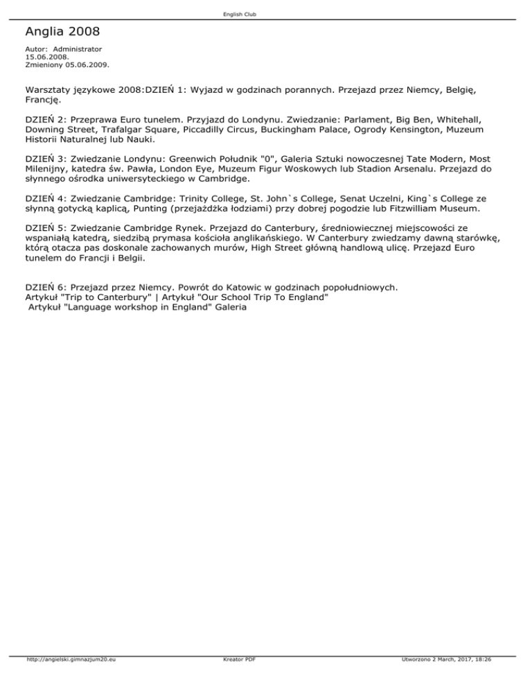 English Club Anglia 2008 Autor: Administrator 15.06.2008. Zmieniony 05.06.2009. Warsztaty językowe 2008:DZIEŃ 1: Wyjazd w godzinach porannych. Przejazd przez Niemcy, Belgię, Francję. DZIEŃ 2: Przeprawa Euro tunelem. Przyjazd do Londynu. Zwiedzanie: Parlament, Big Ben, Whitehall, Downing Street, Trafalgar Square, Piccadilly Circus, Buckingham Palace, Ogrody Kensington, Muzeum Historii Naturalnej lub Nauki. DZIEŃ 3: Zwiedzanie Londynu: Greenwich Południk "0", Galeria Sztuki nowoczesnej Tate Modern, Most Milenijny, katedra św. Pawła, London Eye, Muzeum Figur Woskowych lub Stadion Arsenalu. Przejazd do słynnego ośrodka uniwersyteckiego w Cambridge. DZIEŃ 4: Zwiedzanie Cambridge: Trinity College, St. John`s College, Senat Uczelni, King`s College ze słynną gotycką kaplicą, Punting (przejażdżka łodziami) przy dobrej pogodzie lub Fitzwilliam Museum. DZIEŃ 5: Zwiedzanie Cambridge Rynek. Przejazd do Canterbury, średniowiecznej miejscowości ze wspaniałą katedrą, siedzibą prymasa kościoła anglikańskiego. W Canterbury zwiedzamy dawną starówkę, którą otacza pas doskonale zachowanych murów, High Street główną handlową ulicę. Przejazd Euro tunelem do Francji i Belgii. DZIEŃ 6: Przejazd przez Niemcy. Powrót do Katowic w godzinach popołudniowych. Artykuł "Trip to Canterbury" | Artykuł "Our School Trip To England" Artykuł "Language workshop in England" Galeria http://angielski.gimnazjum20.eu Kreator PDF Utworzono 2 March, 2017, 18:26