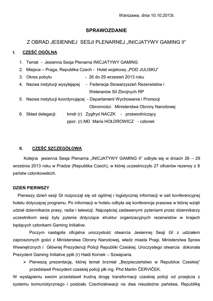 Warszawa, dnia 10.10.2013r. SPRAWOZDANIE Z OBRAD JESIENNEJ SESJI PLENARNEJ „INICJATYWY GAMING II” I. CZĘŚĆ OGÓLNA 1. Temat - Jesienna Sesja Plenarna INICJATYWY GAMING 2. Miejsce – Praga, Republika Czech - Hotel wojskowy „POD JULISKU” 3. Okres pobytu - 26 do 29 wrzesień 2013 roku 4. Nazwa instytucji wysyłającej - Federacja Stowarzyszeń Rezerwistów i Weteranów Sił Zbrojnych RP 5. Nazwa instytucji koordynującej - Departament Wychowania i Promocji Obronności Ministerstwa Obrony Narodowej 6. Skład delegacji: kmdr (r) Zygfryd NACZK - przewodniczący ppor. (r) MD Maria HOŁDROWICZ - członek II. CZĘŚĆ SZCZEGÓŁOWA Kolejna jesienna Sesja Plenarna „INICJATYWY GAMING II” odbyła się w dniach 26 – 29 września 2013 roku w Pradze (Republika Czech), w której uczestniczyło 27 oficerów rezerwy z 8 państw członkowskich. DZIEŃ PIERWSZY Pierwszy dzień sesji GI rozpoczął się od ogólnej i logistycznej informacji w sali konferencyjnej hotelu dotyczącej programu. Po informacji w hotelu odbyła się konferencja prasowa w której wzięli udział dziennikarze prasy, radia i telewizji. Najczęściej zadawanymi pytaniami przez dziennikarzy uczestnikom sesji były pytania dotyczące struktur organizacyjnych rezerwistów w krajach będących członkami Gaming Initiative. Poczym nastąpiła oficjalna uroczystość otwarcia Jesiennej Sesji GI z udziałem zaproszonych gości z Ministerstwa Obrony Narodowej, władz miasta Pragi, Ministerstwa Spraw Wewnętrznych i Głównej Prezydencji Policji Republiki Czeskiej. Uroczystego otwarcia dokonała Prezydent Gaming Initiative ppłk (r) Haidi Kornek – Szwajcaria. Pierwszą prezentację, której temat brzmiał „Bezpieczeństwo w Republice Czeskiej” przedstawił Prezydent czeskiej policji płk ing. Phd Martin ČERVIČEK. W wystąpieniu swoim przedstawił trudną drogę transformacji czeskiej policji od przejścia z systemu komunistycznego i podziału Czechosłowacji na dwa niezależne państwa, Republikę Czeską i Słowację, aż do stania się członkiem Unii Europejskiej i NATO. W drugiej dekadzie dwudziestego pierwszego wieku, Policja Republiki Czeskiej weszła w kulminacyjną fazę legislacyjną, organizacyjną i technologiczną transformacji, odnośnie nowoczesnych sił bezpieczeństwa służących społeczeństwu. Prezydencja policji stawia sobie aktualne zadania: - bardziej efektywnej współpracy pomiędzy jednostkami policji a władzami lokalnymi; - łączność międzypokoleniowa poprzez wzmocnienie współpracy jednostek policji ze Stowarzyszeniami byłych policjantów i rezerwistów Armii Czeskiej; - poprawa jakości systemu edukacji w policji; - wprowadzenie nowoczesnego systemu informacji i komunikacji; - odnowienie floty pojazdów policyjnych; - bardziej racjonalne wykorzystanie funduszy europejskich w różnych modernizacyjnych projektach; - zacieśnienie współpracy międzynarodowej po wejściu do strefy Schengen (podał przykład doskonałej współpracy z polską policją przy zwalczaniu przestępczości zorganizowanej – kilkunastu polskich policjantów zostało uhonorowanych wysokimi czeskimi odznaczeniami). W końcowych słowach swego wystąpienia powiedział, że mottem Policji Republiki Czeskiej jest Pomagać i Chronić, pomagając ludziom i zabezpieczając ich przed tymi, którzy próbują złamać prawo. Kolejna prezentacja „20 lat Sił Zbrojnych Republiki Czech” została przedstawiona przez generała armii inż. Jiri Sedivy. Armia Republiki Czeskiej po roku 1990 stanęła w obliczu niezwykle trudnych zadań związanych nie tylko ze zmianą ustroju ale z podziałem dawnej Czechosłowacji na dwa niezależne państwa, Republikę Czeską i Słowację. Podzielenie to wymagało gigantycznego zaangażowania nie tylko wojska, ale wielu instytucji w podział sił i środków pomiędzy nowopowstałe kraje. Jak podkreślił gen. Sedivy proces ten udało się przeprowadzić wyjątkowo zgodnie i sprawnie. Wstąpienie do NATO postawiło przed rządem i Siłami Zbrojnymi Republiki Czeskiej nowe wezwania. Aktualnie rząd Republiki przeznacza 2% budżetu na armię. Jak podkreślił generał Sedivy armia Czech przechodziła kolejne fazy przeobrażeń: - 2002 –2004 – faza radykalnych zmian; - 2005 – 2006 – faza stabilizacji z doraźnym zabezpieczeniem personelu po podziale państwa; - 2007 – 2008 – faza doposażenia Sił Zbrojnych Republiki Czeskiej; - 2009 - > ramach NATO. - faza dalszego unowocześniania armii i współpracy wojskowej w W swoim wystąpieniu podkreśl, że w ostatniej fazie Ministerstwo Obrony Republiki Czech szczególną uwagę poświęciło sprawom rezerwy i rezerwistom, które były w niedostatecznym stopniu doceniane w poprzednich fazach. Aktualnie w jednostkach wojskowych Sił Zbrojnych Republiki Czeskiej tworzone są kompanie w skład których wchodzą aktywni rezerwiści. W chwili obecnej w kompaniach tych służy 1300 rezerwistów i liczba ta będzie systematycznie rosnąć. MON Republiki Czech zacieśnia współpracę ze Stowarzyszeniami rezerwistów, które poprzez swoją działalność przygotowują młodzież do stania się aktywnymi rezerwistami. Ostatnią prezentacją pierwszego dnia Sesji GI II było wystąpienie Dyrektora Akademii Językowej CIOR/NATO Cpt USN (r) Davida Epsteina. Cpt Epstein omówił szczególną rolę jaką odgrywa znajomość dwóch języków: angielskiego i francuskiego, obowiązujących w NATO w komunikowaniu się oficerów rezerwy, których coraz więcej bierze udział w misjach wojskowych ale i w komunikowaniu się poza misjami. Dwutygodniowe kursy językowe organizowane są nie tylko dla oficerów rezerwy państw członków NATO ale i dla oficerów państw członków Partnerstwa dla Pokoju. Kursy Akademii Językowej CIOR/NATO, które rozpoczęły się w 2002 roku odbywają się każdego roku w innym kraju, który jest członkiem NATO. Szkolenie językowe odbywa się na wszystkich poziomach włącznie z nadaniem uprawnień STANAG. Zaznaczył, 