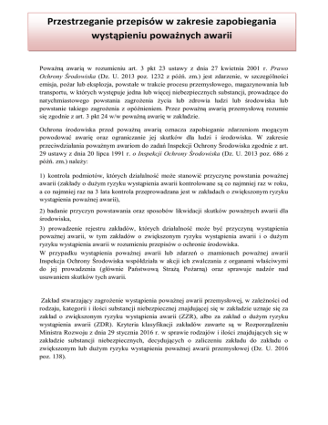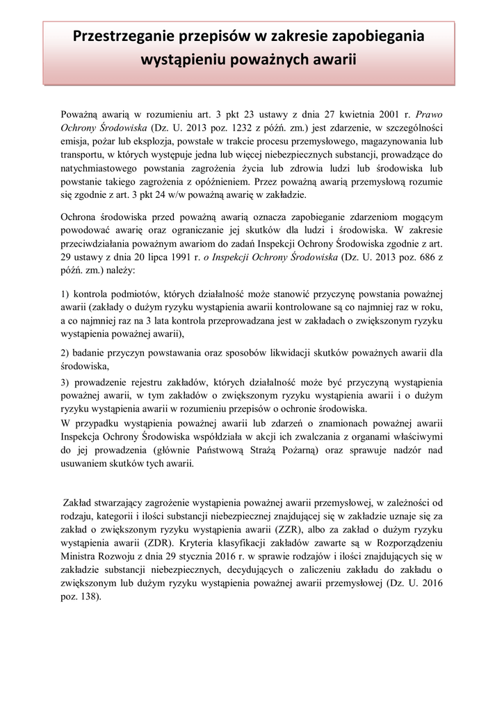 Przestrzeganie przepisów w zakresie zapobiegania wystąpieniu poważnych awarii Poważną awarią w rozumieniu art. 3 pkt 23 ustawy z dnia 27 kwietnia 2001 r. Prawo Ochrony Środowiska (Dz. U. 2013 poz. 1232 z późń. zm.) jest zdarzenie, w szczególności emisja, pożar lub eksplozja, powstałe w trakcie procesu przemysłowego, magazynowania lub transportu, w których występuje jedna lub więcej niebezpiecznych substancji, prowadzące do natychmiastowego powstania zagrożenia życia lub zdrowia ludzi lub środowiska lub powstanie takiego zagrożenia z opóźnieniem. Przez poważną awarią przemysłową rozumie się zgodnie z art. 3 pkt 24 w/w poważną awarię w zakładzie. Ochrona środowiska przed poważną awarią oznacza zapobieganie zdarzeniom mogącym powodować awarię oraz ograniczanie jej skutków dla ludzi i środowiska. W zakresie przeciwdziałania poważnym awariom do zadań Inspekcji Ochrony Środowiska zgodnie z art. 29 ustawy z dnia 20 lipca 1991 r. o Inspekcji Ochrony Środowiska (Dz. U. 2013 poz. 686 z późń. zm.) należy: 1) kontrola podmiotów, których działalność może stanowić przyczynę powstania poważnej awarii (zakłady o dużym ryzyku wystąpienia awarii kontrolowane są co najmniej raz w roku, a co najmniej raz na 3 lata kontrola przeprowadzana jest w zakładach o zwiększonym ryzyku wystąpienia poważnej awarii), 2) badanie przyczyn powstawania oraz sposobów likwidacji skutków poważnych awarii dla środowiska, 3) prowadzenie rejestru zakładów, których działalność może być przyczyną wystąpienia poważnej awarii, w tym zakładów o zwiększonym ryzyku wystąpienia awarii i o dużym ryzyku wystąpienia awarii w rozumieniu przepisów o ochronie środowiska. W przypadku wystąpienia poważnej awarii lub zdarzeń o znamionach poważnej awarii Inspekcja Ochrony Środowiska współdziała w akcji ich zwalczania z organami właściwymi do jej prowadzenia (głównie Państwową Strażą Pożarną) oraz sprawuje nadzór nad usuwaniem skutków tych awarii. Zakład stwarzający zagrożenie wystąpienia poważnej awarii przemysłowej, w zależności od rodzaju, kategorii i ilości substancji niebezpiecznej znajdującej się w zakładzie uznaje się za zakład o zwiększonym ryzyku wystąpienia awarii (ZZR), albo za zakład o dużym ryzyku wystąpienia awarii (ZDR). Kryteria klasyfikacji zakładów zawarte są w Rozporządzeniu Ministra Rozwoju z dnia 29 stycznia 2016 r. w sprawie rodzajów i ilości znajdujących się w zakładzie substancji niebezpiecznych, decydujących o zaliczeniu zakładu do zakładu o zwiększonym lub dużym ryzyku wystąpienia poważnej awarii przemysłowej (Dz. U. 2016 poz. 138). Obowiązki prowadzącego zakład zwiększonego ryzyka (ZZR). Każdy, kto zamierza prowadzić lub prowadzi zakład niebezpieczny (ZZR lub ZDR) jest obowiązany do zapewnienia, aby zakład ten był zaprojektowany, wykonany, prowadzony i likwidowany w sposób zapobiegający awariom przemysłowym i ograniczający ich skutki dla ludzi i środowiska. Do głównych zadań prowadzącego zakład o zwiększonym ryzyku w zakresie zapobiegania poważnym awariom, w myśl ustawy Prawo ochrony środowiska (POŚ), należy: • zgłoszenie zakładu właściwemu organowi Państwowej Straży Pożarnej i wojewódzkiemu inspektorowi ochrony środowiska (zgłoszenia wymaga także każda istotna zmiana ilości lub rodzaju substancji niebezpiecznej albo jej charakterystyki fizykochemicznej, pożarowej i toksycznej, technologii lub profilu produkcji - na 30 dni przed wprowadzeniem zmiany), • sporządzenie programu zapobiegania poważnym awariom i przedłożenie go przed uruchomieniem zakładu lub jego części, właściwemu organowi PSP i wojewódzkiemu inspektorowi ochrony środowiska. Uruchomienie zakładu może nastąpić po upływie 30 dni od dnia otrzymania programu zapobiegania awariom przez właściwy organ PSP, jeżeli organ ten nie niesie sprzeciwu w drodze decyzji, • opracowanie i wdrożenie systemu zarządzania bezpieczeństwem stanowiącego element ogólnego systemu zarządzania i organizacji zakładu, opartego na ocenie ryzyka, • podanie do publicznej wiadomości, na stronie internetowej zakładu, informacji dotyczących m.in. sposobów ostrzegania i postępowania społeczeństwa w przypadku wystąpienia awarii przemysłowej, uzgodnionych z właściwymi organami Państwowej Straży Pożarnej. Właściwym organem PSP dla zakładu o zwiększonym ryzyku jest komendant powiatowy Państwowej Straży Pożarnej. Obowiązki prowadzącego zakład dużego ryzyka (ZDR). Do głównych zadań prowadzącego zakład o dużym ryzyku w zakresie zapobiegania poważnym awariom, w myśl ustawy POŚ, należy: • • zgłoszenie zakładu właściwemu organowi PSP i wojewódzkiemu inspektorowi ochrony środowiska (zgłoszenia wymaga także każda istotna zmiana ilości lub rodzaju substancji niebezpiecznej albo jej charakterystyki fizykochemicznej, pożarowej i toksycznej, technologii lub profilu produkcji - na 30 dni przed wprowadzeniem zmiany), sporządzenie programu zapobiegania poważnym awariom i przedłożenie go przed uruchomieniem zakładu lub jego części, właściwemu organowi PSP i wojewódzkiemu inspektorowi ochrony środowiska. Uruchomienie zakładu może nastąpić po upływie 30 dni od dnia otrzymania programu zapobiegania awariom przez właściwy organ PSP, decyzji, • • • • jeżeli organ ten nie niesie sprzeciwu w drodze opracowanie i wdrożenie systemu zarządzania bezpieczeństwem stanowiącego element ogólnego systemu zarządzania i organizacji zakładu, opartego na ocenie ryzyka, opracowanie raportu o bezpieczeństwie oraz przedłożenie go przed uruchomieniem zakładu właściwemu organowi PSP i wojewódzkiemu inspektorowi ochrony środowiska. Uruchomienie zakładu może nastąpić po zatwierdzeniu raportu przez właściwy organ PSA, po uzyskaniu opinii wojewódzkiego inspektora ochrony środowiska, opracowanie wewnętrznego planu operacyjno-rat