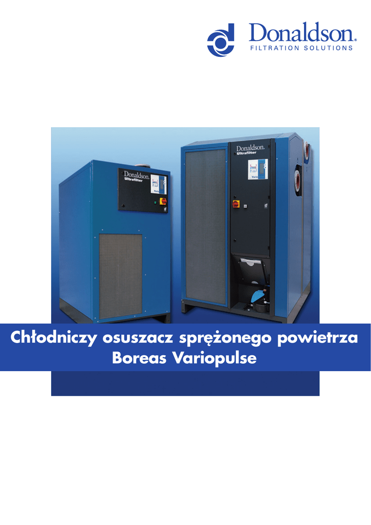 Chłodniczy osuszacz sprężonego powietrza Boreas Variopulse Inteligentny chłodniczy osuszacz sprężone Dlaczego sprężone powietrze jest uzdatnianie? Sprężone powietrze jest jednym z podstawowych rodzajów energii napędowej i procesowej używanej we wszystkich procesach przemysłowych i zakładach produkcyjnych. Musi być ono suche, pozbawione oleju i czyste, co pozwala uniknąć kosztownych przestojów w produkcji. Sprężone powietrze powstaje w wyniku sprężania powietrza zasysanego do sprężarki. Zazwyczaj zawiera ono różnorodne substancje pochodzące z zanieczyszczonego środowiska oraz cząsteczki brudu. Zawsze zawiera też wilgoć w postaci pary wodnej, która skrapla się samoistnie w sprężonym powietrzu, często będąc przyczyną przerywania procesów produkcyjnych, a tym samym znaczących, jednak możliwych do uniknięcia, strat ekonomicznych. Jak działa osuszacz Boreas? Sprężone powietrze, które ma być uzdatnione, jest wprowadzane do osuszacza chłodniczego i wstępnie schładzane w wymienniku ciepła typu powietrze powietrze. Takie wstępne schłodzenie odbywa się przeciwprądowo względem odprowadzanego, zimnego sprężonego powietrza, a więc odbywa się bez doprowadzania dodatkowej energii. Następnie powietrze jest dochładzane do poziomu ciśnieniowego punktu rosy. Odbywa się to w wymienniku ciepła typu czynnik chłodniczy - powietrze z obiegiem czynnika chłodniczego. Podczas całego procesu schładzania ze sprężonego powietrza wytrąca się wilgoć w postaci kondensatu, który jest automatycznie odprowadzany przez dren. Następnie uzdatnione sprężone powietrze jest podgrzewane w wymienniku ciepła powietrzepowietrze, w którym używane jest ciepłe, sprężone powietrze wprowadzane do osuszacza. Variopulse: Lider technologii systemów sterowania osuszaczy Sterownik mikroprocesorowy stale przetwarza parametry robocze, tj. temperaturę chłodzenia, ciśnienie w układzie czynnika chłodniczego, temperaturę otoczenia oraz parametry specyficzne dla osuszacza i na ich podstawie oblicza aktualny stan roboczy. W zależności od zapotrzebowania na osuszone sprężone powietrze, sterownik Variopulse steruje wydajnością skraplacza oraz sprężarki przy wykorzystaniu przemiennika częstotliwości, ewentualnie sterując ciśnieniem ssania. Gdy zapotrzebowanie na osuszone sprężone powietrze jest bardzo niskie, sprężarka chłodnicza może być nawet okresowo wyłączana. Wymiennik ciepła, działając jako akumulator ciepła, umożliwia szybkie reagowanie na zmieniające się zapotrzebowanie i zapobiega dużym wahaniom punktu rosy. DV 1800 AP ego powietrza: Boreas Variopulse Przemiennik częstotliwości albo sterowanie ciśnieniem ssania – dwa sposoby osiągnięcia jednego celu: oszczędności energii W osuszaczach Boreas Variopulse o wydajnościach od DV 1800 AP do DV 2800 AP, regulowana jest wydajność obiegu czynnika chłodniczego w warunkach częściowego obciążenia poprzez sterowanie ciśnieniem ssania. Przewód ssący sprężarki chłodniczej jest zamykany w taki sposób, żeby tylko niewielka część czynnika chłodniczego przepływała przez obejście do sprężarki. Dzięki temu sprężana jest mniejsza ilość czynnika chłodniczego niż przy obciążeniu szczytowym, co oznacza, że zużywa się znacznie mniej energii. Wyświetlacz wielofunkcyjny Aktualna wartość ciśnieniowego punktu rosy Tryb pracy Normalny / Letni / Automatyczny Zużycie energii w stosunku do całkowitego okresu użytkowania Komunikaty alarmowe Historia alarmów Termin kolejnego przeglądu konserwacyjnego Stan pracy drenu kondensatu Czas pracy Stan sprężarki chłodniczej (załączona / wyłączona) Bieżące zużycie energii Właściwości i zalety W osuszaczach Boreas Variopulse o wydajności od DV 3500 AP do DV 28500 WP do sterowania wydajnością używany jest przemiennik częstotliwości. W sposób ciągły reguluje on prędkość jednej ze sprężarek chłodniczych. Dzięki zastosowaniu tych dwóch koncepcji sterowania oraz sterownika Variopulse, zużycie energii spada liniowo proporcjonalnie do obciążenia osuszacza aż do 90% przy obciążeniu zerowym. Dzięki temu uzyskuje się wyjątkowo niskie zużycie energii przy obciążeniach zerowych, niepełnych oraz szczytowych. Oszczędności w kosztach energii przewyższają koszty inwestycji w bardzo krótkim czasie. potencjał dla oszczędności 24% obsługa i utrzymanie 14% energia 40-75% instalacja 2% koszt inwestycji 20% Sterownik Variopulse jako standardowe wyposażenie Stale podświetlony wyświetlacz wielofunkcyjny Stały ciśnieniowy punkt rosy bez dużych wahań Pobór mocy zależny od obciążenia, redukcja nawet do 90% w stosunku do nominalnego poboru Aluminiowy wymiennik ciepła Dren kondensatu Ultramat UFM-T100 sterowany poziomem Interfejs CAN-BUS do zdalnego monitorowania oraz odczytu danych przy użyciu laptopa jako standardowe wyposażenie Wybór jednostki temperatury na wyświetlaczu: °C albo °F Bocznik gorącego gazu bez strat energii Wysoka nadmiarowa sprawność cieplna dzięki zastosowaniu przyjaznego dla środowiska czynnika chłodniczego R-134a Inteligentny chłodniczy osuszacz sprężone Aluminiowy wymiennik ciepła Doskonale zwymiarowane wymienniki ciepła powietrzepowietrze oraz czynnik chłodniczy-powietrze, o wysokiej sprawności Wbudowany system oddzielania kondensatu Odporność na zanieczyszczenia dzięki doskonale zwymiarowanym kanałom przepływu Mała różnica ciśnień powietrza Odporność na korozję dzięki zastosowaniu aluminium w specjalnych procesach produkcyjnych, wypróbowanego i sprawdzonego w ciągu kilkudziesięciu lat. Zastosowanie czynnika chłodniczego R-134a W osuszaczach Boreas osuszaczach Variopulse Podobnie jak we typoszeregu wszystkich innych standardowo jest czynnik chłodniczy Rchłodniczychużywany sprężonego powietrza firmy 134a. Na ten czynnik chłodniczy mający potencjał Donaldson, w osuszaczach typoszeregu Boreas niszczenia równy 0używan