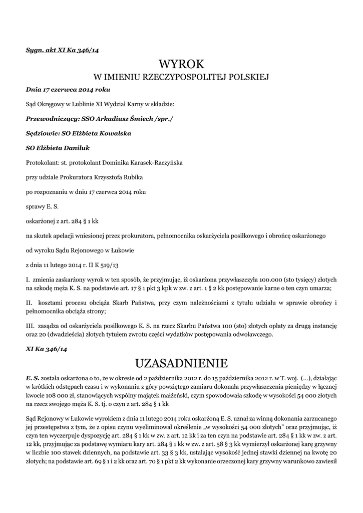Sygn. akt XI Ka 346/14 WYROK W IMIENIU RZECZYPOSPOLITEJ POLSKIEJ Dnia 17 czerwca 2014 roku Sąd Okręgowy w Lublinie XI Wydział Karny w składzie: Przewodniczący: SSO Arkadiusz Śmiech /spr./ Sędziowie: SO Elżbieta Kowalska SO Elżbieta Daniluk Protokolant: st. protokolant Dominika Karasek-Raczyńska przy udziale Prokuratora Krzysztofa Rubika po rozpoznaniu w dniu 17 czerwca 2014 roku sprawy E. S. oskarżonej z art. 284 § 1 kk na skutek apelacji wniesionej przez prokuratora, pełnomocnika oskarżyciela posiłkowego i obrońcę oskarżonego od wyroku Sądu Rejonowego w Łukowie z dnia 11 lutego 2014 r. II K 519/13 I. zmienia zaskarżony wyrok w ten sposób, że przyjmując, iż oskarżona przywłaszczyła 100.000 (sto tysięcy) złotych na szkodę męża K. S. na podstawie art. 17 § 1 pkt 3 kpk w zw. z art. 1 § 2 kk postępowanie karne o ten czyn umarza; II. kosztami procesu obciąża Skarb Państwa, przy czym należnościami z tytułu udziału w sprawie obrońcy i pełnomocnika obciąża strony; III. zasądza od oskarżyciela posiłkowego K. S. na rzecz Skarbu Państwa 100 (sto) złotych opłaty za drugą instancję oraz 20 (dwadzieścia) złotych tytułem zwrotu części wydatków postępowania odwoławczego. XI Ka 346/14 UZASADNIENIE E. S. została oskarżona o to, że w okresie od 2 października 2012 r. do 15 października 2012 r. w T. woj. (...), działając w krótkich odstępach czasu i w wykonaniu z góry powziętego zamiaru dokonała przywłaszczenia pieniędzy w łącznej kwocie 108 000 zł, stanowiących wspólny majątek małżeński, czym spowodowała szkodę w wysokości 54 000 złotych na rzecz swojego męża K. S. tj. o czyn z art. 284 § 1 kk Sąd Rejonowy w Łukowie wyrokiem z dnia 11 lutego 2014 roku oskarżoną E. S. uznał za winną dokonania zarzucanego jej przestępstwa z tym, że z opisu czynu wyeliminował określenie „w wysokości 54 000 złotych” oraz przyjmując, iż czyn ten wyczerpuje dyspozycję art. 284 § 1 kk w zw. z art. 12 kk i za ten czyn na podstawie art. 284 § 1 kk w zw. z art. 12 kk, przyjmując za podstawę wymiaru kary art. 284 § 1 kk w zw. z art. 58 § 3 kk wymierzył oskarżonej karę grzywny w liczbie 100 stawek dziennych, na podstawie art. 33 § 3 kk, ustalając wysokość jednej stawki dziennej na kwotę 20 złotych; na podstawie art. 69 § 1 i 2 kk oraz art. 70 § 1 pkt 2 kk wykonanie orzeczonej kary grzywny warunkowo zawiesił na okres próby wynoszący 3 lata; na podstawie art. 46 § 2 kk orzekł względem oskarżonej środek karny w postaci nawiązki poprzez zapłatę na rzecz K. S. kwoty 2.000 złotych; zasądził od oskarżonej na rzecz Skarbu Państwa kwotę 398 złotych tytułem kosztów sądowych w zakresie wydatków oraz kwotę 200 złotych tytułem kosztów sądowych w zakresie opłaty. Apelacje od powyższego wyroku złożyli prokurator, pełnomocnik oskarżyciela posiłkowego oraz obrońca oskarżonej. Prokurator zaskarżył powyższy wyrok na niekorzyść oskarżonej E. S. w części dotyczącej orzeczenia o karze i zarzucił mu I. obrazę prawa materialnego, a mianowicie art. 46 § 1 kk poprzez zaniechanie orzeczenia środka karnego w postaci obowiązku naprawienia szkody na rzecz pokrzywdzonego, w sytuacji gdy K. S. przed zakończeniem pierwszego przesłuchania go na rozprawie głównej złożył wniosek o zasądzenie obowiązku naprawienia szkody wyrządzonej przestępstwem; I. obrazę prawa materialnego, a mianowicie art. 46 § 2 kk poprzez orzeczenie nawiązki na rzecz pokrzywdzonego zamiast obligatoryjnego w niniejszej sprawie obowiązku naprawienia szkody na podstawie art. 46 § 1 kk II. rażącą niewspółmierność kary orzeczonej wobec oskarżonej E. S., a przemawiającą się warunkowym zawieszeniem wykonania orzeczonej wobec oskarżonej kary grzywny w wymiarze 100 stawek dziennych po 20 zł każda, w sytuacji gdy zastosowanie dobrodziejstwa warunkowego zawieszenia wykonania kary grzywny w niniejszej sprawie, spowoduje, że kara nie spełni swoich celów zarówno w zakresie prewencji indywidualnej jak i ogólnej; Podnosząc powyższe zarzuty wniósł o zmianę zaskarżonego wyroku w części dotyczącej orzeczenia o karze, poprzez: • uchylenie punktu II sentencji zaskarżonego orzeczenia, w którym Sąd orzekł nawiązkę na rzecz pokrzywdzonego; • orzeczenie na podstawie art. 46 § 1 kk wobec oskarżonej E. S. obowiązku naprawienia szkody wyrządzonej przestępstwem, poprzez zwrotu przywłaszczonej kwoty 108 000 zł; • orzeczenie na pod-stawie art. 284 § 1 kk w zw. z art. 58 § 3 kk wobec oskarżonej E. S. kary grzywny w wymiarze 100 stawek dziennych po 20 zł każda, bez warunkowego zawieszenia jej wykonania. Pełnomocnik oskarżyciela posiłkowego K. S. zaskarżył powyższy wyrok w części dotyczącej orzeczenia o karze na niekorzyść oskarżonej i zarzucił mu 1. obrazę prawa materialnego, a mianowicie art. 46 § 1 kk, poprzez jego niezastosowanie i niezobowiązanie do naprawienia szkody poprzez zapłatę na rzecz pokrzywdzonego kwoty 108 000 zł, 1. rażącą niewspółmierność wymierzonej oskarżonej kary w stosunku do stopnia społecznej szkodliwości oraz winy, wynikającą z orzeczenia zbyt niskiej kary, co powoduje, że nie spełnia ona swojej funkcji w zakresie prewencji ogólnej i szczególnej oraz nie zaspokaja społecznego poczucia sprawiedliwości. Podnosząc powyższe zarzuty wniósł o: • zmianę zaskarżonego wyroku poprzez wymierzenie oskarżonej kary pozbawienia wolności(...) z warunkowym zawieszeniem wykonania kary na okres próby wynoszący 3 lata oraz orzeczenie względem oskarżonej środka karnego w postaci obowiązku naprawienia szkody poprzez zapłatę na rzecz pokrzywdzonego kwoty 108 000 zł, ewentualnie • uchylenie zaskarżonego wyroku w całości i przekazanie sprawy do ponownego rozpoznania. Obrońca oskarżonej zaskarżył wyrok Sądu Rejonowego w całości i zarzucił mu naruszenie przepisów postępowania, które miały wpływ na treść orzeczenia w