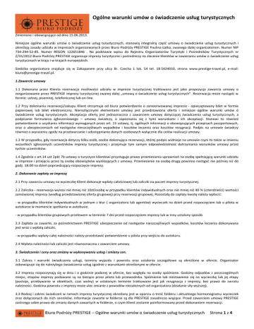 Ogólne warunki umów o świadczenie usług turystycznych Zmienione i obowiązujące od dnia 15.06.2013. Niniejsze ogólne warunki umów o świadczenie usług turystycznych, stanowią integralną część umowy o świadczenie usług turystycznych i określają zasady udziału w imprezach organizowanych przez Biuro Podróży PRESTIGE Paulina Łatka, zwanego dalej organizatorem. Numer NIP 734-294-52-85. Numer REGON 122651846 . Na podstawie wpisu do Rejestru Organizatorów Turystyki i Pośredników Turystycznych nr Z/55/2012 Biuro Podróży PRESTIGE organizuje imprezy turystyczne i pośredniczy na zlecenie klientów w zawieraniu umów o świadczenie usług turystycznych w kraju i w krajach europejskich. Siedziba organizatora znajduje się w Zakopanem przy ulicy Br. Czecha 1 lok. 54 tel. 18 5424010, strona www.prestige-travel.pl, e-mail: [email protected]. 1.Zawarcie umowy 1.1 Dokonana przez Klienta rezerwacja możliwości udziału w imprezie turystycznej traktowana jest jako propozycja zawarcia umowy o zorganizowanie przez PRESTIGE imprezy turystycznej zwanej dalej „umową o świadczenie usług turystycznych”. Rezerwacja może nastąpić w formie: ustnej, pisemnej, telefonicznej lub on-line. 1.2 Przy dokonaniu rezerwacji/zakupu Klient otrzymuje od biura potwierdzenie o zarezerwowanej imprezie - opieczętowany bilet w formie papierowej lub bilet elektroniczny. Nierozłącznymi elementami umowy jest przedstawiona oferta i niniejsze ogólne warunki umów o świadczenie usług turystycznych. Akceptacja oferty jest jednoznaczna z zawarciem umowy dotyczącej świadczenia usług turystycznych, a podpisanie formularza zgłoszeniowego – umowy świadczy, o zapoznaniu się z tymi warunkami i ich akceptacji. Stanowi to również potwierdzenie o uzyskaniu informacji wymaganych przez art. 13 ustawy, tj. ogólnych informacji o obowiązujących przepisach paszportowych, oraz o ubezpieczeniach od następstw nieszczęśliwych wypadków i kosztów leczenia oraz kosztów rezygnacji. Podpis na umowie świadczy również o wyrażeniu zgody na przetwarzanie i udostępnianie danych osobowych wyłącznie dla celów realizacji umowy. 1.3 W przypadku, gdy rezerwacja dotyczy kilku osób, osoba dokonująca rezerwacji, której podpis widnieje na umowie czyni to także w imieniu wszystkich zgłoszonych uczestników imprezy turystycznej i przejmuje tym samym odpowiedzialność dotrzymania warunków umowy przez tychże uczestników. 1.4 Zgodnie z art.14 ust 2pkt 7b ustawy o turystyce klientowi przysługuje prawo przeniesienia uprawnień na osobę spełniającą warunki udziału w imprezie i przejęciu przez tą osobę obowiązków wynikających z umowy. Przeniesienie na osobę drugą powinno nastąpić nie później niż do godz. 18.00 na dzień poprzedzający rozpoczęcie imprezy. 2. Dokonanie zapłaty za imprezę 2.1 Przy zawarciu umowy na wycieczkę Klient dokonuje wpłaty całościowej lub zaliczki na poczet imprezy turystycznej. 2.2 Zaliczka - rezerwacja wynosi nie mniej niż 10zł/osobę w przypadku klientów indywidualnych oraz nie mniej niż 40 % (czterdzieści) wartości zamówionej imprezy (według przedstawionej oferty grupowej) przy rezerwacji grupowej. Pozostałą do zapłaty kwotę należy wpłacić: - w przypadku klientów indywidualnych w jednym z biur ( organizatora lub agentów) wycieczek na dzień przed rozpoczęciem lub u pilota w autokarze w momencie spotkania w autobusie. - w przypadku klientów grupowych przelewem w terminie 7 dni przed rozpoczęciem imprezy lub w inny ustalony sposób 2.3 Zapłata za zawarte, za pośrednictwem PRESTIGE ubezpieczenie od następstw nieszczęśliwych wypadków, kosztów leczenia dokonywana jest wraz z wpłatą zaliczki. - w przypadku wpłaty całej należności należy przedstawić potwierdzenie u pilota przy wejściu do autokaru. 2.4 Wpłata należności lub zaliczki jest równoznaczna z zawarciem umowy. 3. Świadczenia i ceny oraz zmiany w wykonywaniu usług i zmiany cen. 3.1 Zakres i warunki świadczenia usługi, terminy wyjazdu i powrotu oraz ustalenia szczegółowe są określone w ofercie. Organizator zobowiązuje się do należytego świadczenia usług zgodnie z warunkami określonymi w ofercie. 3.2 Imprezy rozpoczynają się w dniu i o godzinie podanej w ofercie, bez względu na osoby spóźnione. Godziny odjazdów z poszczególnych miejsc, etapów imprezy podawane są na bieżąco przez pilota lub przewodnika. Spóźnienie lub niestawienie się na wycieczkę lub jej etapy (postoje, przebywanie w obiektach, czas wolny) w ustalonym terminie traktowane jest jak rezygnacja z imprezy, bez prawa do zwrotu należności. Godzina powrotu z imprezy może ulec zmianie z powodów niezależnych od organizatora (działanie siły wyższej). 3.3 Rodzaj i zakres świadczeń w ramach imprezy turystycznej określany jest w oparciu o treść folderu i aktualnego harmonogramu wycieczek oraz dołączonych do nich cenników. Informacje zawarte w folderze są dla PRESTIGE zasadniczo wiążące. Przed zawarciem umowy PRESTIGE zastrzega sobie prawo do zmiany danych zawartych w folderze, o czym Klient zostanie poinformowany przed dokonaniem rezerwacji. Biuro Podróży PRESTIGE – Ogólne warunki umów o świadczenie usług turystycznych Strona 1 z 4 Wszelkie informacje niezgodne z treścią folderu i harmonogramu, nie będącą folderem lub harmonogramem biura PRESTIGE nie stanowią jakiejkolwiek części umowy o świadczenie usług turystycznych. 3.4 Ceny wycieczek zamieszczone są w cenniku. 3.5 Zmiany w zakresie i warunkach podczas świadczenia usługi dokonywane ze strony organizatora są dopuszczalne, o ile są one niezbędne i nie znaczące dla realizacji programu, a powodem niewykonania jest działanie siły wyższej. Organizator zastrzega sobie również prawo dokonania istotnej zmiany programu imprezy w sytuacji pogorszenia pogody w części programu imprezy zależnej od pogody czyli spowodowanej działaniem siły wyższej (np. Spływ przełomem Dunajca, Tatrzańska Łom