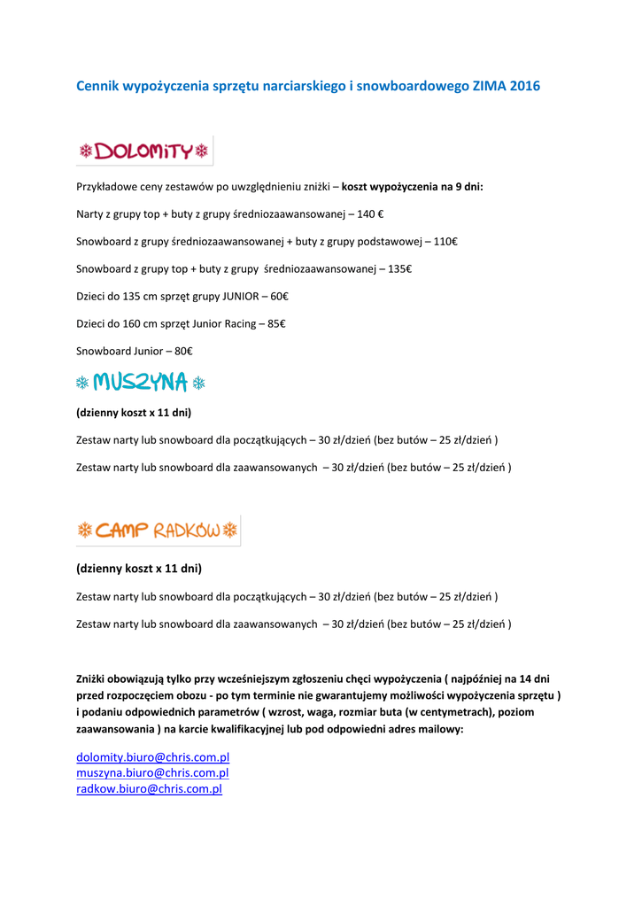 Cennik wypożyczenia sprzętu narciarskiego i snowboardowego ZIMA 2016 Przykładowe ceny zestawów po uwzględnieniu zniżki – koszt wypożyczenia na 9 dni: Narty z grupy top + buty z grupy średniozaawansowanej – 140 € Snowboard z grupy średniozaawansowanej + buty z grupy podstawowej – 110€ Snowboard z grupy top + buty z grupy średniozaawansowanej – 135€ Dzieci do 135 cm sprzęt grupy JUNIOR – 60€ Dzieci do 160 cm sprzęt Junior Racing – 85€ Snowboard Junior – 80€ (dzienny koszt x 11 dni) Zestaw narty lub snowboard dla początkujących – 30 zł/dzień (bez butów – 25 zł/dzień ) Zestaw narty lub snowboard dla zaawansowanych – 30 zł/dzień (bez butów – 25 zł/dzień ) (dzienny koszt x 11 dni) Zestaw narty lub snowboard dla początkujących – 30 zł/dzień (bez butów – 25 zł/dzień ) Zestaw narty lub snowboard dla zaawansowanych – 30 zł/dzień (bez butów – 25 zł/dzień ) Zniżki obowiązują tylko przy wcześniejszym zgłoszeniu chęci wypożyczenia ( najpóźniej na 14 dni przed rozpoczęciem obozu - po tym terminie nie gwarantujemy możliwości wypożyczenia sprzętu ) i podaniu odpowiednich parametrów ( wzrost, waga, rozmiar buta (w centymetrach), poziom zaawansowania ) na karcie kwalifikacyjnej lub pod odpowiedni adres mailowy: [email protected] [email protected] [email protected]