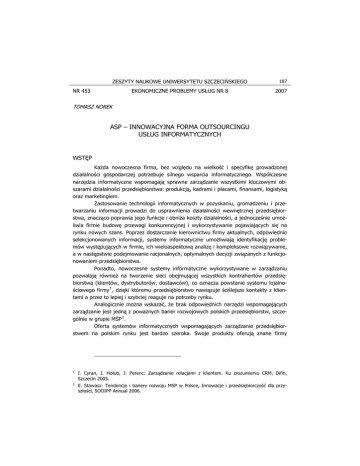 ZESZYTY NAUKOWE UNIWERSYTETU SZCZECIŃSKIEGO NR 453 EKONOMICZNE PROBLEMY USŁUG NR 8 187 2007 TOMASZ NOREK ASP – INNOWACYJNA FORMA OUTSOURCINGU USŁUG INFORMATYCZNYCH WSTĘP Każda nowoczesna firma, bez względu na wielkość i specyfikę prowadzonej działalności gospodarczej potrzebuje silnego wsparcia informatycznego. Współczesne narzędzia informatyczne wspomagają sprawne zarządzanie wszystkimi kluczowymi obszarami działalności przedsiębiorstwa: produkcją, kadrami i płacami, finansami, logistyką oraz marketingiem. Zastosowanie technologii informatycznych w pozyskaniu, gromadzeniu i przetwarzaniu informacji prowadzi do usprawnienia działalności wewnętrznej przedsiębiorstwa, znacząco poprawia jego funkcje i obniża koszty działalności, a jednocześnie umożliwia firmie budowę przewagi konkurencyjnej i wykorzystywanie pojawiających się na rynku nowych szans. Poprzez dostarczanie kierownictwu firmy aktualnych, odpowiednio selekcjonowanych informacji, systemy informatyczne umożliwiają identyfikację problemów występujących w firmie, ich wieloaspektową analizę i kompleksowe rozwiązywanie, a w następstwie podejmowanie racjonalnych, optymalnych decyzji związanych z funkcjonowaniem przedsiębiorstwa. Ponadto, nowoczesne systemy informatyczne wykorzystywane w zarządzaniu pozwalają również na tworzenie sieci obejmującej wszystkich kontrahentów przedsiębiorstwa (klientów, dystrybutorów, dostawców), co oznacza powstanie systemu lojalnościowego firmy 1 , dzięki któremu przedsiębiorstwo nawiązuje ściślejsze kontakty z klientami a przez to lepiej i szybciej reaguje na potrzeby rynku. Analogicznie można wskazać, że brak odpowiednich narzędzi wspomagających zarządzanie jest jedną z poważnych barier rozwojowych polskich przedsiębiorstw, szczególnie w grupie MŚP 2 . Oferta systemów informatycznych wspomagających zarządzanie przedsiębiorstwem na polskim rynku jest bardzo szeroka. Swoje produkty oferują znane firmy P 1 I. Cyran, J. Hołub, J. Perenc: Zarządzanie relacjami z klientem. Ku zrozumieniu CRM, Difin, Szczecin 2005. 2 E. Stawasz: Tendencje i bariery rozwoju MSP w Polsce, Innowacje i przedsiębiorczość dla przyszłości, SOOIPP Annual 2006. 188 Tomasz Norek zagraniczne a także polskie firmy tworzące systemy informatyczne 3 . Niestety poważną barierą, szczególnie dla małych i średnich przedsiębiorstw są wysokie koszty związane z zakupem i wdrożeniem 4 systemu informatycznego w firmie. Nie dysponujące odpowiednimi środkami finansowymi polskie przedsiębiorstwa nie wdrażają nowoczesnych narzędzi informatycznych wspomagających zarządzanie 5 . Dostrzegając kluczową rolę zastosowań informatyki w zarządzaniu przedsiębiorstwem oraz bariery związane z możliwością pozyskania odpowiednich narzędzi, firmy informatyczne stworzyły innowacyjną metodę udostępniania i dostarczania oferowanych systemów informatycznych. Metodą tą jest model ASP, czyli dostarczanie systemów informatycznych za pośrednictwem sieci Internet w formie dzierżawy. Metoda ta stała się możliwa do realizacji dzięki rozwojowi internetowej sieci szkieletowej zapewniającej odpowiednią przepustowość łaczy oraz rozwojowi sieciowych języków programowania 6 pozwalających na implementację systemów informatycznych działających w sieci Internet. Niniejszy artykuł przedstawia podstawowe informacje o możliwości wykorzystania narzędzi informatycznych ASP wspomagających zarządzanie przedsiębiorstwem. W dalszej części scharakteryzowano istotę funkcjonowania modelu ASP, zalety i bariery wykorzystywania aplikacji w tym modelu (ze szczególnym uwzględnieniem potrzeb małych firm) oraz możliwości wykorzystywania tego typu narzędzi w polskich warunkach gospodarczych. ISTOTA MODELU ASP ASP to skrót od angielskiej nazwy usługi Application Service Providing, czyli w wolnym tłumaczeniu - usługa dostarczania aplikacji 7 . Firmy świadczące takie usługi oferują dostęp do systemów informatycznych i powiązanych z nimi usług na zasadach dzierżawy. 3 Ofertę dostępnych na polsim rynku systemów informatycznych wspomagających zarządzanie wraz ze szczegółową charakterystyką poszczególnych produktów prezentuje raport „ComputerWorld. Systemy informatyczne w zarządzaniu 2005”, www.computerworld.pl. 4 Koszty zwiazane z wdrożeniam systemu informatycznego obejmują zakup oprogramowania, zakup wymaganego sprzętu komputerowego oraz szkolenia pracowników. Praktyka wskazuję, iż sam zakup oprogramowani stanowi jedynie 30-40% kosztów wdrożenia. 5 Niedostatek środków finansowych jest wskazywany jako główna bariera rozwoju MSP w Polsce. E. Stawasz: Tendencje i bariery rozwoju MSP w Polsce, Innowacje i przedsiębiorczość dla przyszłości, SOOIPP Annual 2006. 6 Powszechnie wykorzystywane języki programowania do realizacji aplikacji ASP to: PHP, Java, VB.NET. 7 Nie funkcjonuje oficjalnie przyjęte polskie tłumaczenie nazwy ASP i w praktyce używa się angielskiego skrótowca. Aplikacje wykorzystywane w modelu ASP często są również nazywane aplikacjami „on demand”, czyli aplikacjami na żądanie. ASP – innowacyjna forma outsourcingu usług informatycznych 189 Dostęp do systemu realizowany jest poprzez sieć Internet. Przedsiębiorstwo (użytkownik systemu) nie musi kupować licencji na użytkowanie systemu informatycznego lecz czasowo ją dzierżawi. Architektura internetowa powoduje, iż użytkownik nie musi też instalować oprogramowania na twardych dyskach komputerów firmowych. Dzięki połączeniu z serwerem dostawcy, użytkownik za pośrednictwem przeglądarki internatowej może korzystać z systemu informatycznego tak samo jakby był on zainstalowany na jego komputerze. Jednocześnie wszystkie dane oraz dokumenty tworzone w systemie ASP są gromadzone na serwerach w chronionym Data Center dostawcy usługi, gdzie obowiązują rygorystyczne procedury ochrony danych i tworzenia kopii zapasowych. Rys
