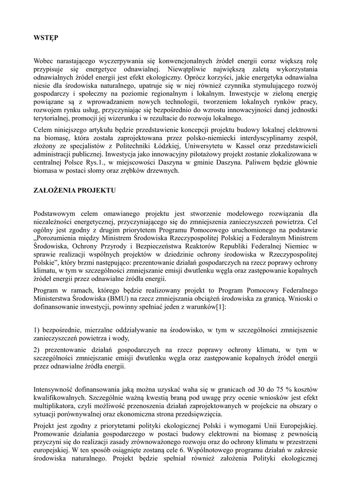 WSTĘP Wobec narastającego wyczerpywania się konwencjonalnych źródeł energii coraz większą rolę przypisuje się energetyce odnawialnej. Niewątpliwie największą zaletą wykorzystania odnawialnych źródeł energii jest efekt ekologiczny. Oprócz korzyści, jakie energetyka odnawialna niesie dla środowiska naturalnego, upatruje się w niej również czynnika stymulującego rozwój gospodarczy i społeczny na poziomie regionalnym i lokalnym. Inwestycje w zieloną energię powiązane są z wprowadzaniem nowych technologii, tworzeniem lokalnych rynków pracy, rozwojem rynku usług, przyczyniając się bezpośrednio do wzrostu innowacyjności danej jednostki terytorialnej, promocji jej wizerunku i w rezultacie do rozwoju lokalnego. Celem niniejszego artykułu będzie przedstawienie koncepcji projektu budowy lokalnej elektrowni na biomasę, która została zaprojektowana przez polsko-niemiecki interdyscyplinarny zespół, złożony ze specjalistów z Politechniki Łódzkiej, Uniwersytetu w Kassel oraz przedstawicieli administracji publicznej. Inwestycja jako innowacyjny pilotażowy projekt zostanie zlokalizowana w centralnej Polsce Rys.1., w miejscowości Daszyna w gminie Daszyna. Paliwem będzie głównie biomasa w postaci słomy oraz zrębków drzewnych. ZAŁOŻENIA PROJEKTU Podstawowym celem omawianego projektu jest stworzenie modelowego rozwiązania dla niezależności energetycznej, przyczyniającego się do zmniejszenia zanieczyszczeń powietrza. Cel ogólny jest zgodny z drugim priorytetem Programu Pomocowego uruchomionego na podstawie „Porozumienia między Ministrem Środowiska Rzeczypospolitej Polskiej a Federalnym Ministrem Środowiska, Ochrony Przyrody i Bezpieczeństwa Reaktorów Republiki Federalnej Niemiec w sprawie realizacji wspólnych projektów w dziedzinie ochrony środowiska w Rzeczypospolitej Polskie”, który brzmi następująco: prezentowanie działań gospodarczych na rzecz poprawy ochrony klimatu, w tym w szczególności zmniejszanie emisji dwutlenku węgla oraz zastępowanie kopalnych źródeł energii przez odnawialne źródła energii. Program w ramach, którego będzie realizowany projekt to Program Pomocowy Federalnego Ministerstwa Środowiska (BMU) na rzecz zmniejszania obciążeń środowiska za granicą. Wnioski o dofinansowanie inwestycji, powinny spełniać jeden z warunków[1]: 1) bezpośrednie, mierzalne oddziaływanie na środowisko, w tym w szczególności zmniejszenie zanieczyszczeń powietrza i wody, 2) prezentowanie działań gospodarczych na rzecz poprawy ochrony klimatu, w tym w szczególności zmniejszanie emisji dwutlenku węgla oraz zastępowanie kopalnych źródeł energii przez odnawialne źródła energii. Intensywność dofinansowania jaką można uzyskać waha się w granicach od 30 do 75 % kosztów kwalifikowalnych. Szczególnie ważną kwestią braną pod uwagę przy ocenie wniosków jest efekt multiplikatora, czyli możliwość przenoszenia działań zaprojektowanych w projekcie na obszary o sytuacji porównywalnej oraz ekonomiczna strona przedsięwzięcia. Projekt jest zgodny z priorytetami polityki ekologicznej Polski i wymogami Unii Europejskiej. Promowanie działania gospodarczego w postaci budowy elektrowni na biomasę z pewnością przyczyni się do realizacji zasady zrównoważonego rozwoju oraz do ochrony klimatu w przestrzeni europejskiej. W ten sposób osiągnięte zostaną cele 6. Wspólnotowego programu działań w zakresie środowiska naturalnego. Projekt będzie spełniał również założenia Polityki ekologicznej Rzeczypospolitej Polski na lata 2009-2013 z uwzględnieniem perspektywy do roku 2016, w szczególności priorytet dotyczący ochrony powietrza przed zanieczyszczeniami. Zastosowanie jako paliwa biomasy w postaci słomy oraz zrębków drzewnych przyczyni się bowiem do redukcji emisji CO2, NOx, SO2, zanieczyszczeń pyłowych. W gestii partnera niemieckiego leży poprawa jakości stanu środowiska, zwłaszcza ochrona klimatu, zatem uwzględniając efekt rozprzestrzeniania się zanieczyszczeń powietrza w atmosferze, cel ten zostanie osiągnięty. Ponadto darczyńca wymaga, aby projektowane rozwiązanie miało charakter modelowy z zastosowaniem najlepszych technik. Modelowy charakter projektu będzie polegał na tym, że powstanie kompaktowy produkt w formie elektrowni na biomasę małej mocy, który będzie miał możliwości aplikacyjne we wszystkich jednostkach samorządu typu rolniczego. Należy przy tym dodać, iż w Polsce istnieje 1576 gmin wiejskich i 597 miejsko-wiejskich spośród łącznej liczby 2479 gmin. W trakcie realizacji projektu spełnione zostanie również założenie o transferze wiedzy (philosophy transfer), gdyż projekt opiera się na współpracy nauki, gospodarki i administracji samorządowej. Realizacja projektu budowy lokalnej elektrowni na biomasę będzie kontynuacją działań podjętych przez władze gminy, zmierzających do kompleksowego zabezpieczenia energetycznego i cieplnego gminy na bazie energii odnawialnej. Gmina Daszyna ma ambicję promować się, jako tzw. „zielona gmina”. Gmina jest liderem i wzorem do naśladowania dla innych gmin w Polsce – otrzymała tytuł Lidera Ekologii 2010 i jej śladami podążają inne samorządy lokalne. Niniejszy projekt lokalnej elektrociepłowni na biomasę jest obiektem zainteresowań innych gmin. Gmina realizuje już Projekt „Zabezpieczenie energetyczne i cieplne Gminy Daszyna na bazie energii odnawialnej ”. Przedmiotem tegoż projektu jest budowa dwóch kotłowni w Mazewie i w Daszynie, opalanych biomasą - balotami słomy, zasilającej budynki użyteczności publicznej i budynki mieszkalne, oraz instalacja kolektorów słonecznych dla indywidualnych odbiorców i instalacja oświetlenia ulicznego z wykorzystaniem źródeł fotowoltaicznych. Całkowita kwota kosztów inwestycyjnych wynosi 9.857128,61 pln, w tym koszty kwalifikowane 8978737,19 pln, koszty niekwalifikowane 878391,42 pln, dotacja z UE wynosi 6400559,31 p