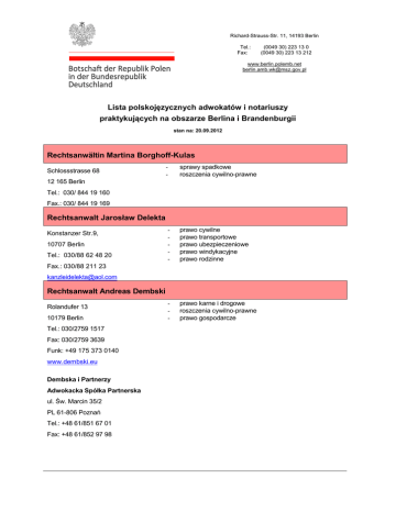 Richard-Strauss-Str. 11, 14193 Berlin Tel.: Fax: (0049 30) 223 13 0 (0049 30) 223 13 212 www.berlin.polemb.net [email protected] Lista polskojęzycznych adwokatów i notariuszy praktykujących na obszarze Berlina i Brandenburgii stan na: 20.09.2012 Rechtsanwältin Martina Borghoff-Kulas Schlossstrasse 68 - sprawy spadkowe roszczenia cywilno-prawne - prawo cywilne prawo transportowe prawo ubezpieczeniowe prawo windykacyjne prawo rodzinne - prawo karne i drogowe roszczenia cywilno-prawne prawo gospodarcze 12 165 Berlin Tel.: 030/ 844 19 160 Fax.: 030/ 844 19 169 Rechtsanwalt Jarosław Delekta Konstanzer Str.9, 10707 Berlin Tel.: 030/88 62 48 20 Fax.: 030/88 211 23 [email protected] Rechtsanwalt Andreas Dembski Rolandufer 13 10179 Berlin Tel.: 030/2759 1517 Fax: 030/2759 3639 Funk: +49 175 373 0140 www.dembski.eu Dembska i Partnerzy Adwokacka Spółka Partnerska ul. Św. Marcin 35/2 PL 61-806 Poznań Tel.: +48 61/851 67 01 Fax: +48 61/852 97 98 Rechtsanwalt und Notar Dr. Peter Diedrich FPS Rechtsanwälte - prawo gospodarcze - prawo karne prawo ruchu drogowego prawo pracy prawo gospodarcze - prawo drogowe i odszkodowania sprawy karne i o wykroczenia sprawy dot. nieruchomości i czynszów - roszczenia cywilno-prawne prawo pracy prawo podatkowe i gospodarcze und Notare Kurfürstendamm 220 10719 Berlin Tel.: 030/ 885927-722 Fax: 030/ 885927-729 Rechtsanwalt Piotr Duber Lindenallee 26 14050 Berlin Tel. +49 30/75457100 Fax. +49 30/75457099 Mobil: +49 176 49916591 [email protected] Rechtsanwalt Arnold Fetzer Reichertstraße 10 02826 Görlitz Tel. +49 3581/4753-0 Fax. +49 3581/4753-20 Mobil: +49 171 7466235 [email protected] Rechtsanwalt Rafael Filla Cunostr. 59 a 14193 Berlin Tel.: 030/89728792 Fax: 030/89728793 Rechtsanwalt und Notar Dr. Gerhard Götz Kurfürstendamm 123 - sprawy spadkowe roszczenia cywilno-prawne 10711 Berlin Tel.: 030/ 8923026 Fax.: 030/ 89009961 [email protected] 2 Rechtsanwalt Christoph Grzimek LL.M. Katharinenstrasse 12 10711 Berlin - roszczenia cywilno-prawne prawo drogowe i transportowe prawo gospodarcze - roszczenia cywilno-prawne Tel.: 030/8900470 Fax: 030/89047100 Mobil: +49 171 384 01 32 [email protected] www.ragrzimek.de Rechtsanwalt Stefan Hambura Dudenstraße 17 10963 Berlin Tel.: + 4930/8877 4485 Fax.: + 4930/8877 4487 Kom. + 49 175 14 96 855 [email protected] Rechtsanwalt und Notar Gerd Hentschel Hauptstrasse 23 13127 Berlin – Buchholz - prawo administracyjne roszczenia cywilno-prawne prawo medyczne Tel.: 030/47411001 Fax.: 030/47411003 Rechtsanwalt und Notar Dr. Jürgen Herrmann Breite Straße 11 - sprawy spadkowe roszczenia cywilno-prawne 13187 Berlin - Pankow Tel.: 030/481 61 50 Fax.: 030/481 61 512 Radca Prawny – Anwältin Grażyna Jopek Müllerstr. 156a 13353 Berlin - prawo rodzinne prawo spadkowe sprawy dot. wykroczeń - sprawy karne sprawy z zakresu karnego postępowania egzekucyjnego sprawy związane z legalnością pobytu Tel.: 030/54737078 Rechtsanwalt Martin Karnetzki Fouquestraße 8 14770 Brandenburg / Havel Tel.: 03381/ 30 97 87 Fax.: 03381/30 78 00 Kom: 0172 395 46 24 3 Rechtsanwalt Piotr Kozłowski Linienstr. 130 10117 Berlin Tel.: + 4930/ 28040776 Kom. + 49 176 271 71 678 - prawo karne prawo gospodarcze i spółek sprawy windykacyjne prawo rodzinne prawo pracy sprawy wypadków, odszkodowań, ubezpieczeń - prawo cywilne prawo rodzinne prawo karne i drogowe prawo pracy [email protected] www.ra-kozlowski.com Rechtsanwalt Kamil Kubitz Sonnenallee 34 12045 Berlin Tel.: 030/627 37 186 Fax: 030/627 37 428 [email protected] Rechtsanwalt Tomasz Kuczyński Bergstrasse 185 - prawo karne 15230 Frankfurt/Oder Tel. +49 335/606751910 Fax. +49 335/606751920 Mobil: +49 172 5413599 [email protected] Rechtsanwalt Martin Kühnl-Mossner Rechtsanwälte Derra, Meyer & Partner - roszczenia cywilno-prawne prawo pracy prawo gospodarcze Schumannstr. 2 10117 Berlin Tel.: +49-30-308784-0 Fax: +49-30-308784-16 Mobil-DE: +49-177-6012875 Mobil-PL: +48-503-772881 [email protected] 4 Rechtsanwalt Peter Kupisz - Kantstr. 154 A 10623 Berlin Tel. 030/ 682 31 1 07 Fax: 030/ 315 90 771 prawo karne prawo pracy prawo rodzinne sprawy dot. obcokrajowców prawo administracyjne prawo ruchu drogowego Kom.: 0163/ 53 494 53 Rechtsanwältin Katarzyna Langewitsch - organizacja samodzielnej działalności gospodarczej (pozwolenia, rejestracje) roszczenia cywilno-prawne sprawy gospodarcze - prawo karne, cywilne i rodzinne prawo handlowe i gospodarcze prawo pracy windykacja należności w RFN - Biernat Langewitsch Roth Auguststraße 34 10119 Berlin-Mitte Tel.: 030/ 28 09 41 50 Fax.: 030/ 28 09 47 44 [email protected] www.mecenas.de Rechtsanwalt Andreas Martin Marzahner Promenade 22 12679 Berlin Tel. +49 30/7492 3427 Fax. +49 30/7492 3828 Al.Wojska Polskiego 31/3 70-470 Szczecin Tel. +4891/885 8014 +4891/814 2503 Fax. +4891/814 25 04 [email protected] Rechtsanwalt Dr. Denis Matthies Rechtsanwältin Dr. Kamila Matthies Lessingstrasse 11a Fachanwalt Strafrecht – specjalista do spraw karnych 15230 Frankfurt (Oder) - prawo karne Tel. 0335/ 86 89 756 - prawo karno-gospodarcze Funk: +48-696 568 151 Fax: 0335/ 86 89 757 [email protected] www.adwokat-niemcy.net www.anwalt-strafrecht.net 5 Rechtsanwalt Stefan Nowak Tauentzienstrasse 18 A 10789 Berlin Tel.: 030/611 33 14 - prawo rodzinne prawo cywilne prawo pracy sprawy dot. odszkodowań Fax: 030/611 19 05 Rechtsanwalt Ludwik Radzanowski Richard-Münch-Str. 24 13591 Berlin Tel./Fax.: 030/ 67 95 20 48 - prawo karne prawo cywilne prawo rodzinne prawo gospodarcze [email protected] Rechtsanwalt und Notar Hans Thomas Rosenkranz (porady w jęz.niemieckim) Kurfürstendamm 213 - sprawy spadkowe roszczenia cywilno-prawne - prawo cywilne prawo pracy prawo drogowe i ubezpieczeniowe - prawo pracy prawo gospodarcze - prawo karne prawo drogowe prawo gospodarcze 10719 Berlin Tel.: 030/ 88 92 57 0 Fax.: 030/ 88 92 57 77 Rechtsanwalt Stefan Slabik Motzener Str. 51 12277 Berlin Tel.: 030/72 01 92 88 Fax: 030/72 01 92 89 Kom.: 0-179- 395 03 27 Strobel Rechtsanwälte August
