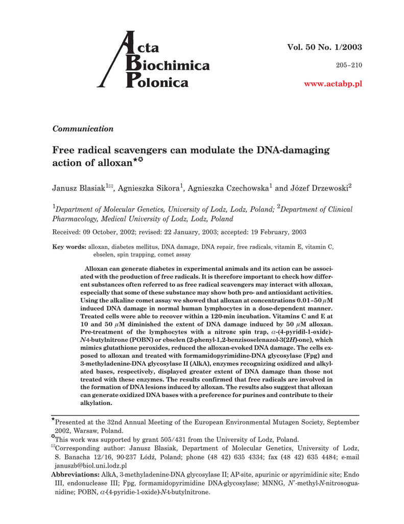 Vol. 50 No. 1/2003 205–210 www.actabp.pl Communication Free radical scavengers can modulate the DNA-damaging action of alloxan*. Janusz Blasiak1½, Agnieszka Sikora1, Agnieszka Czechowska1 and Józef Drzewoski2 1 Department of Molecular Genetics, University of Lodz, Lodz, Poland; 2Department of Clinical Pharmacology, Medical University of Lodz, Lodz, Poland Received: 09 October, 2002; revised: 22 January, 2003; accepted: 19 February, 2003 Key words: alloxan, diabetes mellitus, DNA damage, DNA repair, free radicals, vitamin E, vitamin C, ebselen, spin trapping, comet assay Alloxan can generate diabetes in experimental animals and its action can be associated with the production of free radicals. It is therefore important to check how different substances often referred to as free radical scavengers may interact with alloxan, especially that some of these substance may show both pro- and antioxidant activities. Using the alkaline comet assay we showed that alloxan at concentrations 0.01–50 mM induced DNA damage in normal human lymphocytes in a dose-dependent manner. Treated cells were able to recover within a 120-min incubation. Vitamins C and E at 10 and 50 mM diminished the extent of DNA damage induced by 50 mM alloxan. Pre-treatment of the lymphocytes with a nitrone spin trap, a-(4-pyridil-1-oxide)N-t-butylnitrone (POBN) or ebselen (2-phenyl-1,2-benzisoselenazol-3(2H)-one), which mimics glutathione peroxides, reduced the alloxan-evoked DNA damage. The cells exposed to alloxan and treated with formamidopyrimidine-DNA glycosylase (Fpg) and 3-methyladenine-DNA glycosylase II (AlkA), enzymes recognizing oxidized and alkylated bases, respectively, displayed greater extent of DNA damage than those not treated with these enzymes. The results confirmed that free radicals are involved in the formation of DNA lesions induced by alloxan. The results also suggest that alloxan can generate oxidized DNA bases with a preference for purines and contribute to their alkylation. * Presented at the 32nd Annual Meeting of the European Environmental Mutagen Society, September 2002, Warsaw, Poland. . This work was supported by grant 505/431 from the University of Lodz, Poland. ½ Corresponding author: Janusz Blasiak, Department of Molecular Genetics, University of Lodz, S. Banacha 12/16, 90-237 £ódŸ, Poland; phone (48 42) 635 4334; fax (48 42) 635 4484; e-mail [email protected] Abbreviations: AlkA, 3-methyladenine-DNA glycosylase II; AP-site, apurinic or apyrimidinic site; Endo III, endonuclease III; Fpg, formamidopyrimidine DNA-glycosylase; MNNG, N¢-methyl-N-nitrosoguanidine; POBN, a-(4-pyridie-1-oxide)-N-t-butylnitrone. 206 J. Blasiak and others Alloxan (2,4,5,6-tetraoxypyrimidine; 5,6-dioxyuracil) is known to induce diabetes in experimental animals and its action can induce several processes: oxidation of –SH groups, inhibition of glucokinase, generation of free radicals and disturbances in calcium homeostasis (Szkudelski et al., 1998). In pancreatic b-cells alloxan is reduced in the presence of reducing agents such as reduced glutathione (GSH), cysteine and protein-bound sulfhydryl groups or NADH (Donnini et al., 1996; Lenzen & Munday, 1991; Murata et al., 1998). Reduction of alloxan generates dialuric acid which can be re-oxidized back to alloxan forming a redox cycle for the generation of superoxide radicals in the presence of reducing agents. These radicals and their products can damage DNA. Therefore, the level of DNA damage induced by alloxan can be determined by the use of substances interacting with free radicals. Some of these substances, including vitamins, may display pro- or antioxidant activities, depending on the extra- and intracellular conditions. In this study, we investigated DNA damage evoked by alloxan in normal human peripheral blood lymphocytes using the alkaline comet assay. To search for the mechanisms of this effect we checked the efficacy of various free radical scavengers: vitamins C and E, ebselen (2-phenyl-1,2-benzisoselenazol-3(2H)one) and the spin trap a-(4-pyridil-1-oxide)N-t-butylnitrone (POBN) in modulating the DNA-damaging potential of alloxan. To determine the role of oxidative DNA damage in alloxan genotoxicity, we employed endonuclease III (Endo III) and formamidopyrimidine DNA-glycosylase (Fpg). Endo III converts oxidized pyrimidines into strand breaks, which can be detected by the comet assay (Collins et al., 1993). Fpg is involved in the first step of base excision repair to remove specific modified bases from DNA to create apurinic or apyrimidinic site (AP-site) which is subsequently cleaved by its AP lyase activity giving a gap in the DNA strand, which can be detected by the comet assay (Evans et al., 2003 1997). To check the alkylating potential of alloxan we used 3-methyladenine-DNA glycosylase II (AlkA) which has a broad substrate specificity including alkylated purines, O2-alkylpyrimidines and hypoxanthine (Tudek et al., 1998; Gasparutto et al., 2002). MATERIALS AND METHODS Endo III, Fpg and AlkA were gifts from Drs. B. Tudek and J. T. Kuœmierek of the Institute of Biochemistry and Biophysics, Polish Academy of Sciences (Warsaw, Poland). Lymphocytes were isolated from human peripheral blood by centrifugation in a sucrose density gradient. Alloxan was added to a suspension of the lymphocytes in RPMI 1640 medium to give a final concentration in the range 0.1–1000 mM. Lymphocytes were incubated with alloxan for 1 h at 37°C. Each experiment included a positive control, which was hydrogen peroxide at 10 mM applied for 10 min at 4°C. Ebselen at a final concentration of 50 mM and POBN at 100 mM were added to the cells along with alloxan. In experiments with vitamins the cells were preincubated for 30 min with either of them at 10 or 50 mM, washed and incubated with alloxan. To examine DNA repair, the cells after the treatment with alloxan, as well as control samples, were washed and resuspended in fresh, drug-free RPMI 1640 medium preheated to 37°C. A