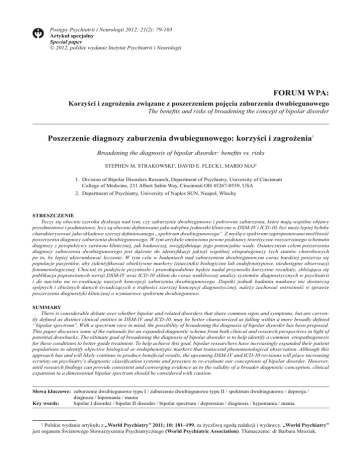 Postępy Psychiatrii i Neurologii 2012; 21(2): 79-103 Artykuł specjalny Special paper © 2012, polskie wydanie Instytut Psychiatrii i Neurologii FORUM WPA: Korzyści i zagrożenia związane z poszerzeniem pojęcia zaburzenia dwubiegunowego The benefits and risks of broadening the concept of bipolar disorder Poszerzenie diagnozy zaburzenia dwubiegunowego: korzyści i zagrożenia1 Broadening the diagnosis of bipolar disorder: benefits vs. risks STEPHEN M. STRAKOWSKI1, DAVID E. FLECK1, MARIO MAJ2 1. Division of Bipolar Disorders Research, Department of Psychiatry, University of Cincinnati College of Medicine, 231 Albert Sabin Way, Cincinnati OH 45267-0559, USA 2. Department of Psychiatry, University of Naples SUN, Neapol, Włochy STRESZCZENIE Toczy się obecnie szeroka dyskusja nad tym, czy zaburzenie dwubiegunowe i pokrewne zaburzenia, które mają wspólne objawy przedmiotowe i podmiotowe, lecz są obecnie definiowane jako odrębne jednostki kliniczne w DSM-IV i ICD-10, być może lepiej byłoby charakteryzować jako składowe szerzej definiowanego „spektrum dwubiegunowego”. Z myślą o spektrum zaproponowano możliwość poszerzenia diagnozy zaburzenia dwubiegunowego. W tym artykule omówiono pewne podstawy teoretyczne rozszerzonego schematu diagnozy z perspektywy zarówno klinicznej, jak badawczej, uwzględniając jego potencjalne wady. Ostatecznym celem poszerzenia diagnozy zaburzenia dwubiegunowego jest dążenie do identyfikacji jakiejś wspólnej etiopatogenezy tych stanów chorobowych po to, by lepiej ukierunkować leczenie. W tym celu w badaniach nad zaburzeniem dwubiegunowym coraz bardziej poszerza się populacje pacjentów, aby zidentyfikować obiektywne markery (znaczniki) biologiczne lub endofenotypowe, niedostępne obserwacji fenomenologicznej. Chociaż to podejście przyniosło i prawdopodobnie będzie nadal przynosiło korzystne rezultaty, zbliżająca się publikacja poprawionych wersji DSM-IV oraz ICD-10 skłoni do coraz wnikliwszej analizy systemów diagnostycznych w psychiatrii i do nacisku na re-ewaluację naszych koncepcji zaburzenia dwubiegunowego. Dopóki jednak badania naukowe nie dostarczą spójnych i zbieżnych danych świadczących o trafności szerszej koncepcji diagnostycznej, należy zachować ostrożność w sprawie poszerzenia diagnostyki klinicznej o wymiarowe spektrum dwubiegunowe. SUMMARY There is considerable debate over whether bipolar and related disorders that share common signs and symptoms, but are currently defined as distinct clinical entities in DSM-IV and ICD-10, may be better characterized as falling within a more broadly defined “bipolar spectrum”. With a spectrum view in mind, the possibility of broadening the diagnosis of bipolar disorder has been proposed. This paper discusses some of the rationale for an expanded diagnostic scheme from both clinical and research perspectives in light of potential drawbacks. The ultimate goal of broadening the diagnosis of bipolar disorder is to help identify a common etiopathogenesis for these conditions to better guide treatment. To help achieve this goal, bipolar researchers have increasingly expanded their patient populations to identify objective biological or endophenotypic markers that transcend phenomenological observation. Although this approach has and will likely continue to produce beneficial results, the upcoming DSM-IV and ICD-10 revisions will place increasing scrutiny on psychiatry’s diagnostic classification systems and pressure to re-evaluate our conceptions of bipolar disorder. However, until research findings can provide consistent and converging evidence as to the validity of a broader diagnostic conception, clinical expansion to a dimensional bipolar spectrum should be considered with caution. Słowa kluczowe: zaburzenie dwubiegunowe typu I / zaburzenie dwubiegunowe typu II / spektrum dwubiegunowe / depresja / diagnoza / hipomania / mania Key words: bipolar I disorder / bipolar II disorder / bipolar spectrum / depression / diagnosis / hypomania / mania 1 Polskie wydanie artykułu z „World Psychiatry” 2011; 10: 181–199, za życzliwą zgodą redakcji i wydawcy. „World Psychiatry” jest organem Światowego Stowarzyszenia Psychiatrycznego (World Psychiatric Association). Tłumaczenie: dr Barbara Mroziak. 80 FORUM WPA: Korzyści i zagrożenia związane z poszerzeniem pojęcia zaburzenia dwubiegunowego Zaburzenie dwubiegunowe jest chorobą dynamiczną, którą charakteryzują radykalne zmiany nastroju, energii, procesów poznawczych i zachowania oraz ich fluktuacja w czasie. Nie ma obiektywnych markerów zaburzenia dwubiegunowego, a zatem rozpoznanie opiera się na ocenie klinicznej owych zmieniających się objawów, po to, by umieścić je w jakimś diagnostycznym układzie odniesienia (np. DSM-IV czy ICD-10) [1]. Wiele objawów, na podstawie których definiuje się zaburzenie dwubiegunowe, występuje jednak także w innych psychiatrycznych jednostkach chorobowych. Wobec tego określenie brzegów (granic) diagnozy dwubiegunowej może być trudne. Trudność tę potęgują zmienne wskaźniki rozpowszechnienia obserwowane w badaniach epidemiologicznych. Na przykład, w Epidemiological Catchment Area Study stwierdzono, że roczny wskaźnik rozpowszechnienia zaburzenia dwubiegunowego typu I wynosi 0,9%, a zaburzenia dwubiegunowego typu II 0,4%; kiedy jednak zastosowano kryteria istotności statystycznej, wskaźniki te spadły odpowiednio do 0,5% i 0,2% [2]. Co więcej, w tym samym badaniu wskaźnik częstości występowania podprogowej manii/hipomanii w ciągu całego życia przekraczał 5% [3]. Hirschfeld i wsp. [4] dowodzą, że łączny wskaźnik rozpowszechnienia zaburzenia dwubiegunowego typu I i II w populacji przekracza 3%, jeśli stosuje się odpowiednio czułe narzędzia, lecz Zimmerman i wsp. [5] przypuszczają, że takie narzędzia zawyżają częstość diagnozy zaburzenia dwubiegunowego, przez błędne przypisywanie objawów innych jednostek chorobowych. Zmie