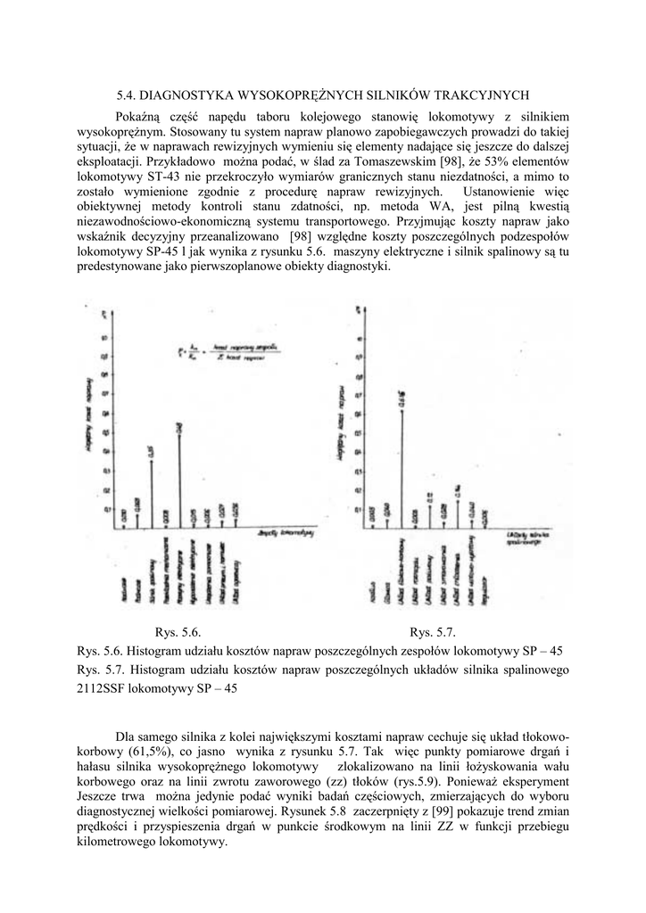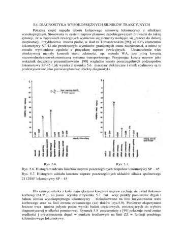 5.4. DIAGNOSTYKA WYSOKOPRĘŻNYCH SILNIKÓW TRAKCYJNYCH Pokaźną część napędu taboru kolejowego stanowię lokomotywy z silnikiem wysokoprężnym. Stosowany tu system napraw planowo zapobiegawczych prowadzi do takiej sytuacji, że w naprawach rewizyjnych wymieniu się elementy nadające się jeszcze do dalszej eksploatacji. Przykładowo można podać, w ślad za Tomaszewskim [98], że 53% elementów lokomotywy ST-43 nie przekroczyło wymiarów granicznych stanu niezdatności, a mimo to zostało wymienione zgodnie z procedurę napraw rewizyjnych. Ustanowienie więc obiektywnej metody kontroli stanu zdatności, np. metoda WA, jest pilną kwestią niezawodnościowo-ekonomiczną systemu transportowego. Przyjmując koszty napraw jako wskaźnik decyzyjny przeanalizowano [98] względne koszty poszczególnych podzespołów lokomotywy SP-45 l jak wynika z rysunku 5.6. maszyny elektryczne i silnik spalinowy są tu predestynowane jako pierwszoplanowe obiekty diagnostyki. Rys. 5.6. Rys. 5.7. Rys. 5.6. Histogram udziału kosztów napraw poszczególnych zespołów lokomotywy SP – 45 Rys. 5.7. Histogram udziału kosztów napraw poszczególnych układów silnika spalinowego 2112SSF lokomotywy SP – 45 Dla samego silnika z kolei największymi kosztami napraw cechuje się układ tłokowokorbowy (61,5%), co jasno wynika z rysunku 5.7. Tak więc punkty pomiarowe drgań i hałasu silnika wysokoprężnego lokomotywy zlokalizowano na linii łożyskowania wału korbowego oraz na linii zwrotu zaworowego (zz) tłoków (rys.5.9). Ponieważ eksperyment Jeszcze trwa można jedynie podać wyniki badań częściowych, zmierzających do wyboru diagnostycznej wielkości pomiarowej. Rysunek 5.8 zaczerpnięty z [99] pokazuje trend zmian prędkości i przyspieszenia drgań w punkcie środkowym na linii ZZ w funkcji przebiegu kilometrowego lokomotywy. Rys. 5.8 ∧ Rys.5.8. Zmiany amplitudy przyspieszeń w funkcji przebiegu lokomotywy w punkcie D2 : a ≈ − przyspieszenie szczytowe, a - przyspieszenie skuteczne, a - przyspieszenie średnie oraz przebieg zmian amplitudy prędkości drgań w punkcie D2, widoczny wzrost odpowiada uszkodzeniom prądnicy [98]. Jak widać stąd, największą wrażliwością na stopniową degradację silnika i nagłe uszkodzenie prądnicy cechują się wartości szczytowe przyspieszenia a zwłaszcza prędkości. Podobnymi własnościami cechuje się współczynnik szczytu C i impulsywności I tych wielkości, co łatwo wydedukować z rysunku 5.8. Tak więc zgrubny wybór wielkości ∧ pomiarowej można uznać za zadowalający ( v lub Iv). Do rozstrzygnięcia pozostaje jeszcze kwestia lokalizacji (rozróżniania) uszkodzeń i ustanowienia wartości granicznych mierzonych symptomów. Rys.5.9. Miejsce odbioru sygnału drgań i hałasu na korpusie silnika lokomotywy SP-45 [98]