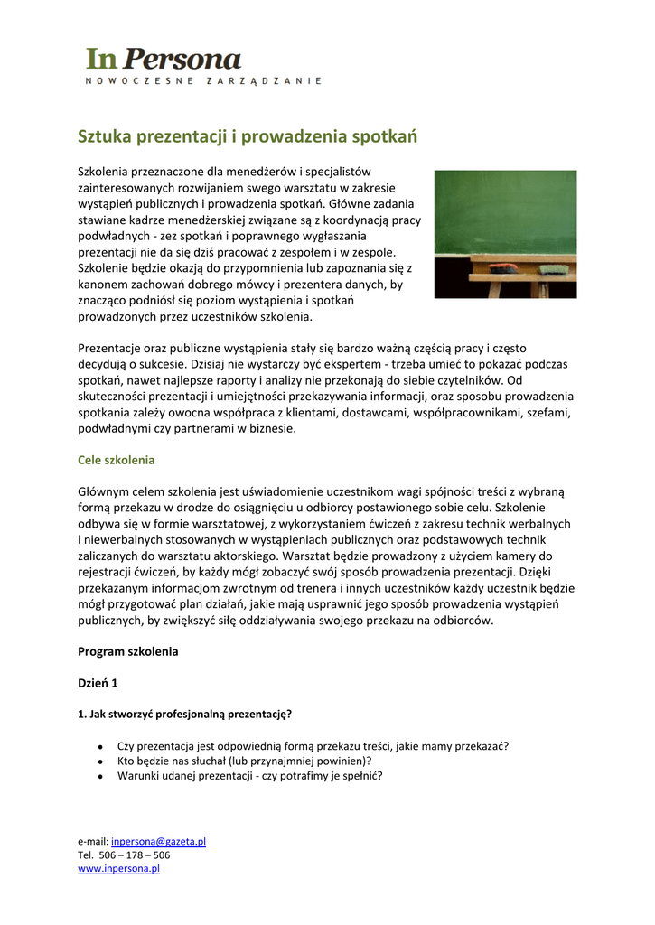 Sztuka prezentacji i prowadzenia spotkań Szkolenia przeznaczone dla menedżerów i specjalistów zainteresowanych rozwijaniem swego warsztatu w zakresie wystąpień publicznych i prowadzenia spotkań. Główne zadania stawiane kadrze menedżerskiej związane są z koordynacją pracy podwładnych - zez spotkań i poprawnego wygłaszania prezentacji nie da się dziś pracować z zespołem i w zespole. Szkolenie będzie okazją do przypomnienia lub zapoznania się z kanonem zachowań dobrego mówcy i prezentera danych, by znacząco podniósł się poziom wystąpienia i spotkań prowadzonych przez uczestników szkolenia. Prezentacje oraz publiczne wystąpienia stały się bardzo ważną częścią pracy i często decydują o sukcesie. Dzisiaj nie wystarczy być ekspertem - trzeba umieć to pokazać podczas spotkań, nawet najlepsze raporty i analizy nie przekonają do siebie czytelników. Od skuteczności prezentacji i umiejętności przekazywania informacji, oraz sposobu prowadzenia spotkania zależy owocna współpraca z klientami, dostawcami, współpracownikami, szefami, podwładnymi czy partnerami w biznesie. Cele szkolenia Głównym celem szkolenia jest uświadomienie uczestnikom wagi spójności treści z wybraną formą przekazu w drodze do osiągnięciu u odbiorcy postawionego sobie celu. Szkolenie odbywa się w formie warsztatowej, z wykorzystaniem ćwiczeń z zakresu technik werbalnych i niewerbalnych stosowanych w wystąpieniach publicznych oraz podstawowych technik zaliczanych do warsztatu aktorskiego. Warsztat będzie prowadzony z użyciem kamery do rejestracji ćwiczeń, by każdy mógł zobaczyć swój sposób prowadzenia prezentacji. Dzięki przekazanym informacjom zwrotnym od trenera i innych uczestników każdy uczestnik będzie mógł przygotować plan działań, jakie mają usprawnić jego sposób prowadzenia wystąpień publicznych, by zwiększyć siłę oddziaływania swojego przekazu na odbiorców. Program szkolenia Dzień 1 1. Jak stworzyć profesjonalną prezentację? Czy prezentacja jest odpowiednią formą przekazu treści, jakie mamy przekazać? Kto będzie nas słuchał (lub przynajmniej powinien)? Warunki udanej prezentacji - czy potrafimy je spełnić? e-mail: [email protected] Tel. 506 – 178 – 506 www.inpersona.pl 2. Metody i techniki stosowane w sztuce prezentacji Temat, miejsce i przebieg prezentacji Wykorzystanie narzędzi wizualizacji (flipchart, prezentacje multimedialne, filmy). Jak nie zabijać prezentacji złymi slajdami - czyli trochę o tym, jak INACZEJ pracować z MS Power Point. 3. Jak budzić zaufanie i przekonywać do swego zdania? Mowa ciała - gest, mimika, ruch, ekspresja, przestrzeń. Głos - artykulacja, dykcja, rezonatory. Techniki oddziaływania na odbiorcę - metafora, przekazywanie intencji, budowanie więzi i identyfikacji z przekazem. Aktywne mówienie, świadome używanie: głosu, oddechu, pauzy, akcentu, intonacji. Zgodność przekazu - dopasowanie treści i formy. 4. Angażowanie uczestników w trakcie prezentacji Obserwacja audytorium. Trudni uczestnicy - jak radzić sobie i jak przekonać do własnego zdania? Zwolennicy - jak znaleźć wsparcie i zjednać dla naszego przekazu? Dzień 2 5. Prowadzenie prezentacji - ćwiczenia. Przygotowanie prezentacji. Przeprowadzenie i nagranie prezentacji. Informacja zwrotna nt. prezentacji od trenera i uczestników. 6. Jak przeprowadzić udane spotkanie? Cel spotkania - czy w ogóle trzeba się spotykać?. Jak dobrać uczestników oraz miejsca spotkania? Plan spotkania, struktura oraz techniki prezentacji/narzędzia. Co robić z trudnymi uczestnikami? Zamykanie spotkania i zbieranie wniosków. 7. Efekty spotkania po spotkaniu – jak wprowadzić w życie wnioski ze spotkania? 8. Podsumowanie i zakończenie szkolenia Jakie korzyści mogę mieć z bycia asertywnym - czego dowiedziałem się o sobie? Indywidualny plan działań wdrożenia paradygmatu asertywności w różnych obszarach mojego funkcjonowania. Czas trwania: 2 dni szkoleniowe Liczba uczestników: 8-15 osób Koszt udziału w szkoleniu: 750 PLN + 23% VAT. e-mail: [email protected] Tel. 506 – 178 – 506 www.inpersona.pl Cena obejmuje udział w szkoleniu, materiały szkoleniowe i catering. Terminy szkolenia ustalone będą po zebraniu grupy. Prosimy wysłać zgłoszenie przez Formularz Zgłoszenia e-mail: [email protected] Tel. 506 – 178 – 506 www.inpersona.pl