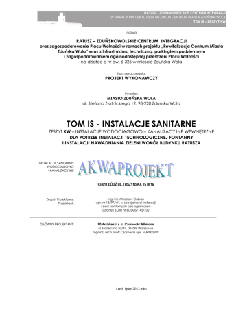 RATUSZ - ZDUŃSKOWOLSKIE CENTRUM INTEGRACJI W RAMACH PROJEKTU REWITALIZACJA CENTRUM MIASTA ZDUŃSKA WOLA TOM IS – ZESZYT KW nazwa: RATUSZ – ZDUŃSKOWOLSKIE CENTRUM INTEGRACJI oraz zagospodarowanie Placu Wolności w ramach projektu „Rewitalizacja Centrum Miasta Zduńska Wola” wraz z infrastrukturą techniczną, parkingiem podziemnym i zagospodarowaniem ogólnodostępnej przestrzeni Placu Wolności na działce o nr ew. 6-325 w mieście Zduńska Wola faza opracowania: PROJEKT WYKONAWCZY inwestor: MIASTO ZDUŃSKA WOLA ul. Stefana Złotnickiego 12, 98-220 Zduńska Wola TOM IS - INSTALACJE SANITARNE ZESZYT KW – INSTALACJE WODOCIĄGOWO – KANALIZACYJNE WEWNĘTRZNE DLA POTRZEB INSTALACJI TECHNOLOGICZNEJ FONTANNY I INSTALACJI NAWADNIANIA ZIELENI WOKÓŁ BUDYNKU RATUSZA INSTALACJE SANITARNE: WODOCIĄGOWO - KANALIZACYJNE 93-011 ŁÓDŹ UL.TUSZYŃSKA 25 M.16 Zespół Projektowy: Projektant: GŁÓWNY PROJEKTANT: mgr inŜ. Mirosław Caban upr. nr 18/97/WŁ w specjalności instalacji i sieci sanitarnych bez ograniczeń członek ŁOIIB nr ŁOD/IS/1457/02 90 Architekci s. c. Czarnecki Willmann ul Słoneczna 50/47, 00-789 Warszawa mgr inŜ. arch. Piotr Czarnecki upr. MA/005/09 Łódź, lipiec 2013 roku SPIS TREŚCI 1 2 CZĘŚĆ OGÓLNA.................................................................................................................................................. 3 1.1 Przedmiot opracowania................................................................................................................................ 3 1.2 Podstawa opracowania................................................................................................................................ 3 1.3 Podstawowe przepisy prawne ..................................................................................................................... 3 1.4 Polskie Normy .............................................................................................................................................. 3 1.5 Charakterystyka instalacji ............................................................................................................................ 3 1.5.1 Instalacja wodociągowa........................................................................................................................... 3 1.5.2 Instalacja kanalizacyjna........................................................................................................................... 3 CZĘŚĆ TECHNOLOGICZNA ............................................................................................................................... 4 2.1 2.1.1 Instalacja wodociągowa dla potrzeb fontanny........................................................................................ 4 2.1.2 Instalacja wodociągowa dla potrzeb nawadniania zieleni wokół budynku Ratusza. ............................ 4 2.2 2.2.1 3 Instalacje wodociągowe ............................................................................................................................... 4 Instalacje kanalizacyjne ............................................................................................................................... 5 Instalacja kanalizacji dla potrzeb fontanny ............................................................................................. 5 CZĘŚĆ GRAFICZNA ............................................................................................................................................ 6 Rys nr KW.02.01 Rzut GaraŜu. Instalacja wodociągowa w skali 1:100 2 1 CZĘŚĆ OGÓLNA 1.1 Przedmiot opracowania Przedmiotem opracowania jest projekt odcinków instalacji wodociągowo-kanalizacyjnej wewnętrznej i zewnętrznej, doziemnej dla potrzeb instalacji technologicznej fontanny i instalacji nawadniania zieleni wokół budynku Ratusza na Placu Wolności w Zduńskiej Woli. Uwaga : Pozostałe opracowania projektowe branŜy wodociągowo – kanalizacyjnej to: Tom IS – Instalacje sanitarne, Zeszyt KZ1 – Przyłącza i instalacje wodociągowo –kanalizacyjne zewnętrzne Tom IS – Instalacje sanitarne, Zeszyt KW1 – Instalacje wodociągowo –kanalizacyjne wewnętrzne 1.2 1.3 1.4 1.5 Podstawa opracowania umowa z Inwestorem mapa do celów projektowych w skali 1:500 wytyczne technologiczne firmy Gardenart Warszawa normy i przepisy projektowania. Podstawowe przepisy prawne Ustawa Prawo Budowlane z dnia 7 lipca 1994r wraz z późniejszymi zmianami. Warunki techniczne, jakim powinny odpowiadać budynki i ich usytuowanie – stan prawny na dzień 15.05.2004r. Rozporządzenie Ministra Pracy i Polityki Socjalnej z dnia 26 września 1997r. w sprawie ogólnych przepisów bezpieczeństwa i higieny pracy. Rozporządzenie Ministra Zdrowia z dnia 29 marca 2007r. (Dz. Ustaw Nr 61 poz.417 z 2007r.) w sprawie jakim powinna odpowiadać warunkom woda do picia i potrzeby gospodarcze. Polskie Normy PN-92/B-01706 Instalacje wodociągowe. Wymagania w projektowaniu. PN-92/B-01707 Instalacje kanalizacyjne. Wymagania w projektowaniu. Charakterystyka instalacji 1.5.1 Instalacja wodociągowa Instalacje technologiczne będą zasilane w wodę następująco: Instalacja technologiczna fontanny zlokalizowana w pomieszczeniu węzła cieplnego (pom. nr -1.12) z instalacji wodociągowej wody zimnej w tym pomieszczeniu, Instalacja nawadniania zieleni zlokalizowana w pomieszczeniu przyłącza wody (pom. nr -1.06) z instalacji wody zimnej za zestawem pompowym podnoszenia ciśnienia wody. Instalacja wodociągowa wewnętrzna jest projektowana w postaci czterech przewodów wodociągowych: woda zimna, ciepła, cyrkulacyjna jako rury z tworzywa sztucznego oraz instalacja hydrantowa z rur stalowych ocynkowanych. 1.5.2 Instalacja kanalizacyjna Instalacje technologiczne będą odprowadzały wody technologiczne następująco: Instalacja technologiczna fontanny zlokalizowana w pomieszczeniu węzła cieplnego (pom. nr -1.12) z płukania filtra pośpiesznego i spustó
