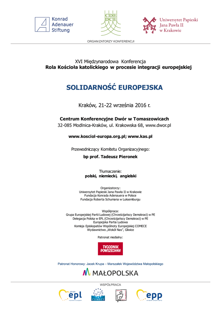 XVI Międzynarodowa Konferencja Rola Kościoła katolickiego w procesie integracji europejskiej SOLIDARNOŚĆ EUROPEJSKA Kraków, 21-22 września 2016 r. Centrum Konferencyjne Dwór w Tomaszowicach 32-085 Modlnica-Kraków, ul. Krakowska 68, www.dwor.pl www.kosciol-europa.org.pl; www.kas.pl Przewodniczący Komitetu Organizacyjnego: bp prof. Tadeusz Pieronek Tłumaczenie: polski, niemiecki, angielski Organizatorzy: Uniwersytet Papieski Jana Pawła II w Krakowie Fundacja Konrada Adenauera w Polsce Fundacja Roberta Schumana w Luksemburgu Współpraca: Grupa Europejskiej Partii Ludowej (Chrześcijańscy Demokraci) w PE Delegacja Polska w EPL (Chrześcijańscy Demokraci) w PE Europejska Partia Ludowa Komisja Episkopatów Wspólnoty Europejskiej COMECE Wydawnictwo „Wokół Nas”, Gliwice Patronat medialny: Środa, 21 września 2016 r. 10.00 Rejestracja uczestników 10.30 Otwarcie i powitanie Bp prof. Tadeusz Pieronek, Przewodniczący Komitetu Organizacyjnego Kard. dr Stanisław Dziwisz, Arcybiskup Metropolita Krakowa Jakob Wöllenstein, Koordynator projektów w Europie Środkowo-Wschodniej Fundacji Konrada Adenauera, Berlin, p.o. Dyrektora FKA w Polsce Horst Langes, Honorowy Prezydent Fundacji R. Schumana w Luksemburgu Jacek Krupa, Marszałek Województwa Małopolskiego Dr Janusz Lewandowski, Przewodniczący Polskiej Delegacji w EPL Andrzej Grzyb, Współprzewodniczący Polskiej Delegacji w EPL O. Olivier Poquillon OP, Sekretarz Generalny COMECE 11.30 – 12.30 Wystąpienia wprowadzające: Dr Hans-Gert Pöttering, b. Przewodniczący Parlamentu Europejskiego, Przewodniczący Fundacji Konrada Adenauera SOLIDARNOŚĆ EUROPEJSKA - w polityce bezpieczeństwa Abp Silviano M. Tomasi C.S., b. Przedstawiciel Stolicy Apostolskiej przy ONZ w Genewie SOLIDARNOŚĆ EUROPEJSKA - wobec problemu migrantów i azylantów Prof. Jerzy Buzek, Poseł do PE, b. Przewodniczący Parlamentu Europejskiego, b. Premier RP SOLIDARNOŚĆ EUROPEJSKA - w polityce energetycznej i klimatycznej 12.30 Lunch 14.00-16.00 I Grupa robocza tłumaczenie: polski, angielski miejsce: Sala Szklana w Galerii Panorama SOLIDARNOŚĆ EUROPEJSKA - w polityce bezpieczeństwa Dyskusja: Gen. dr Mieczysław Bieniek, Generał Wojska Polskiego w stanie spoczynku Giorgi Gobronidze, Dziekan Uniwersytetu Pedagogicznego Sulkhan-Saba Orbeliani w Tbilisi Ks. Lubomir Jaworski, Prawosławny Ordynariat Polowy Wojska Republiki Ukrainy Moderacja: Marek Sarjusz-Wolski, Redaktor naczelny miesięcznika Para Bellum II Grupa robocza tłumaczenie: polski, angielski miejsce: Oranżeria SOLIDARNOŚĆ EUROPEJSKA - wobec problemu migrantów i azylantów Dyskusja: Dr Adam Bodnar, Rzecznik Praw Obywatelskich Ks. dr Matthew John Gardzinski SChr, Papieska Rada ds. Duszpasterstwa Migrantów i Podróżujących Janina Ochojska, Prezes Polskiej Akcji Humanitarnej José-Luis Bazán, Doradca COMECE ds. Migracji, Azylu i Wolności Religijnej Moderacja: Marek Orzechowski, dziennikarz, publicysta III Grupa robocza tłumaczenie: polski, angielski miejsce: Sala Ogrodowa w hotelu SOLIDARNOŚĆ EUROPEJSKA - w polityce energetycznej i klimatycznej Dyskusja: Dr Jacek Saryusz-Wolski, Poseł do PE, Wiceprzewodniczący EPL (Polska) Ołeksij Riabczyn, Przewodniczący Podkomisji Bezpieczeństwa Energetycznego i Efektywności Energetycznej w Komisji ds. Energii, Polityki Nuklearnej i Bezpieczeństwa Atomowego Rady Najwyższej Ukrainy Moderacja: Andrzej Godlewski, dziennikarz, b. z-ca dyrektora TVP1 16.00 Przerwa kawowa Podpisywanie publikacji: „Na szczęście jesteśmy zjednoczeni. Moja europejska droga” przez autora – dr. Hansa-Gerta Pötteringa, b. Przewodniczącego Parlamentu Europejskiego oraz Przewodniczącego Fundacji Konrada Adenauera 16.30-18.00 Grupy robocze c.d. 18.15 Wyjazd do centrum Krakowa 19.00 Msza św. w Kościele OO. Bernardynów w Krakowie, ul. Bernardyńska 2. Po Eucharystii przyjęcie na zaproszenie Marszałka Województwa Małopolskiego Czwartek , 22 września 2016 r. 08.00 Msza Święta w Kościele św. Wojciecha i Matki Bożej Bolesnej w Modlnicy, ul. św. Wojciecha 83 09.30 -11.00 Podsumowanie prac w grupach roboczych I grupa robocza: redaktor Tygodnika Powszechnego II grupa robocza: redaktor Tygodnika Powszechnego III grupa robocza: redaktor Tygodnika Powszechnego 11.00 Przerwa kawowa 11.30 – 13.30 Sesja specjalna: SOLIDARNOŚĆ - między Kościołami i wspólnotami religijnymi Aloiz Peterle, Poseł do PE (Słowenia) Ján Figel’, Specjalny Wysłannik ds. promocji wolności religii i przekonań religijnych poza granicami UE (niepotw.) Ks. prof. Józef Budniak, Uniwersytet Śląski w Katowicach, były Prezydent Międzynarodowej Wspólnoty Ekumenicznej. Ks. Bohdan Dziurach, Sekretarz Synodu Biskupów Ukraińskiego Kościoła grecko-katolickiego Abp Jewstratij Zoria, Arcybiskup czernihowski i niżyński Ukraińskiego Kościoła Prawosławnego Patriarchatu Kijowskiego, Sekretarz Świętego Synodu Patriarchatu Kijowskiego Ks. Mykoła Danilewycz, Ukraiński Kościół Prawosławny Patriarchatu Moskiewskiego Moderacja: Dr Ewa Czaczkowska, UKSW 13.45 Podsumowanie i zakończenie konferencji Ks. prof. Wojciech Zyzak, Rektor Uniwersytetu Papieskiego Jana Pawła II w Krakowie 14.00 Lunch i wyjazd uczestników