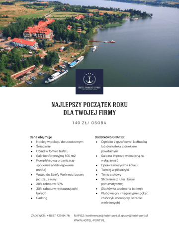 140 ZŁ/ OSOBA Cena obejmuje Dodatkowo GRATIS: Nocleg w pokoju dwuosobowym Ognisko z grzańcem i kiełbaską Śniadanie lub dyskoteka z drinkiem Obiad w formie bufetu powitalnym Salę konferencyjną 100 m2 Sala na imprezę wieczorną na Kompleksową organizację wyłączność spotkania (oddelegowana Oprawa muzyczna kolacji osoba) Turniej w piłkarzyki Wstęp do Strefy Wellness: basen, Tenis stołowy jacuzzi, sauny Strzelanie z łuku i broni 30% rabatu w SPA pneumatycznej 30% rabatu w restauracjach i Siatkówka wodna na basenie barach Klubowe gry integracyjne (poker, Parking chińczyk, monopoly, scrable i wiele innych) ZADZWOŃ: +48 87 429 84 76 NAPISZ: [email protected], [email protected] WWW.HOTEL-PORT.PL W SPECJALNYCH CENACH Przerwa kawowa od 12 zł za os. Kolacja bufetowa od 55 zł za os. Kolacja uroczysta od 100 zł za os. Open bar (piwo, wódka, napoje) od 70 zł za os./5 godz. Warsztaty kulinarne od 40 zł za os. 20 zł za os. 350 zł 3 godz. 35 zł za os./45 min. Warsztaty SPA (peeling) Oprawa muzyczna ogniska (grajek) Kulig z grzanym winem i pochodniami Biesiadne zabawy integracyjne Regionalny prezent wyścigi na szczudłach nalewka 250 ml wbijanie gwoździ „dziwnym smalec domowy z cebulką i młotkiem” skwarkami 200 ml piłowanie bala piłą twoja-moja grzyby lub miód lub domowe konfitury 200 ml CENA: 300 zł/ 3h CENA: od 38 zł/ prezent Oferta ważna do 31 stycznia 2016 Oferta obowiązuje dla grup min. 20 osób ZADZWOŃ: +48 87 429 84 76 NAPISZ: [email protected], [email protected] WWW.HOTEL-PORT.PL RESORT SPA NA MAZURACH Czterogwiazdkowy hotel położony w malowniczej wsi Stare Sady, bezpośrednio nad jeziorem Tałty, tylko 4 km od Mikołajek. 158 pokoi Dwie restauracje Basen, jacuzzi, sauny Salon SPA „Witalna Przystań” 3 wielofunkcyjne sale konferencyjne Sala konferencyjna pow. teatr podkowa szkolnie bankiet Czerwona AB 350 m2 160 120 120 180 Czerwona A 200 m2 100 50 60 - Czerwona B 150 m2 90 25 60 - Niebieska 110 m2 110 40 50 70 Zielona 100 m2 90 30 40 60 ZADZWOŃ: +48 87 429 84 76 NAPISZ: [email protected], [email protected] WWW.HOTEL-PORT.PL
