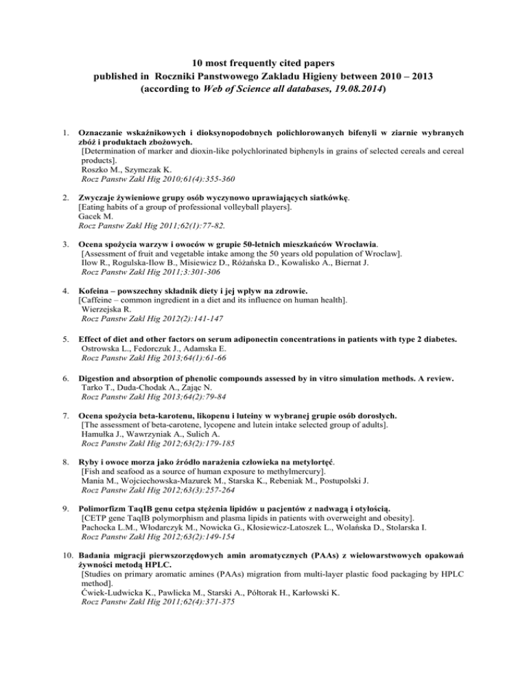 10 most frequently cited papers published in Roczniki Panstwowego Zakladu Higieny between 2010 – 2013 (according to Web of Science all databases, 19.08.2014) 1. Oznaczanie wskaźnikowych i dioksynopodobnych polichlorowanych bifenyli w ziarnie wybranych zbóż i produktach zbożowych. [Determination of marker and dioxin-like polychlorinated biphenyls in grains of selected cereals and cereal products]. Roszko M., Szymczak K. Rocz Panstw Zakl Hig 2010;61(4):355-360 2. Zwyczaje żywieniowe grupy osób wyczynowo uprawiających siatkówkę. [Eating habits of a group of professional volleyball players]. Gacek M. Rocz Panstw Zakl Hig 2011;62(1):77-82. 3. Ocena spożycia warzyw i owoców w grupie 50-letnich mieszkańców Wrocławia. [Assessment of fruit and vegetable intake among the 50 years old population of Wroclaw]. Ilow R., Rogulska-Ilow B., Misiewicz D., Różańska D., Kowalisko A., Biernat J. Rocz Panstw Zakl Hig 2011;3:301-306 4. Kofeina – powszechny składnik diety i jej wpływ na zdrowie. [Caffeine – common ingredient in a diet and its influence on human health]. Wierzejska R. Rocz Panstw Zakl Hig 2012(2):141-147 5. Effect of diet and other factors on serum adiponectin concentrations in patients with type 2 diabetes. Ostrowska L., Fedorczuk J., Adamska E. Rocz Panstw Zakl Hig 2013;64(1):61-66 6. Digestion and absorption of phenolic compounds assessed by in vitro simulation methods. A review. Tarko T., Duda-Chodak A., Zając N. Rocz Panstw Zakl Hig 2013;64(2):79-84 7. Ocena spożycia beta-karotenu, likopenu i luteiny w wybranej grupie osób dorosłych. [The assessment of beta-carotene, lycopene and lutein intake selected group of adults]. Hamułka J., Wawrzyniak A., Sulich A. Rocz Panstw Zakl Hig 2012;63(2):179-185 8. Ryby i owoce morza jako źródło narażenia człowieka na metylortęć. [Fish and seafood as a source of human exposure to methylmercury]. Mania M., Wojciechowska-Mazurek M., Starska K., Rebeniak M., Postupolski J. Rocz Panstw Zakl Hig 2012;63(3):257-264 9. Polimorfizm TaqIB genu cetpa stężenia lipidów u pacjentów z nadwagą i otyłością. [CETP gene TaqIB polymorphism and plasma lipids in patients with overweight and obesity]. Pachocka L.M., Włodarczyk M., Nowicka G., Kłosiewicz-Latoszek L., Wolańska D., Stolarska I. Rocz Panstw Zakl Hig 2012;63(2):149-154 10. Badania migracji pierwszorzędowych amin aromatycznych (PAAs) z wielowarstwowych opakowań żywności metodą HPLC. [Studies on primary aromatic amines (PAAs) migration from multi-layer plastic food packaging by HPLC method]. Ćwiek-Ludwicka K., Pawlicka M., Starski A., Półtorak H., Karłowski K. Rocz Panstw Zakl Hig 2011;62(4):371-375