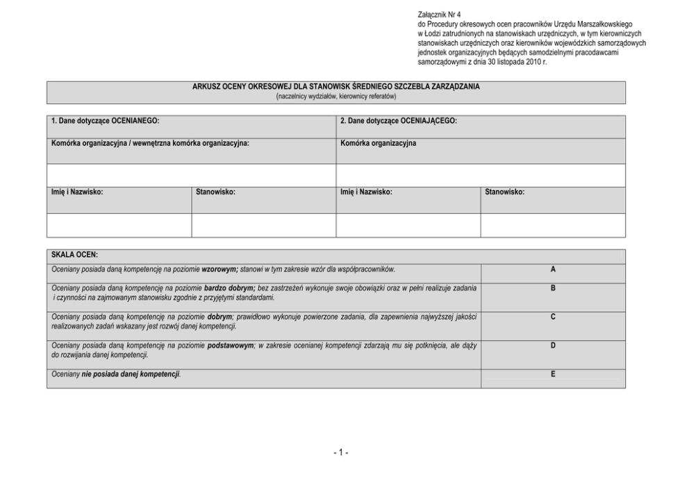 Załącznik Nr 4 do Procedury okresowych ocen pracowników Urzędu Marszałkowskiego w Łodzi zatrudnionych na stanowiskach urzędniczych, w tym kierowniczych stanowiskach urzędniczych oraz kierowników wojewódzkich samorządowych jednostek organizacyjnych będących samodzielnymi pracodawcami samorządowymi z dnia 30 listopada 2010 r. ARKUSZ OCENY OKRESOWEJ DLA STANOWISK ŚREDNIEGO SZCZEBLA ZARZĄDZANIA (naczelnicy wydziałów, kierownicy referatów) 1. Dane dotyczące OCENIANEGO: 2. Dane dotyczące OCENIAJĄCEGO: Komórka organizacyjna / wewnętrzna komórka organizacyjna: Komórka organizacyjna Imię i Nazwisko: Imię i Nazwisko: Stanowisko: Stanowisko: SKALA OCEN: Oceniany posiada daną kompetencję na poziomie wzorowym; stanowi w tym zakresie wzór dla współpracowników. A Oceniany posiada daną kompetencję na poziomie bardzo dobrym; bez zastrzeŜeń wykonuje swoje obowiązki oraz w pełni realizuje zadania i czynności na zajmowanym stanowisku zgodnie z przyjętymi standardami. B Oceniany posiada daną kompetencję na poziomie dobrym; prawidłowo wykonuje powierzone zadania, dla zapewnienia najwyŜszej jakości realizowanych zadań wskazany jest rozwój danej kompetencji. C Oceniany posiada daną kompetencję na poziomie podstawowym; w zakresie ocenianej kompetencji zdarzają mu się potknięcia, ale dąŜy do rozwijania danej kompetencji. D Oceniany nie posiada danej kompetencji. E -1- I. KOMPETENCJE KLUCZOWE – kompetencje obowiązkowe, wspólne dla wszystkich ocenianych, niezaleŜnie od szczebla zarządzania. Kompetencje kluczowe A Definicja kompetencji wzorowy 1. Postawa etyczna 2. Sumienność 3. Komunikatywność 4. Kultura osobista 5. Umiejętność stosowania odpowiednich przepisów wykonywanie obowiązków w sposób uczciwy, niebudzący podejrzeń o stronniczość i interesowność, dbałość o nieposzlakowaną opinię, postępowanie zgodnie z etyką zawodową, obiektywne rozpoznawanie sytuacji przy wykorzystaniu dostępnych źródeł, gwarantujące wiarygodność przedstawionych danych, faktów i informacji, umiejętność sprawiedliwego traktowania wszystkich stron i niefaworyzowania Ŝadnej z nich, dochowywanie tajemnicy ustawowo chronionej. wykonywanie obowiązków dokładnie, skrupulatnie i solidnie. Formułowanie wypowiedzi w sposób gwarantujący ich zrozumienie poprzez: stosowanie przyjętych form prowadzenia korespondencji, dobieranie odpowiedniego stylu i języka, budowanie poprawnych zdań pod względem gramatycznym i logicznym, wypowiadanie się w sposób jasny, zwięzły i precyzyjny, wyraŜanie poglądów w sposób przekonujący, posługiwanie się pojęciami właściwymi dla rodzaju załatwianych spraw. a. uprzejmość oraz Ŝyczliwość w kontaktach ze współpracownikami, przełoŜonymi i klientami urzędu, b. godne zachowanie w miejscu pracy i poza nim, estetyczny wygląd oraz przebywanie w czasie pracy w stroju gwarantującym powagę reprezentowanego Urzędu i adekwatnym do pełnionej przez pracownika funkcji, wykonywanych obowiązków, zadań i czynności. znajomość przepisów niezbędnych do właściwego wykonywania obowiązków wynikających z opisu stanowiska pracy, umiejętność wyszukiwania potrzebnych przepisów, umiejętność zastosowania właściwych przepisów w zaleŜności od rodzaju sprawy, rozpoznawanie spraw, które wymagają współdziałania ze specjalistami z innych dziedzin. -2- Poziom posiadanej kompetencji (zaznaczyć znakiem „x”) B C D bardzo dobry podstawowy dobry E Brak kompetencji 6. 7. 8. Umiejętne organizowanie własnej pracy planowanie działań, precyzyjne określanie celów oraz ram czasowych działania (terminowość), ustalanie priorytetów działania, efektywne wykorzystywanie czasu pracy, tworzenie szczegółowych i moŜliwych do realizacji planów krótkoi długoterminowych, dbałość o szybkie, wydajne i efektywne realizowanie powierzonych zadań, umoŜliwiające uzyskiwanie wysokiej jakości efektów pracy, wykonywanie obowiązków bez zbędnej zwłoki, stosowanie odpowiednich narzędzi i technologii (włącznie z aplikacjami komputerowymi) w codziennej pracy. Zarządzanie informacją Pozyskiwanie i przekazywanie informacji, które mogą wpływać na planowanie lub proces podejmowania decyzji w szczególności poprzez: przekazywanie posiadanych informacji osobom, dla których informacje te mogą stanowić istotną pomoc w realizowanych przez nie zadaniach, uzgadnianie planowanych zmian z osobami, dla których mają one istotne znaczenie, sprawne posługiwanie się przyjętymi w urzędzie narzędziami komunikacji elektronicznej (Intranet, Internet, poczta elektroniczna), aktywne uczestnictwo w działaniach podejmowanych w urzędzie w zakresie doskonalenia sprawności instytucjonalnej. Nastawienie na klienta Budowanie dobrych relacji z klientem poprzez: zrozumienie funkcji usługowej swojego stanowiska pracy, okazywanie szacunku, tworzenie przyjaznej atmosfery, otwartość, umoŜliwienie klientowi przedstawienia własnych racji, słuŜenie pomocą, stosowanie standardów obsługi klienta. Liczba kompetencji posiadanych na danym poziomie (suma znaków „x” w poszczególnych kolumnach) Wartość punktowa poziomu 5 Liczba punktów (pomnóŜ liczbę kompetencji posiadanych na danym poziomie przez wartość punktową poziomu) -3- 4 3 2 1 II. KOMPETENCJE HIERARCHICZNE – kompetencje związane z rolą i miejscem w strukturze organizacyjnej Urzędu. Kompetencje hierarchiczne dla stanowisk średniego szczebla zarządzania 1. Umiejętność delegowania zadań 2. Umiejętność podejmowania decyzji 3. Nastawienie na osiąganie celów 4. Inicjatywa 5. Radzenie sobie w sytuacjach kryzysowych A Definicja kompetencji wzorowy formułowanie w jasny sposób poleceń dla pracowników, właściwy dobór osób do realizacji zadań, omawianie z pracownikami powierzanych zadań, przekazywanie zadań wraz z narzędziami do ich realizacji i odpowiedzialnością za ich właściwe wykonanie. Umiejętność podejmowania decyzj