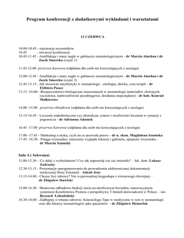 Program konferencji z dodatkowymi wykładami i warsztatami 12 CZERWCA 10.00-10.45 - rejestracja uczestników 10.45 - otwarcie konferencji 10.45-11.45 - Anafilaksja i stany nagłe w gabinecie stomatologicznym - dr Marcin Aluchna i dr Jacek Smereka (część 1) 11.45-12.00 przerwa kawowa (odpłatna dla osób nie korzystających z noclegu) 12.00-12.45 - Anafilaksja i stany nagłe w gabinecie stomatologicznym - dr Marcin Aluchna i dr Jacek Smereka (część 2) 12.45-13.15 - Jak stosować antybiotyki w stomatologii - etiologia, dawka, czas terapii - dr Elżbieta Puacz 13.15 -14.00 - Bezpieczeństwo biologiczne stosowanych w stomatologii materiałów złożonych (uczulenia, nadwrażliwość pozabiegowa, działania niepożądane) - dr hab. Konrad Małkiewicz 14.00 -15.00 przerwa obiadowa (odpłatna dla osób nie korzystających z noclegu) 15.15-16.45 - Leczenie endodontyczne czy ekstrakcja, szanse i możliwości leczenia w sytuacji z pogranicza - dr Adrianna Adamek 16.45 -17.00 przerwa kawowa (odpłatna dla osób nie korzystających z noclegu) 17.00 -17.45 - Marketing a etyka, czyli na co pozwala prawo - dr n. ekon. Magdalena Szumska 17.45 -18.30 - Potęga wizerunku: znaczenie wyglądu lekarza i gabinetu, spójność wizerunku dr Marcin Szumski Sala A ( Sekwana) 11.00-12.30 – Co dalej z wybielaniem? Czy tak naprawdę coś się zmieniło? – lek. dent. Łukasz Zadrożny 12.30-13.15 - Prezentacja oprogramowania do prowadzenia elektronicznej dokumentacji medycznej firmy Estomed – Jakub Jenc 13.15-14.00 - Chcesz być zdrowy? Nie wyprowadzaj kręgosłupa z równowagi chwiejnej – dr Zbigniew Stawicki 15.00-16.30 - Skuteczna odbudowa funkcji żucia na atroficznym bezzębiu, innowacyjnym systemem Komfortowa Proteza z perspektywy 5 letnich doświadczeń w Polsce – inż. Ryszard Łobodziński 16.30-18.00 - Zadbajmy o własne zdrowie. Kinesiologu Tape w medycynie w tym w stomatologii oraz dla lekarzy stomatologów jako pacjentów – dr Zbigniew Hemerlak Sala (Dunajec) warsztaty 15.00-16.00 i 16.30-17.30 - nieodpłatne z prowadzenia dokumentacji medycznej w wersji elektronicznej przy użyciu oprogramowania firmy Estomed. 18.00 -19.00 - odpłatne, zapisy – Małgorzata Rajca, tel.22-54-28-308 oraz na stronie firmy Dental S: „Ćwiczenia stabilizacyjne dla lekarzy stomatologów z wykorzystaniem piłek gimnastycznych” Sala B (Morskie Oko) 11.30-13.00 – Profilaktyka stomatologiczna u pacjentów onkologicznych. Rola testów przesiewowych w badaniu stomatologicznym – dr Katarzyna Brus-Sawczyk 13.00-14.00 - Elementy ortodoncji w praktyce lekarza stomatologa – dr hab. Małgorzata Zadurska 15.00-15.40 - Aktualny stan wiedzy z zakresu profilaktyki fluorkowej – Adrian Mortel 15.40-16.00 - Informacje na temat bezpiecznych i ryzykownych inwestycji kapitałowych np. jak zarabiać 12-15% rocznie powierzając zarządzaniem specjalistom – Money Coaching Andrzej Spuła 16.15- 18.00 - ABC diagnostyki i terapii stawów skroniowo-żuchwowych oraz zwarcia – praktyczne wskazówki w codziennej praktyce stomatologicznej – dr Jan Dethloff 20.30. uroczysta kolacja (niespodzianka wieczoru nr 1) 13 CZERWCA 9.00 -9.45 - Żywienie a zdrowie jamy ustnej pacjentów w wieku rozwojowym - prof. dr hab. Dorota Olczak-Kowalczyk 10.00 – 11.00 - Okluzja statyczna i dynamiczna w leczeniu stomatologicznym - dr Andrzej Bożyk 11.00 -11.15 przerwa kawowa (odpłatna dla osób nie korzystających z noclegu) 11.15 - 12.00 - Współczesna trendy w leczeniu próchnicy ubytkowej - dr hab. Agnieszka Mielczarek 12.00 -12.30 - Wykonywanie procedur minimalnie inwazyjnych w korekcie estetyki uzębienia – lek. dent. Karolina Kowalczyk 12.30 -12.45 przerwa kawowa (odpłatna dla osób nie korzystających z noclegu) 12.45 -13.30 - Trzeci wymiar w chirurgii stomatologicznej i implantologii - możliwości rozwiązywania problemów diagnostycznych w trudnych przypadkach klinicznych dr hab. Rafał Koszowski 13.30 -14.00 - Zabiegi kriochirurgiczne w schorzeniach jamy ustnej - dr Jadwiga Waskowska 14.00 -15.00 przerwa obiadowa (odpłatna dla osób nie korzystających z noclegu) 15.15 -16.15 - Zadbajmy o własne zdrowie. Kinesiology Tape w medycynie, w tym w stomatologii oraz dla lekarzy stomatologów jako pacjentów - dr Zbigniew Hamerlak 16.15 -16.30 przerwa kawowa (odpłatna dla osób nie korzystających z noclegu) 16.30 -18.00 - Prawo medyczne – personel medyczny działający w zespole - praktyczne aspekty odpowiedzialności prawnej - mec. Paweł Strzelec Sala (Dunajec) warsztaty 9.15-10.00 - Dokumentacja medyczna w formie elektronicznej – jak sprawnie poprowadzić dokumentację medyczną w wersji elektronicznej – ćwiczenia praktyczne – Estomed 10.30-12.30 - z endodoncji – dr. Adrianna Adamek wypełnienie kanału metodą kondensacji bocznej gutaperki z wykorzystaniem ćwieków standardowych o zwiększonej rozszerzalności wypełnienie kanału gutaperką na ciepło – wykorzystanie E&Q Master Zastosowanie preparatu EndoCem MTA w praktyce – metody własne i rady jak pracować z MTA - sposoby zarabiania i aplikacji cementu (krótki materiał filmowy) - triki ułatwiające szybkie opanowanie technik pracy - aplikacja materialu EndoCem MTA na perforację w dnie komory 13.00-14.00 - z marketingu „Najnowsze trendy w budowaniu przekazu przez Internet: strony internetowe, logo, Facebook oraz YouTube w medycynie”- mgr Marcin Szumowski 15.00-16.00 - z marketingu „Profesjonalne umawianie pacjentów na wizyty – lekarz sam w gabinecie stomatologicznym” – warsztat dla lekarzy dentystów indywidualnie prowadzących praktyki lekarskie – dr Magda Szumowska Sala (Sekwana ) 10.00-14.00 - posiedzenie Komisji Stomatologicznej Naczelnej Rady Lekarskiej 15.00-18.00 - podstawy chirurgiczno-implantologiczne do zastosowania w każdym gabinecie – prelekcja oraz warsztat praktyczny z wykorzystaniem fibryny bogatopłytkowej (PRF), laseru stomatologicznego, fizjodyspenserów oraz implantacji w świńskie szczęki – lek. dent. Maciej M