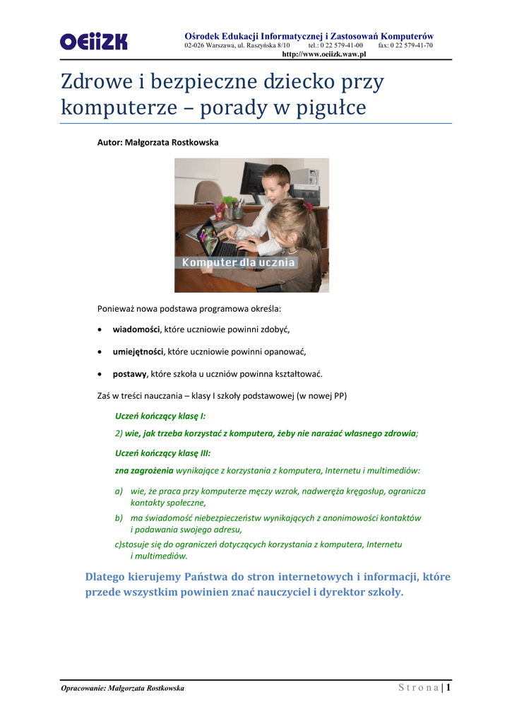 Ośrodek Edukacji Informatycznej i Zastosowań Komputerów 02-026 Warszawa, ul. Raszyńska 8/10 tel.: 0 22 579-41-00 fax: 0 22 579-41-70 http://www.oeiizk.waw.pl Zdrowe i bezpieczne dziecko przy komputerze – porady w pigułce Autor: Małgorzata Rostkowska Ponieważ nowa podstawa programowa określa: wiadomości, które uczniowie powinni zdobyd, umiejętności, które uczniowie powinni opanowad, postawy, które szkoła u uczniów powinna kształtowad. Zaś w treści nauczania – klasy I szkoły podstawowej (w nowej PP) Uczeo kooczący klasę I: 2) wie, jak trzeba korzystad z komputera, żeby nie narażad własnego zdrowia; Uczeo kooczący klasę III: zna zagrożenia wynikające z korzystania z komputera, Internetu i multimediów: a) wie, że praca przy komputerze męczy wzrok, nadweręża kręgosłup, ogranicza kontakty społeczne, b) ma świadomośd niebezpieczeostw wynikających z anonimowości kontaktów i podawania swojego adresu, c)stosuje się do ograniczeo dotyczących korzystania z komputera, Internetu i multimediów. Dlatego kierujemy Państwa do stron internetowych i informacji, które przede wszystkim powinien znać nauczyciel i dyrektor szkoły. Opracowanie: Małgorzata Rostkowska Strona|1 Ośrodek Edukacji Informatycznej i Zastosowań Komputerów 02-026 Warszawa, ul. Raszyńska 8/10 tel.: 0 22 579-41-00 fax: 0 22 579-41-70 http://www.oeiizk.waw.pl 1. Zarządzenia http://bip.men.gov.pl odnośnik Akty prawne – http://www.reformaprogramowa.men.gov.pl między innymi dokumenty rządowe, jak np. opracowywany pod patronatem Minister Elżbiety Radziszewskiej, Pełnomocnika Rządu ds. Równego Traktowania pod nazwą "Porozumieniem na rzecz bezpieczeostwa dzieci w Internecie". Podpisanie porozumienia planowane jest na połowę czerwca. 2. Przepisy BHP – http://www.bezpiecznaszkola.edu.pl Zalecana szczególna dbałośd o higienę pracy przejawiająca się: zabezpieczeniem systemu komputerowego przed wirusami, niepożądanymi stronami; stała możliwośd odczytania co dziecko robi i jakie strony odwiedza, dbałośd o aktualizację programów antywirusowych i zabezpieczających, przygotowaniem regulaminu korzystania z komputera, pracowni i zapoznanie z nim wszystkich dzieci, ustawienie komputera lub komputerów w klasie w takim miejscu, żeby nauczyciel zawsze widział, co dziecko ma na swoim monitorze, sprawdzenie, czy nie ma odblasków światła na ekranie, zakupienie rolet, zadbanie o właściwe oświetlenie, zadbanie o stanowisko/stanowiska komputerowe tak, aby każde dziecko mogło mied oparte nogi o podłogę lub był do dyspozycji podnóżek, na którym postawi nóżki, sprawdzanie, czy dziecko wygodnie siedzi, czy jest wyprostowane na krześle (co jakiś czas zwracanie uwagi, gdy się skrzywi, siedzi nieprawidłowo) – uczenie prawidłowej postawy, sprawdzanie, czy na biurku nie ma ostrych krawędzi, o które dziecko mogłoby opierad dłonie i czy ma oparte ręce na biurku wraz z łokciami, dopasowywanie nachylenia monitora, aby dziecko nie zadzierało głowy, zakupienie małej myszki, mieszczącej się w dłoni dziecka, rozejrzenie się wokół stanowiska komputerowego, czy dziecko zaaferowane tym co robi, niczego nie strąci, nic nie spadnie na nie, o nic nie zahaczy, czy nie kłębią się gdzieś kable, lub wystają niezabezpieczone kontakty, polecenie dziecku co jakiś czas pomrugad powiekami i spojrzed poza ekran, uczenie relaksu i wymuszanie na dziecku określonego okresu pracy/zabawy przy komputerze (im młodsze dziecko tym czas krótszy, np. 15 min, nie dłużej niż godzinę lekcyjną dla dziecka w III klasie). 3. Zagrożenia – znad, rozumied i przeciwdziaład tym, które czyhają na dzieci uczące się i/lub bawiące za pomocą komputera w sieci. nauczyd się pracowad ze świadomością, że sied niesie ze sobą niebezpieczeostwa, że przestępcy przenieśli swoje działania do Internetu, Opracowanie: Małgorzata Rostkowska Strona|2 Ośrodek Edukacji Informatycznej i Zastosowań Komputerów 02-026 Warszawa, ul. Raszyńska 8/10 tel.: 0 22 579-41-00 fax: 0 22 579-41-70 http://www.oeiizk.waw.pl wiedzied że gry i serwowanie po Internecie mogą grozid uzależnieniem się od nich, mied świadomośd, że dziecko może celowo lub przypadkiem trafid na strony z groźnymi zawartościami (pornografia, pedofilia, sekty.. nie należy liczyd na instytucjonalne zabezpieczenie przed szkodliwymi treściami w Internecie), rozumied, że anonimowośd w sieci może prowadzid do zachowao nieetycznych, wiedzied na czym polega szok informacyjny. W związku z tymi zagrożeniami należy szczególnie dbad o to, aby: nie zostawiad dziecka pracującego, bawiącego się bez nadzoru opiekuna, nauczyciela; przyzwyczajad dzieci, że wszystko co wykonują za pomocą komputera odbywa się pod kontrolą osoby dorosłej – w szkole tą osobą jest nauczyciel, koniecznie przeprowadzid lekcje dotyczącą bezpieczeostwa w Internecie i co jakiś czas do tego powracad, zapewnid dostęp do encyklopedii i wartościowych programów edukacyjnych, często mających formę gry, życzliwie rozmawiad na wszystkie tematy, które dziecko zainteresują, zaniepokoją lub poruszą, zawsze sprawdzad (nauczyciele) wszystkie programy zanim da się je dziecku do pracy, zabawy; nawet te z rekomendacjami, czasem maja błędy, wymagad od producentów oprogramowania zabezpieczeo przed tymi treściami i sytuacjami w sieci, które uważamy za szkodliwe dla naszych dzieci zawsze pamiętad, że dziecko przy komputerze to nie jest dziecko, które ma się na jakiś czas „z głowy”, tylko właśnie na nie trzeba szczególnie zwracad swoją uwagę zawsze pamiętad, że przy komputerze ważne jest dziecko, a nie komputer, który jest tylko narzędziem jego pracy lub zabawy, koniecznie nauczyd dzieci i młodzież korzystad z komputera jako narzędzia, przekazad im właściwe odniesienie do maszyny, gdyż inaczej zuboży się ich psychikę i nie rozwinie możliwości intelektualnych! dziecko pracujące przy komputerze przeszł