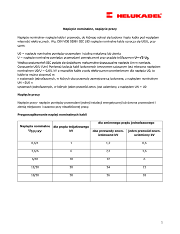 Napięcie nominalne, napięcie pracy Napięcie nominalne- napięcie kabla i przewodu, do którego odnosi się budowa i testy kabla pod względem własności elektrycznych. Wg. DIN VDE 0298 i IEC 183 napięcie nominalne kabla oznacza się U0/U, przy czym: U0 = napięcie nominalne pomiędzy przewodem i otuliną metalową lub ziemią U = napięcie nominalne pomiędzy przewodami zewnętrznymi przy prądzie trójfazowym U=√3 U0 Według postanowień IEC podaje się dodatkowo maksymalne dopuszczalne napięcie Um w nawiasie. Oznaczenie U0/U (Um) PoniewaŜ izolacja kabli izolowanych tworzywem sztucznym jest mierzona napięciem nominalnym U0/U = 0,6/1 kV a wszystkie kable o polu elektrycznym promieniowym dla napięcia U0, to kable te moŜna stosować w: n systemach jednofazowych, w których oba przewody zewnętrzne są izolowane, z napięciem nominalnym UN =2U0 n systemach jednofazowych, w których jeden przewód zewn. jest uziemiony, z napięciem UN = U0 Napięcie pracy Napięcie pracy- napięcie pomiędzy przewodami jednej instalacji energetycznej lub dwoma przewodami i ziemią miejscowo i czasowo przy niezakłóconej pracy. Przyporządkowanie napięć nominalnych kabli dla zmiennego prądu jednofazowego Napięcia nominalne U0/U KV dla prądu trójafzowego kV 0,6/1 oba przewody zewn. izolowane kV jeden przewód zewn. uziemiony kV 1 1,2 0,6 3,6/6 6 7,2 3,6 6/10 10 12 6 12/20 20 24 12 18/30 30 36 18 1 Przyporządkowanie najwyŜszych dopuszczalnych napięć pracy Napięcia nominalne U0/U kV NajwyŜsze napięcie dla prądu trójfazowego kV 0,6/1 NajwyŜsze napięcie dla zmiennego prądu jednofazowego oba przewody zewn. izolowane kV jeden przewód zewn. uziemiony kV 1,2 1,4 0,7 3,6/6 7,2 8,3 4,1 6/10 12 14 7 12/20 24 28 14 18/30 36 42 21 Wskazówka: Dla systemów prądu stałego mogą być stosowane kable z U0/U 0,6/1 kV, których najwyŜsze napięcia pracy nie przekraczają przewód/ przewód 1,8 kV lub przewód/ ziemia 1,8 kV. 2