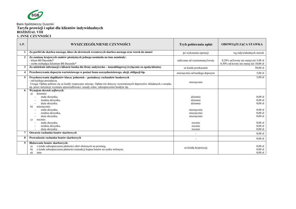 Taryfa prowizji i opłat dla klientów indywidualnych ROZDZIAŁ VIII 1. INNE CZYNNOŚCI L.P. WYSZCZEGÓLNIENIE CZYNNOŚCI 1 Za portfel do skarbca nocnego, klucz do drzwiczek wrzutowych skarbca nocnego oraz worek do monet 2 3 Za zamianę krajowych znaków pieniężnych jednego nominału na inne nominały: - klient BS Duszniki* - osoba niebędąca klientem BS Duszniki* Za udzielenie informacji o kliencie banku dla firmy audytorsko – konsultingowej (wyłącznie za zgodą klienta). 4 Przechowywanie depozytu wartościowego w postaci bonu oszczędnościowego, akcji, obligacji itp. 5 7 Przechowywanie duplikatów kluczy jednostek – posiadaczy rachunków bankowych - od każdego posiadacza. Uwaga: Opłatę pobiera się za każdy rozpoczęty miesiąc. Opłata nie dotyczy wymienionych depozytów składanych z urzędu, np. przez instytucje wymiaru sprawiedliwości, urzędy celne, zabezpieczenie kredytu itp. Wynajem skrytek sejfowych: a) dziennie: mała skrzynka, średnia skrzynka, duża skrzynka, b) miesięcznie: mała skrzynka, średnia skrzynka, duża skrzynka, c) rocznie: mała skrzynka, średnia skrzynka, duża skrzynka. Otwarcie rachunku bonów skarbowych 8 Prowadzenie rachunku bonów skarbowych 9 Blokowanie bonów skarbowych: a) z tytułu zabezpieczenia płatności ofert złożonych na przetarg, b) z tytułu zabezpieczenia płatności transakcji kupna bonów na rynku wtórnym, c) inne 6 Tryb pobierania opłat po wykonaniu operacji naliczana od wymienianej kwoty OBOWIĄZUJĄCA STAWKA wg indywidualnych stawek 0,20% od kwoty nie mniej niż 5,00 zł 0,50% od kwoty nie mniej niż 10,00 zł za każde przekazanie 50,00 zł miesięcznie od każdego depozytu 5,00 zł 5,00 zł miesięcznie dziennie dziennie dziennie 0,00 zł 0,00 zł 0,00 zł miesięcznie miesięcznie miesięcznie 0,00 zł 0,00 zł 0,00 zł rocznie rocznie rocznie 0,00 zł 0,00 zł 0,00 zł - 0,00 zł - 0,00 zł za każdą dyspozycję 0,00 zł 0,00 zł 0,00 zł L.P. 10 11 12 13 14 15 16 17 18 19 WYSZCZEGÓLNIENIE CZYNNOŚCI Wystawienie potwierdzenia stanu posiadania bonów skarbowych: a) po dokonaniu transakcji b) dodatkowo na żądanie klienta Przechowywanie bonów skarbowych. Zakup bonów skarbowych na rynku wtórnym: a) prowizja zależna od wartości oferty a) transakcja niezrealizowana. Rynek wtórny kupno / sprzedaż: a) opłata za rejestrację transakcji ( jeśli stroną transakcji nie jest BS) b) opłata za rejestrację transakcji ( jeśli stroną jest BS ) c) transakcja niezrealizowana. Odkup bonów skarbowych przez Emitenta: a) transakcja zrealizowana b) transakcja niezrealizowana. Wykup bonów skarbowych. Transfer bonów skarbowych: a) z BS na konto innego uczestnika CRBS, b) do BS z konta innego uczestnika CRBS. Za przygotowanie, sporządzenie i przekazanie informacji stanowiących tajemnicę bankową uprawnionym przez Ustawę Prawo bankowe osobom, organom i instytucjom, z zastrzeżeniem czynności o których mowa w poz. 18 niniejszego rozdziału Uwaga: Opłaty nie pobiera się w przypadku wystąpienia żądania udzielenia informacji na rzecz podmiotów lub organów wyszczególnionych w art.110 Ustawy Prawo bankowe. Za sporządzenie informacji zbiorczej na wniosek osoby fizycznej oraz osób, które uzyskały tytuł prawny do spadku po posiadaczu rachunku, w tym nabywców spadku, w rozumieniu art. 1052 k.c., gminom oraz podmiotom, o których mowa w art. 105 ust. 1 pkt 2 lit. a-h, k-ł, p, s, t oraz v ustawy Prawo bankowe o zasadach świadczenia usługi poszukiwań rachunków poprzez Centralną informację. Uwaga! Opłat nie pobiera się od podmiotów, które są zwolnione z obowiązku uiszczania opłat z tytułu przekazania informacji objętych tajemnicą bankową na podstawie art. 110 Prawa bankowego. Przesłanie informacji zbiorczej przesyłką pocztową na wniosek klienta. TRYB POBIERANIA OPŁATY za każde potwierdzenie 0,00 zł 0,00 zł - 0,00 zł za każdą transakcję 0,00 zł 0,00 zł za każdą transakcję Za zastrzeżenie: a) dokumentu tożsamości klienta BS Duszniki* b) dokumentu tożsamości osoby nie będącej klientem BS Duszniki* * Klient BS Duszniki to osoba fizyczna, która posiada w BS Duszniki rachunek bankowy lub kredyt. 0,00 zł 0,00 zł 0,00 zł za każdą transakcję 0,00 zł 0,00 zł - 0,00 zł za każdą dyspozycję 0,00 zł 0,00 zł za każde przekazanie 100,00 zł za każdą zbiorczą informację 15,00 zł za każdą przesyłkę 20 OBOWIĄZUJĄCA STAWKA za każde zastrzeżenie 6,20 zł (koszt listu poleconego za potwierdzeniem odbioru wg Cennika Usług Pocztowych Poczta Polska S.A.) 10,00 zł 20,00 zł